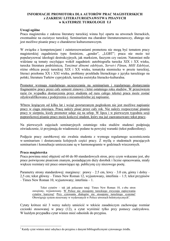 INFORMACJE PROMOTORA DLA AUTORÓW PRAC MAGISTERSKICH z ZAKRESU LITERATUROZNAWSTWA PISANYCH w KATEDRZE TURKOLOGII UJ Uwagi ogólne Praca magisterska z zakresu literatury tureckiej winna być oparta na utworach literackich, ewentualnie na eseistyce tureckiej. Seminarium ma charakter literaturoznawczy, dlatego nie jest możliwe pisanie pracy o charakterze kulturoznawczym. W związku z kompetencjami i zainteresowaniami promotora nie mogą być tematem pracy magisterskiej zagadnienia typu feminizm, „gender”, „LGBT”; praca nie może też popularyzować ideologii destrukcyjnych, jak marksizm, faszyzm czy rasizm. Natomiast mile widziane są tematy oscylujące wokół zagadnień: autobiografia turecka XIX i XX wieku, turecka literatura podróżnicza, Tanzimat dönemi edebiyatı, Servet-i Fünun, Millî Edebiyat, różne oblicza poezji tureckiej XIX i XX wieku, tematyka niemiecka w prozie tureckiej, literaci przełomu XX i XXI wieku, problemy przekładu literackiego z języka tureckiego na polski, literatura Turków cypryjskich, turecka eseistyka literacko-kulturalna. Promotor wymaga regularnego uczęszczania na seminarium i regularnego dostarczania fragmentów pracy przez cały semestr zimowy i letni ostatniego roku studiów. W przeciwnym razie (w wypadku dostarczenia przez studenta od razu całego tekstu) praca może zostać zdyskwalifikowana z podejrzenia o niesamodzielne jej napisanie. Wbrew krążącym od kilku lat i wciąż powtarzanym pogłoskom nie jest możliwe napisanie pracy w ciągu miesiąca. Pracę należy pisać przez cały rok. Nie należy rozpoczynać pisania pracy w sierpniu, kiedy promotor udaje się na urlop. W lipcu i w pierwszym tygodniu sesji poprawkowej pisanie pracy może kończyć student, który ma już zaawansowany tekst pracy. Na pierwszych zajęciach seminaryjnych ostatniego roku studiów studenci podpisują oświadczenie, iż przyjmują do wiadomości podane tu powyżej warunki (tekst podkreślony). Podjęcie pracy zarobkowej nie zwalnia studenta z wymogu regularnego uczestniczenia w seminarium i dostarczania kolejnych części pracy. Z myślą o studentach pracujących seminarium i konsultacje umieszczane są w harmonogramie w godzinach wieczornych. Praca magisterska Praca powinna mieć objętość od 60 do 80 standardowych stron, przy czym wskazane jest, aby prace poświęcone pisarzom znanym, posiadającym duży dorobek i liczne opracowania, miały większe rozmiary niż prace omawiające np. publicystę czy niszowego poetę. Parametry strony standardowej: marginesy: prawy – 2.5 cm, lewy – 3.0 cm, górny i dolny – 2,5 cm; tekst główny – Times New Roman 12, wyjustowany, interlinia – 1.5; tekst przypisów – Times New Roman 10, wyjustowany; interlinia – 1. Tekst cytatów – tak jak pokazano tutaj: Times New Roman 10, z obu stron zawężony, wyjustowany. W Polsce nie stosujemy tureckiego zwyczaju zapisywania cytatów kursywą! Przy cytowaniu dialogów nie stosujemy tureckiego systemu! Obowiązuje system stosowany w wydawanych w Polsce utworach beletrystycznych1. Cytaty krótsze niż 3 wersy należy umieścić w tekście zasadniczym zachowując rozmiar czcionki stosowanej w pracy (12), a cytat wyróżnić tylko przy pomocy cudzysłowu. W każdym przypadku cytat winien mieć odnośnik do przypisu. 1 Każdy cytat winien mieć odsyłacz do przypisu z danymi bibliograficznymi cytowanego źródła. Przykład cytatu krótkiego: Namık Kemal, który w swym manifeście poetyckim napisał, że „poezja ma być trybuną a poeta trybunem”, realizował tę myśl przez całe swoje dorosłe życie. W przypisach bibliograficznych należy konsekwentnie stosować jeden system zapisu (sugeruje się system klasyczny, podany poniżej, ale dopuszcza się inne). Taki sam system jak w przypisach, winien być przyjęty dla umieszczonej na końcu pracy bibliografii. Przy cytowaniu źródła „z drugiej ręki” należy zastosować skrót [cyt. za:]. Przykłady w Aneksie. Należy stosować przypisy dolne, nie końcowe, z numeracją ciągłą (od pierwszej do ostatniej strony). Wszystkie przypisy (bibliograficzne, objaśniające, dygresyjne) zaczynamy z wielkiej litery i kończymy kropką. Tytuły rozdziałów powinny mieć wyróżniającą się czcionkę (nieco większy rozmiar liter, bold), ale niedopuszczalne jest pisanie wielkimi literami. Jeśli w pracy znajdują się także podrozdziały, rozmiar czcionki zastosowanej do tytułów rozdziałów i podrozdziałów powinien wyrażać zachodzącą między nimi podległość (mniejsza i większa czcionka). Po tytule pracy i po tytułach rozdziałów nie stawia się kropki. Każdy nowy akapit winien zaczynać się od „wcięcia”. Wcięcia należy robić wyłącznie przy użyciu tabulatora. Niedopuszczalne jest stosowanie wielu spacji celem zrobienia wcięcia w tekście! Przechodzenie do nowej strony należy robić wyłącznie przy użyciu opcji „wstaw podział strony”; niedopuszczalne jest stosowanie więcej niż jednego „enteru” jeden po drugim celem przeniesienia kursora na nową stronę! W razie potrzeby umieszczenia fragmentu tekstu na środku strony (np. tytuł rozdziału, podpis pod ilustracją itp.) należy skorzystać z polecenia „wyśrodkowanie tekstu”. Niedopuszczalne jest wielokrotne przyciskanie klawisza spacji! Krótkie, jednoliterowe spójniki znajdujące się na końcu wersów, w końcowej wersji pracy należy przenieść do następnej linii przy pomocy tzw. „twardej spacji” (shift + ctrl + spacja). Zabieg ten wykonujemy dopiero na końcu, po wykonaniu wszystkich czynności edytorskich. Kursywę stosuje się wyłącznie dla tytułów utworów literackich oraz dla wyróżnienia w tekście wtrąconych słów obcych (np. mieszkańcy gecekondu byli…). Tytuły czasopism zapisujemy czcionką prostą, w cudzysłowie. Jeśli zachodzi konieczność podania znaczenia słowa lub terminu, podajemy go w pojedynczym ‘cudzysłowie’ (apostrof). Należy pamiętać o różnicy między cudzysłowe