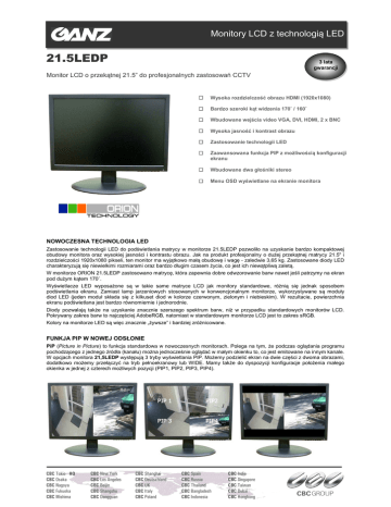 Monitory LCD z technologią LED 21.5LEDP 3 lata gwarancji Monitor LCD o przekątnej 21.5” do profesjonalnych zastosowań CCTV Wysoka rozdzielczość obrazu HDMI (1920x1080) Bardzo szeroki kąt widzenia 170˚ / 160˚ Wbudowane wejścia video VGA, DVI, HDMI, 2 x BNC Wysoka jasność i kontrast obrazu Zastosowanie technologii LED Zaawansowana funkcja PIP z możliwością konfiguracji ekranu Wbudowane dwa głośniki stereo Menu OSD wyświetlane na ekranie monitora NOWOCZESNA TECHNOLOGIA LED Zastosowanie technologii LED do podświetlania matrycy w monitorze 21.5LEDP pozwoliło na uzyskanie bardzo kompaktowej obudowy monitora oraz wysokiej jasności i kontrastu obrazu. Jak na produkt profesjonalny o dużej przekątnej matrycy 21.5" i rozdzielczości 1920x1080 pikseli, ten monitor ma wyjątkowo małą obudowę i wagę - zaledwie 3,65 kg. Zastosowane diody LED charakteryzują się niewielkimi rozmiarami oraz bardzo długim czasem życia, co jest ich niewątpliwą zaletą. W monitorze ORION 21.5LEDP zastosowano matrycę, która zapewnia dobre odwzorowanie barw nawet jeśli patrzymy na ekran pod dużym kątem 170˚. Wyświetlacze LED wyposażone są w takie same matryce LCD jak monitory standardowe, różnią się jednak sposobem podświetlania ekranu. Zamiast lamp jarzeniowych stosowanych w konwencjonalnym monitorze, wykorzystywane są moduły diod LED (jeden moduł składa się z kilkuset diod w kolorze czerwonym, zielonym i niebieskim). W rezultacie, powierzchnia ekranu podświetlana jest bardzo równomiernie i jednorodnie. Diody pozwalają także na uzyskanie znacznie szerszego spektrum barw, niż w przypadku standardowych monitorów LCD. Pokrywany zakres barw to najczęściej AdobeRGB, natomiast w standardowym monitorze LCD jest to zakres sRGB. Kolory na monitorze LED są więc znacznie „żywsze” i bardziej zróżnicowane. FUNKJA PIP W NOWEJ ODSŁONIE PiP (Picture in Picture) to funkcja standardowa w nowoczesnych monitorach. Polega na tym, że podczas oglądania programu pochodzącego z jednego źródła (kanału) można jednocześnie oglądać w małym okienku to, co jest emitowane na innym kanale. W opcjach monitora 21,5LEDP występują 3 tryby wyświetlania PIP. Możemy podzielić ekran na dwie części z dwoma obrazami, dodatkowo możemy przełączyć na tryb pełnoekranowy lub WIDE. Mamy także do dyspozycji konfiguracje położenia małego okienka w jednej z czterech możliwych pozycji (PIP1, PIP2, PIP3, PIP4). CBC Tokio HQ CBC Osaka CBC Nagoya CBC Fukuoka CBC Mishima CBC New York CBC Los Angeles CBC Beijin CBC Shangshu CBC Dongguan CBC Shanghai CBC Deutschland CBC UK CBC Italy CBC Poland CBC Spain CBC Russia CBC Thailand CBC Bangladesh CBC Indonesia CBC India CBC Singapore CBC Taiwan CBC Dubai CBC Hongkong Monitory LCD z technologią LED Wymiary monitora PARAMETRY TECHNICZNE Model: 21.5LEDP System video: PAL / NTSC / Auto Matryca: 21.5” TFT LCD Rozdzielczość: 1920 x 1080 @ 60Hz Współczynnik kontrastu: 1000:1 250cd/m² Jasność: Czas reakcji (Tr/Tf): 5ms Ilość kolorów: 16.7 miliona Kąt widzenia: 170° poziomo / 160° pionowo Min. czas życia matrycy: 30.000 godzin Tryby wyświetlania: Video / VGA / DVI / HDMI PIP: Menu OSD 3 Tryby wyświetlania VGA: Jasność, Kontrast, Pozycja poziom / pion, Zegar, Faza, Temperatura barwowa, Kolor użytkownika R / G / B, Pozycja OSD poziom / pion, Głośność, Język, Powrót. Video: Kolor, Jasność, Kontrast, Ostrość, Głośność, Język Wejścia video: 2 x Video BNC (1.0 Vp-p 75Ω), VGA 15pin, Audio, DVI ,HDMI Wyjścia video: 1 x Video BNC (1.0 Vp-p 75Ω), Audio Głośnik: 2 x 2W Filtr 3D „comb”: NTSC / PAL Warunki pracy: Temperatura: 0° - 40°C / Wilgotność: 10% - 85% Wymiary: 514.5 x 370.0 x 182 mm Waga: 3.65 kg ( sam monitor ) Bezpieczeństwo: FCC, CE (EMC/LVD), UL, BSMI, CCC Zasilanie: 110 / 240VAC Pobór mocy: CBC Tokio HQ CBC Osaka CBC Nagoya CBC Fukuoka CBC Mishima 21W CBC New York CBC Los Angeles CBC Beijin CBC Shangshu CBC Dongguan CBC Shanghai CBC Deutschland CBC UK CBC Italy CBC Poland CBC Spain CBC Russia CBC Thailand CBC Bangladesh CBC Indonesia CBC India CBC Singapore CBC Taiwan CBC Dubai CBC Hongkong