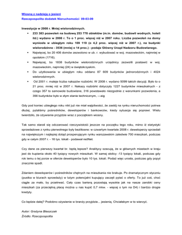Wiosną z nadzieją o jesieni Rzeczpospolita dodatek Nieruchomości 09-03-09 Inwestycje w 2008 r. Mniej wielorodzinnych. 233 383 pozwoleń na budową 253 778 obiektów (m.in. domów, budowli wodnych, hoteli itd.) wydano w 2008 r. To o 1 proc. więcej niŜ w 2007 roku. Liczba pozwoleń na domy wyniosła w ubiegłym roku 109 119 (o 4,2 proc. więcej niŜ w 2007 r.), na budynki wielorodzinne - 3536 (mniej o 14 proc.) - podaje Główny Urząd Nadzoru Budowlanego. Najwięcej, bo 20 406 domów zezwolono w ub. r. wybudować w woj. mazowieckim, najmniej w opolskim (1716). Najwięcej, bo 1838 budynków wielorodzinnych urzędnicy zezwolili postawić w woj. mazowieckim, najmniej (24) w świętokrzyskim. Do uŜytkowania w ubiegłym roku oddano 87 609 budynków jednorodzinnych i 4024 wielorodzinnych. Od 2001 r. maleje liczba nakazów rozbiórki. W 2008 r. wydano 5099 takich decyzji. Było to o 21 proc. mniej niŜ w 2007 r. Nakazy rozbiórki dotyczyły 1227 budynków mieszkalnych - z czego 357 to samowole budowlane, 316 powstawało niezgodnie z warunkami pozwolenia, a 356 budynków było w złym stanie technicznym, —aig Gdy pod koniec ubiegłego roku nikt juŜ nie miał wątpliwości, Ŝe zastój na rynku nieruchomości potrwa dłuŜej, pytaliśmy pośredników, deweloperów i bankowców, kiedy sytuacja się poprawi. Wielu twierdziło, Ŝe oŜywienie przyjdzie wraz z początkiem wiosny. Tak samo starali się odczarować rzeczywistość jeszcze na początku tego roku, mimo iŜ statystyki sprzedaŜowe z rynku pierwotnego były bezlitosne: w czwartym kwartale 2008 r. deweloperzy sprzedali na największym i najlepiej dotąd prosperującym rynku warszawskim zaledwie 700 mieszkań, podczas gdy w całym 2007 r. - 16 tys. lokali - podawał redNet. Czy dane za pierwszy kwartał br. będą lepsze? Analitycy szacują, Ŝe w głównych miastach w kraju jest do kupienia około 40 tysięcy nowych mieszkań. W samej stolicy -13 tysięcy lokali, podczas gdy rok temu o tej porze w ofercie deweloperów było 10 tys. lokali. PodaŜ więc urosła, podczas gdy popyt znacznie spadł. Zdaniem deweloperów i pośredników chętnych na mieszkania nie brakuje. Po dramatycznym styczniu (pustka w biurach sprzedaŜy) w lutym potencjalni kupujący zaczęli pytać o oferty. To juŜ coś, choć ciągle za mało, by przetrwać. Cały czas barierą pozostają wysokie jak na nasze zarobki ceny mieszkań (za przeciętną płacę moŜna u nas kupić 0,7 mkw. - więcej o tym na D4) i bardzo drogie kredyty. Co będzie dalej? Podobno oŜywienie w branŜy przyjdzie... jesienią. Chciałabym w to wierzyć. Autor: GraŜyna Błaszczak Źródło: Rzeczpospolita