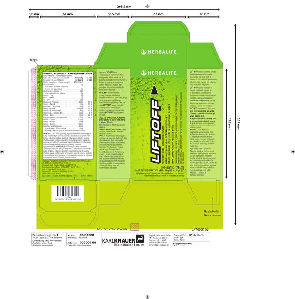 3152PL CUT3152PL.RO-03 SKU3152 LIFTOFF® este un supliment alimentar Musujący LIFTOFF® jest energetyzującym suplementem diety, który zawiera kofeinę oraz w 100 % pokrywa zapotrzebowanie na witaminę C, która przyczynia się do zmniejszenia uczucia zmęczenia i znużenia oraz pomaga w utrzymaniu prawidłowych funkcji psychologicznych. energizant efervescent ce conține cafeină, plus 100 % din VNR* de vitamina C, care contribuie la menținerea funcției mentale normale și la reducerea stării de oboseală și epuizare. ZALECANY SPOSÓB UŻYCIA: Rozpuść jedną tabletkę w 250 ml wody. Stosuj 1 tabletkę dziennie. Przechowywać w chłodnym, suchym miejscu. 30-dniowa gwarancja zwrotu pieniędzy. Produkty Herbalife są dostępne wyłącznie u Niezależnych Dystrybutorów Herbalife. UWAGA: Nie przekraczać zalecanej porcji do spożycia w ciągu dnia. Suplementy diety są uzupełnieniem diety i nie mogą być stosowane jako substytut zróżnicowanej i zbilansowanej diety oraz zdrowego trybu życia. Przechowywać w miejscu niedostępnym dla małych dzieci. Ten produkt zawiera ok. 75 mg kofeiny w porcji i nie jest rekomendowany dla dzieci, kobiet w ciąży i karmiących oraz osób wrażliwych na kofeinę. Nie zaleca się spożywania z alkoholem. Pojedyncze sztuki tego produktu nie są przeznaczone do sprzedaży ani nie mogą być wykorzystywane jako próbki. SMAK CYTRYNY • AROMĂ DE LĂMÂIE & LIME z grupy B (tiaminę, ryboflawinę, witaminę B6 oraz B12), które przyczyniają się do utrzymania prawidłowego metabolizmu energetycznego. Miej przy sobie LIFTOFF® zawsze i wszędzie. Ciesz się dwoma orzeźwiającymi smakami: pomarańczy i cytryny. Jedna tabletka LIFTOFF® dostarcza 41 kJ (10 kcal). niskokaloryczne musujące tabletki energetyzujące tablete energizante efervescente cu conţinut scăzut de calorii LIFTOFF® zawiera witaminy ZAWIERA KOFEINĘ. NIE ZALECA SIĘ STOSOWANIA U DZIECI I KOBIET W CIĄŻY (75 mg/tabletka). ZAWIERA SUBSTANCJE SŁODZĄCE CONȚINE CAFEINĂ. NU SE RECOMANDĂ PENTRU COPII SAU FEMEILE ÎNSĂRCINATE (75 mg/tabletă). CU ÎNDULCITORI. LIFTOFF® conține vitaminele B SUPLEMENT DIETY • SUPLIMENT ALIMENTAR Wartość odżywcza • Informaţii nutriţionale Porcja: 1 tabletka Mărimea porţiei: 1 tablet Liczba porcji w opakowaniu: 10 tabletek Na tabletkę % RWS* Nr. porţii într‐o cutie: 10 tablete Per tabletă % VNR* Wartość energetyczna • Valoare energetică . . . . 41 kJ (10 kcal) Tłuszcz • Grăsimi . . . . . . . . . . . . . . . . . . . . . . . . . . . . . . . . 0 g w tym: kwasy tłuszczowe nasycone • din care: acizi graşi saturaţi. . . . . . . . . . . . . . . . . . . . . . . 0 g Węglowodany • Glucide. . . . . . . . . . . . . . . . . . . . . . . . . . 0,4 g w tym: cukry • din care: zaharuri. . . . . . . . . . . . . . . . . . . 0 g Błonnik • Fibre. . . . . . . . . . . . . . . . . . . . . . . . . . . . . . . . . . 0 g Białko • Proteine . . . . . . . . . . . . . . . . . . . . . . . . . . . . . . . . 0 g Sól • Sare. . . . . . . . . . . . . . . . . . . . . . . . . . . . . . . . . . . . . 0,8 g Witamina C • Vitamina C. . . . . . . . . . . . . . . . . . . . . . . . 80 mg. . . . . . 100 % Tiamina • Tiamină . . . . . . . . . . . . . . . . . . . . . . . . . . . . 1,1 mg. . . . . . 100 % Ryboflawina • Riboflavină. . . . . . . . . . . . . . . . . . . . . . 1,4 mg. . . . . . 100 % Niacyna • Niacină . . . . . . . . . . . . . . . . . . . . . . . . . . 16 mg NE. . . . . . 100 % Witamina B6 • Vitamina B6. . . . . . . . . . . . . . . . . . . . . 1,4 mg. . . . . . 100 % Witamina B12 • Vitamina B12. . . . . . . . . . . . . . . . . . . . 1,0 μg. . . . . . . 40 % Biotyna • Biotină. . . . . . . . . . . . . . . . . . . . . . . . . . . . . . 50 µg. . . . . . 100 % Kwas pantotenowy • Acid pantotenic. . . . . . . . . . . . . . 6,0 mg. . . . . . 100 % Kofeina • Cafeină. . . . . . . . . . . . . . . . . . . . . . . . . . . . 70,5 mg Inozytol • Inositol. . . . . . . . . . . . . . . . . . . . . . . . . . . . . . 26 mg Tauryna • Taurină. . . . . . . . . . . . . . . . . . . . . . . . . . . . . 100 mg Guarana • Extract de guarana . . . . . . . . . . . . . . . . . . . . 45 mg w tym: kofeina • din care: cafeină . . . . . . . . . . . . . . 4,5 mg * Referencyjne wartości spożycia • Valorile nutriționale de referință SKŁADNIKI: Kwas (kwas cytrynowy), regulator kwasowości (wodorowęglan sodu), maltodekstryna, aromaty, tauryna, kwas askorbinowy, sproszkowana kofeina, substancje słodzące (acesulfam K, sukraloza), ekstrakt z guarany (Paullinia cupana Kunth), inozytol, amid kwasu nikotynowego, substancja wypełniająca (sorbitol), D-pantotenian wapnia, ryboflawiny 5’-fosforan sodu, chlorowodorek pirydoksyny, monoazotan tiaminy, D-biotyna, cyjanokobalamina. INGREDIENTE: acidifiant (acid citric), corector de aciditate (bicarbonat de sodiu), maltodextrină, aromă, taurină, acid ascorbic, pudră de cafeină, îndulcitori (acesulfam K, sucraloză), extract de guarana (Paullinia cupana Kunth), inositol, nicotinamidă, agent de încărcare (sorbitol), D-pantotenat de calciu, riboflavină-5’-fosfat de sodiu, clorhidrat de piridoxină, mononitrat de tiamină, D-biotină, cianocobalamină. Dystrybucja • Distribuitor: HERBALIFE INTERNATIONAL LUXEMBOURG S.à R.L. c/o HERBALIFE EUROPE LIMITED, The Atrium, 1 Harefield Road, Uxbridge, Middlesex UB8 1HB, U.K. Przedstawicielstwo w Polsce: HERBALIFE POLSKA SP. Z O.O. Janki, ul. Falencka 1b, 05-090 Raszyn Reprezentat în România de: HERBALIFE RO S.R.L., Strada Arhitect Louis Blanc nr. 1 etaj 7, sector 1, Bucureşti, România, cod poştal 011751 ©2015 HERBALIFE 10 TABLETEK | TABLETE MASA NETTO | GREUTATE NETĂ: 45 g (10 x 4,5 g) e Najlepiej spożyć przed / numer partii: Patrz spód kartonu | A se consuma, de preferinţă, înainte de şi număr lot: A se vedea pe ambalaj (tiamină, riboflavină, vitamina B6 și vitamina B12), ce contribuie la funcționarea normală a metabolismului ener