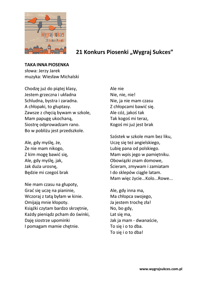 21 Konkurs Piosenki „Wygraj Sukces” TAKA INNA PIOSENKA słowa: Jerzy Jarek muzyka: Wiesław Michalski Chodzę już do piątej klasy, Jestem grzeczna i układna Schludna, bystra i zaradna. A chłopaki, to głuptasy. Zawsze z chęcią bywam w szkole, Mam papugę ukochaną, Siostrę odprowadzam rano. Bo w pobliżu jest przedszkole. Ale, gdy myślę, że, Że nie mam nikogo, Z kim mogę bawić się, Ale, gdy myślę, jak, Jak duża urosnę, Będzie mi czegoś brak Nie mam czasu na głupoty, Grać się uczę na pianinie, Wczoraj z tatą byłam w kinie. Omijają mnie kłopoty. Książki czytam bardzo skrzętnie, Każdy pieniądz pcham do świnki, Daję siostrze upominki I pomagam mamie chętnie. Ale nie Nie, nie, nie! Nie, ja nie mam czasu Z chłopcami bawić się. Ale cóż, jakoś tak Tak kogoś mi teraz, Kogoś mi już jest brak Szóstek w szkole mam bez liku, Uczę się też angielskiego, Lubię pana od polskiego. Mam wpis jego w pamiętniku. Obowiązki znam domowe, Ścieram, zmywam i zamiatam I do sklepów ciągle latam. Mam więc życie...Kolo...Rowe... Ale, gdy inna ma, Ma chłopca swojego, Ja jestem trochę zła! No, bo gdy, Lat się ma, Jak ja mam - dwanaście, To się i o to dba. To się i o to dba! www.wygrajsukces.com.pl