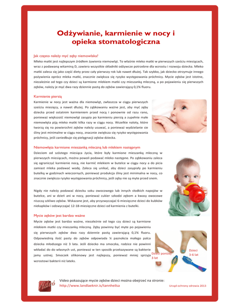 Odżywianie, karmienie w nocy i opieka stomatologiczna Jak często należy myć zęby niemowlaka? Mleko matki jest najlepszym źródłem żywienia niemowląt. To właśnie mleko matki w pierwszych sześciu miesiącach, wraz z podawaną witaminą D, zawiera wszystkie składniki odżywcze potrzebne dla wzrostu i rozwoju dziecka. Mleko matki zaleca się jako część diety przez cały pierwszy rok lub nawet dłużej. Tak szybko, jak dziecko otrzymuje innego pożywienia oprócz mleka matki, znacznie zwiększa się ryzyko występowania próchnicy. Mycie zębów jest istotne, niezależnie od tego czy dzieci są karmione mlekiem matki czy mieszanką mleczną, a po pojawieniu się pierwszych zębów, należy je myć dwa razy dziennie pastą do zębów zawierającą 0,1% fluoru. Karmienie piersią Karmienie w nocy jest ważna dla niemowląt, zwłaszcza w ciągu pierwszych sześciu miesięcy, a nawet dłużej. Po ząbkowaniu ważne jest, aby myć zęby dziecka przed ostatnim karmieniem przed nocą i ponownie od razu rano, ponieważ większość niemowląt zasypia po karmieniu piersią a zupełnie małe niemowlęta piją mleko matki kilka razy w ciągu nocy. Wszelkie naloty, które tworzą się na powierzchni zębów należy usuwać, a ponieważ wydzielanie sie śliny jest minimalne w ciągu nocy, znacznie zwiększa się ryzyko występowania próchnicy, jeśli zaniedbuje się pielęgnacji zębów dziecka. Niemowlęta karmione mieszanką mleczną lub mlekiem następnym Dzieciom od szóstego miesiąca życia, które były karmione mieszanką mleczną w pierwszych miesiącach, można powoli podawać mleko następne. Po ząbkowaniu zaleca się ograniczyć karmienie nocą, nie karmić mlekiem w butelce w ciągu nocy a do picia zamiast mleka podawać wodę. Zaleca się unikać, aby dzieci zasypiały po karmieniu butelką w godzinach wieczornych, ponieważ produkcja śliny jest minimalna w nocy, co znacznie zwiększa ryzyko występowania próchnicy, jeśli zęby nie są myte przed snem. Nigdy nie należy podawać dziecku soku owocowego lub innych słodkich napojów w butelce, ani w dzień ani w nocy, ponieważ cukier szkodzi zębom a kwasy owocowe niszczą szkliwo zębów. Wskazane jest, aby przyzwyczajać 6‐miesięczne dzieci do kubków niekapków i odzwyczajać 12‐18‐miesięczne dzieci od karmienia z butelki. Mycie zębów jest bardzo ważne Mycie zębów jest bardzo ważne, niezależnie od tego czy dzieci są karmione mlekiem matki czy mieszanką mleczną. Zęby powinny być myte po pojawieniu się pierwszych zębów dwa razy dziennie pastą zawierającą 0,1% fluoru. Odpowiednią ilość pasty do zębów odpowiada ¼ paznokcia małego palca dziecka młodszego niż 3 lata. Jeśli dziecko ma smoczka, rodzice nie powinni wkładać do do własnych ust, ponieważ w ten sposób przekazywane są bakterie Dzieci poniżej jamy ustnej. Smoczek silikonowy jest najlepszy, ponieważ mniej sprzyja 3 lat wzrostowi bakterii niż lateks. Video pokazujące mycie zębów dzieci można obejrzeć na stronie: http://www.landlaeknir.is/tannheilsa Dzieci 3‐6 lat Urząd ochrony zdrowia 2013