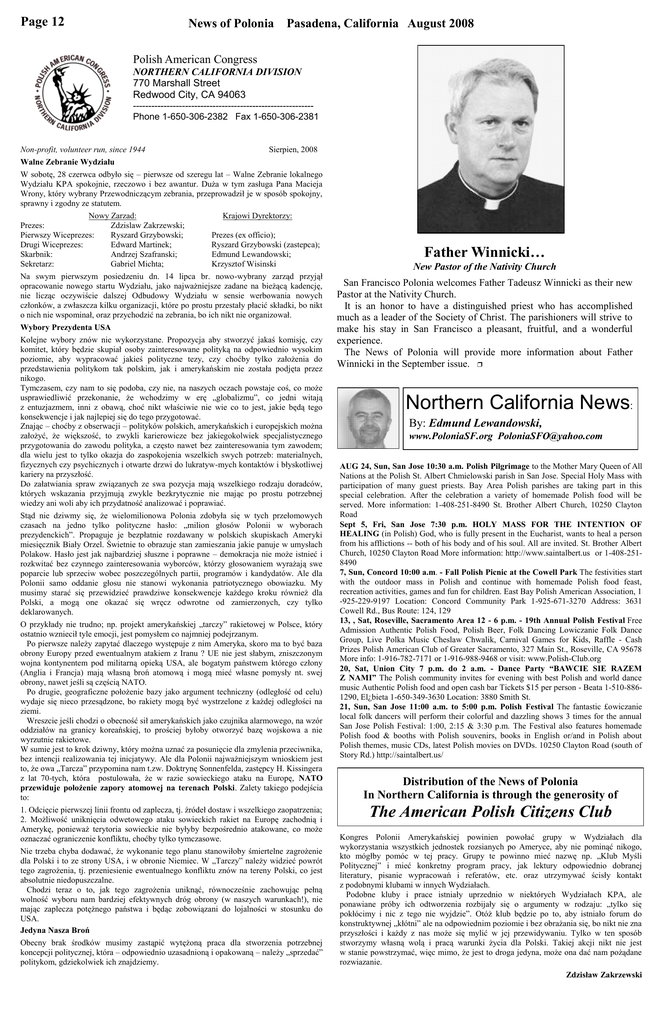 Page 12 News of Polonia Pasadena, California August 2008 Polish American Congress NORTHERN CALIFORNIA DIVISION 770 Marshall Street Redwood City, CA 94063 ----------------------------------------------------------Phone 1-650-306-2382 Fax 1-650-306-2381 Non-profit, volunteer run, since 1944 Sierpien, 2008 Walne Zebranie Wydziału W sobotę, 28 czerwca odbyło się – pierwsze od szeregu lat – Walne Zebranie lokalnego Wydziału KPA spokojnie, rzeczowo i bez awantur. Duża w tym zasługa Pana Macieja Wrony, który wybrany Przewodniczącym zebrania, przeprowadził je w sposób spokojny, sprawny i zgodny ze statutem. Nowy Zarzad: Prezes: Zdzislaw Zakrzewski; Pierwszy Wiceprezes: Ryszard Grzybowski; Drugi Wiceprezes: Edward Martinek; Skarbnik: Andrzej Szafranski; Sekretarz: Gabriel Michta; Krajowi Dyrektorzy: Prezes (ex officio); Ryszard Grzybowski (zastepca); Edmund Lewandowski; Krzysztof Wisinski Na swym pierwszym posiedzeniu dn. 14 lipca br. nowo-wybrany zarząd przyjął opracowanie nowego startu Wydziału, jako najważniejsze zadane na bieżącą kadencję, nie licząc oczywiście dalszej Odbudowy Wydziału w sensie werbowania nowych członków, a zwłaszcza kilku organizacji, które po prostu przestały płacić składki, bo nikt o nich nie wspominał, oraz przychodzić na zebrania, bo ich nikt nie organizował. Wybory Prezydenta USA Kolejne wybory znów nie wykorzystane. Propozycja aby stworzyć jakaś komisję, czy komitet, który będzie skupiał osoby zainteresowane polityką na odpowiednio wysokim poziomie, aby wypracować jakieś polityczne tezy, czy choćby tylko założenia do przedstawienia politykom tak polskim, jak i amerykańskim nie została podjęta przez nikogo. Tymczasem, czy nam to się podoba, czy nie, na naszych oczach powstaje coś, co może usprawiedliwić przekonanie, że wchodzimy w erę „globalizmu”, co jedni witają z entuzjazmem, inni z obawą, choć nikt właściwie nie wie co to jest, jakie będą tego konsekwencje i jak najlepiej się do tego przygotować. Znając – choćby z obserwacji – polityków polskich, amerykańskich i europejskich można założyć, że większość, to zwykli karierowicze bez jakiegokolwiek specjalistycznego przygotowania do zawodu polityka, a często nawet bez zainteresowania tym zawodem; dla wielu jest to tylko okazja do zaspokojenia wszelkich swych potrzeb: materialnych, fizycznych czy psychicznych i otwarte drzwi do lukratyw-mych kontaktów i błyskotliwej kariery na przyszłość. Do załatwiania spraw związanych ze swa pozycja mają wszelkiego rodzaju doradców, których wskazania przyjmują zwykle bezkrytycznie nie mając po prostu potrzebnej wiedzy ani woli aby ich przydatność analizować i poprawiać. Stąd nie dziwmy się, że wielomilionowa Polonia zdobyła się w tych przełomowych czasach na jedno tylko polityczne hasło: „milion głosów Polonii w wyborach prezydenckich”. Propaguje je bezpłatnie rozdawany w polskich skupiskach Ameryki miesięcznik Biały Orzel. Świetnie to obrazuje stan zamieszania jakie panuje w umysłach Polakow. Hasło jest jak najbardziej słuszne i poprawne – demokracja nie może istnieć i rozkwitać bez czynnego zainteresowania wyborców, którzy głosowaniem wyrażają swe poparcie lub sprzeciw wobec poszczególnych partii, programów i kandydatów. Ale dla Polonii samo oddanie głosu nie stanowi wykonania patriotycznego obowiazku. My musimy starać się przewidzieć prawdziwe konsekwencje każdego kroku również dla Polski, a mogą one okazać się wręcz odwrotne od zamierzonych, czy tylko deklarowanych. O przykłady nie trudno; np. projekt amerykańskiej „tarczy” rakietowej w Polsce, który ostatnio wzniecił tyle emocji, jest pomysłem co najmniej podejrzanym. Po pierwsze należy zapytać dlaczego występuje z nim Ameryka, skoro ma to być baza obrony Europy przed ewentualnym atakiem z Iranu ? UE nie jest słabym, zniszczonym wojna kontynentem pod militarną opieką USA, ale bogatym państwem którego człony (Anglia i Francja) mają własną broń atomową i mogą mieć własne pomysły nt. swej obrony, nawet jeśli są częścią NATO. Po drugie, geograficzne położenie bazy jako argument techniczny (odległość od celu) wydaje się nieco przesądzone, bo rakiety mogą być wystrzelone z każdej odległości na ziemi. Wreszcie jeśli chodzi o obecność sił amerykańskich jako czujnika alarmowego, na wzór oddziałów na granicy koreańskiej, to prościej byłoby otworzyć bazę wojskowa a nie wyrzutnie rakietowe. W sumie jest to krok dziwny, który można uznać za posunięcie dla zmylenia przeciwnika, bez intencji realizowania tej inicjatywy. Ale dla Polonii najważniejszym wnioskiem jest to, że owa „Tarcza” przypomina nam t.zw. Doktrynę Sonnenfelda, zastępcy H. Kissingera z lat 70-tych, która postulowała, że w razie sowieckiego ataku na Europę, NATO przewiduje położenie zapory atomowej na terenach Polski. Zalety takiego podejścia to: 1. Odcięcie pierwszej linii frontu od zaplecza, tj. źródeł dostaw i wszelkiego zaopatrzenia; 2. Możliwość uniknięcia odwetowego ataku sowieckich rakiet na Europę zachodnią i Amerykę, ponieważ terytoria sowieckie nie byłyby bezpośrednio atakowane, co może oznaczać ograniczenie konfliktu, choćby tylko tymczasowe. Nie trzeba chyba dodawać, że wykonanie tego planu stanowiłoby śmiertelne zagrożenie dla Polski i to ze strony USA, i w obronie Niemiec. W „Tarczy” należy widzieć powrót tego zagrożenia, tj. przeniesienie ewentualnego konfliktu znów na tereny Polski, co jest absolutnie niedopuszczalne. Chodzi teraz o to, jak tego zagrożenia uniknąć, równocześnie zachowując pełną wolność wyboru nam bardziej efektywnych dróg obrony (w naszych warunkach!), nie mając zaplecza potężnego państwa i będąc zobowiązani do lojalności w stosunku do USA. Jedyna Nasza Broń Obecny brak środków musimy zastąpić wytężoną praca dla stworzenia potrzebnej koncepcji politycznej, która – 