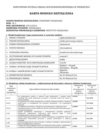 PAŃSTWOWA WYŻSZA SZKOŁA WSCHODNIOEUROPEJSKA W PRZEMYŚLU KARTA MODUŁU KSZTAŁCENIA NAZWA MODUŁU KSZTAŁCENIA: PODSTAWY SOCJOLOGII KOD: M_1 ROK AKADEMICKI: 2013/2014 KIERUNEK STUDIÓW: SOCJOLOGIA JEDNOSTKA PROWADZĄCA KIERUNEK: INSTYTUT SOCJOLOGII I. Moduł kształcenia i jego usytuowanie w systemie studiów 1. PROFIL STUDIÓW ogólnoakademicki 2. POZIOM KSZTAŁCENIA studia pierwszego stopnia 3. FORMA PROWADZENIA STUDIÓW stacjonarne 4. STATUS MODUŁU obowiązkowy 5. KATEGORIA MODUŁU kształcenia kierunkowego 6. USYTUOWANIE MODUŁU W PLANIE STUDIÓW semestr I 7. JĘZYK WYKŁADOWY polski 8. LICZBA PUNKTÓW ECTS PRZYPISANA MODUŁOWI 11. KOORDYNATOR MODUŁU 5 ECTS Wykład – 30 godz. Ćwiczenia – 30 godz. Egzamin Zaliczenie Ks. Dr Wojciech Pac 12. PROWADZĄCY MODUŁ Ks. Dr Wojciech Pac 9. FORMA I WYMIAR ZAJĘĆ DYDAKTYCZNYCH 10. FORMA I ZAKOŃCZENIE ZAJĘĆ DYDAKTYCZNYCH II. Modułowe efekty kształcenia z odniesieniem do kierunku i obszaru efektów kształcenia Kod modułowe efekty kształcenia 1 W_01 W_02 W_04 U_01 U_03 U_09 K_01 Opis efektów kształcenia dla modułu Odniesienie do kierunkowych efektów kształcenia Odniesienie do obszarowych efektów kształcenia 3 4 2 ma podstawową wiedzę w zakresie nauk społecznych i rozumie istotę socjologii jako nauki społecznej, jej miejsce w systemie nauk oraz relacje z innymi naukami ma podstawową wiedzę socjologiczną o różnych rodzajach struktur i instytucji społecznych, w szczególności ich istotnych elementach i ich wzajemnych relacjach ma podstawową wiedzę o rodzajach więzi społecznych i rządzących nimi prawidłowościach, rozumie społeczną naturę relacji łączących jednostki, grupy i instytucje społeczne potrafi prawidłowo rejestrować i interpretować zjawiska społeczne (kulturowe, gospodarcze, polityczne) przy pomocy pojęć i teorii socjologicznych w oparciu o zasady metodologii potrafi wykorzystać podstawową wiedzę teoretyczną i pozyskiwać dane do analizowania konkretnych procesów i zjawisk społecznych w zakresie socjologii potrafi przygotowywać prace pisemne w zakresie socjologii z zastosowaniem pojęć socjologicznych w oparciu o rozumie potrzebę ciągłego uczenia oraz doskonali swoją wiedzę i umiejętności w zakresie socjologii z wykorzystaniem nowoczesnych metod i środków K_W01 S1A_W01 K_W02 S1A_W02 K_W04 S1A_W04 K_U01 S1A_U01 K_U03 S1A_U03 K_K01 S1A_K01 III. Treści kształcenia – oddzielnie dla każdej formy zajęć dydaktycznych (W – wykład; C - ćwiczenia; K – konwersatorium; L - laboratorium; PR – projekt, PKZ - praktyka zawodowa; WT – Warsztat) Kod form zajęć dydaktyczny ch 1 W1 W2 W3 W4 W5 W6 W7 W8 W9 W10 W11 W12 W13 W14 W15 Szczegółowy opis treści realizowanych w ramach zajęć wg form zajęć dydaktycznych 2 wykład Istota i początki socjologii Miejsce refleksji nad społeczeństwem w presocjologicznej myśli społecznej od czasów starożytnych do pocz. XIX wieku. Podwaliny nauki o społeczeństwie i powstanie socjologii akademickiej. Socjologia a inne nauki społeczne. Pożytki studiowania socjologii. Interakcje społeczne Elementarne formy aktywności jednostkowej i społecznej: zachowania, działania, interakcje społeczne, stosunki społeczne, organizacja. Jednostka w społeczeństwie Środowisko społeczne. Więź społeczna. Całości społeczne. Środowisko jako "otoczenie" i środowisko jako system więzi społecznych. Koncepcja środowiska społecznego pierwotnego i wtórnego. Społeczeństwo w jednostce Symboliczna natura ludzkich interakcji. Socjalizacja. Pojęcie, elementy i struktura osobowości społecznej. Socjologiczna koncepcja osobowości. Tożsamość i role społeczne. Struktura r o l i s p o ł e c z n e j . Interakcje podczas wykonywania ról. Klasyfikacja podczas interakcji. Ramy interakcji. Interakcje a porządek społeczny. Socjologiczne pojęcie kultury Świat symboli a społeczna komunikacja. Systemy symboli jako fundament kultury. Kultura a system aksjo-normatywny. Wielość kultur i ich zróżnicowanie. Kultura symboliczna. Globalizacja i kultura masowa. Struktura społeczna Podstawowe elementy struktury społecznej. Rodzaje struktur społecznych. Dynamika struktur. Koncepcja struktury społecznej S. Ossowskiego. Działania masowe i ruchy społeczne. Organizacja życia społecznego: ład społeczny . Typy ładu społecznego wg H. Spencera i S. Ossowskiego. Organizacja życia społecznego: grupy społeczne Grupy społeczne. Podstawowe typy grup społecznych oraz ich funkcje. Dynamika grupowa. Władza, panowanie, przywództwo. Społeczeństwo organizacji Typ idealny organizacji biurokratycznej M. Webera. Typologia organizacji. Ekologia organizacji. Organizacje a życie w ponowoczesnym świecie. Organizacja życia społecznego: instytucje społeczne Podstawowe instytucje społeczne: pokrewieństwo, małżeństwo, rodzina, religia, gospodarka, system polityczny. Zróżnicowania i podziały społeczne Funkcje i geneza nierówności w społeczeństwie. Stratyfikacja społeczna. Koncepcja stratyfikacji społecznej Davisa i Moora. Klasy społeczne w ujęciach teoretycznych K. Marksa i M. Webera. Gender - płeć determinowana kulturowo. Różnice płci jako różnice społeczne. Nierówności w społeczeństwach ponowoczesnych a ruchliwość społeczna O r g a n i z a c j a i dezorganizacja społeczna Anomia społeczna. Kontrola społeczna. Konformizm. Zaburzenia, dewiacje i sprzeciw społeczny. Zmiana, rozwój i postęp w społeczeństwie Klasyczne wizje dziejów. Współczesne koncepcje zmiany społecznej i rozwoju społecznego. Trauma kulturowa. Społeczeństwo współczesne: nowoczesność, późna nowoczesność i ponowoczesność. Globalizacja Teorie i metody socjologii Klasyczne i współczesne teorie socjologiczne. Socjologiczne metody badawcze. Proces badawczy. Liczba godzin 3 2 2 2 2 2 2 2 2 2 2 2 2 2 2 2 30 RAZEM Ćwiczenia C1 C2 C3 Formy aktywności ludzkiej: - psychologiczne i socjologiczne ujęcie interakcji społecznej; - in