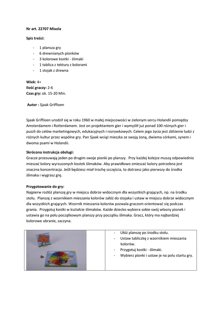 Nr art. 22707 Mixola Spis treści: - 1 plansza gry 6 drewnianych pionków 3 kolorowe kostki - ślimaki 1 tablica z tektury z kolorami 1 stojak z drewna Wiek: 4+ Ilość graczy: 2-6 Czas gry: ok. 15-20 Min. Autor : Sjaak Griffioen Sjaak Griffioen urodził się w roku 1960 w małej miejscowości w zielonym sercu Holandii pomiędzy Amsterdamem i Rotterdamem. Jest on projektantem gier i wymyślił już ponad 100 różnych gier i puzzli do celów marketingowych, edukacyjnych i rozrywkowych. Celem jego życia jest zbliżenie ludzi z różnych kultur przez wspólne gry. Pan Sjaak wciąż mieszka ze swoją żoną, dwiema córkami, synem i dwoma psami w Holandii. Skrócona instrukcja obsługi: Gracze przesuwają jeden po drugim swoje pionki po planszy. Przy każdej kolejce muszą odpowiednio mieszać kolory wyrzuconych kostek ślimaków. Aby prawidłowo zmieszać kolory potrzebna jest znaczna koncentracja. Jeśli będziesz miał trochę szczęścia, to dotrzesz jako pierwszy do środka ślimaka i wygrasz grę. Przygotowanie do gry: Najpierw rozłóż planszę gry w miejscu dobrze widocznym dla wszystkich grających, np. na środku stołu. Planszę z wzornikiem mieszania kolorów załóż do stojaka i ustaw w miejscu dobrze widocznym dla wszystkich grających. Wzornik mieszania kolorów pozwala graczom orientować się podczas grania. Przygotuj kostki w kształcie ślimaków. Każde dziecko wybiera sobie swój własny pionek i ustawia go na polu początkowym planszy przy początku ślimaka. Gracz, który ma najbardziej kolorowe ubranie, zaczyna. - Ułóż planszę po środku stołu. Ustaw tabliczkę z wzornikiem mieszania kolorów. Przygotuj kostki - ślimaki. Wybierz pionki i ustaw je na polu startu gry. Wskazówki do kostek ślimaków: Kostki ślimaki mają trzy różne kolory. Każdy ślimak ma inny kolor muszli (czerwony, żółty lub niebieski) po jednej i biały po drugiej stronie. Gracz bierze wszystkie trzy kostki w obydwie dłonie, dobrze nimi potrząsa i wyrzuca na stół. Kolory trzech ślimaków są teraz zmieszane i decydują o kolorze gry. Zestawienie mieszania kolorów pokazuje jaki kolor ostatecznie uzyskamy z kombinacji wyrzuconych kolorów kostek. Przebieg gry: Pierwszy gracz bierze trzy kostki w obydwie dłonie, wstrząsa nimi i wyrzuca na stół. Teraz patrzymy wszyscy dokładnie. Jakie kolory wyrzucił gracz? Przykład: pierwszy gracz wyrzuca kolor czerwony, żółty i biały. Teraz patrzymy na zestawienie mieszania kolorów na stojaku, jaki kolor wynika ze zmieszania naszych trzech wyrzuconych kolorów. W naszym przypadku czerwony i żółty dają kolor pomarańczowy. Możesz teraz przesunąć swój pionek na najbliższe pole o kolorze pomarańczowym. Kolej na następnego gracza w kolejce. Kolejka zgodnie z kierunkiem ruchu wskazówek zegara. Co robimy, jeśli na wyrzuconym polu planszy stoi już pionek innego gracza? Jeśli na polu planszy znajduje się już pionek innego gracza to gracz, który ma następną kolejkę i wchodzi na to samo pole może go zbić. Jak to działa? Pionek innego gracza musi się cofnąć na najbliższe pole planszy tego samego koloru co jego pionek. Przykład: Jeśli na pomarańczowym polu planszy stoi już niebieski pionek, to można go zbić i pionek musi być przestawiony na najbliżej znajdujące się pole niebieskie, oczywiście patrząc do tyłu. Jeśli nie ma już żadnego niebieskiego pola to pionek musi wrócić się na sam początek gry. Co się dzieje, jeśli wszystkie trzy ślimaki odwrócone są po wyrzuceniu na białą stronę: Jeśli gracz wyrzuci wszystkie białe ślimaki to rzeczywiście ma pecha. Pionek zostaje w miejscu, a gracza mija kolejka. Co się dzieje, jeśli gracz wyrzuci kolory tęczy: Jeśli gracz wyrzuci tęczę, to sam może zdecydować, który kolor wykorzysta. Wymagana jest tutaj pewna strategia. Gracz musi ocenić, który kolor lub kombinacja kolorów jest dla niego najbardziej korzystna. Informacja o środku ślimaka (w kolorze tęczy): Do środka ślimaka wejść można wyłącznie po wyrzuceniu kolorów tęczy (tzn. czerwonego, żółtego i niebieskiego na raz) lub wyrzucenie koloru własnego pionka. Oczywiście tylko pod warunkiem, że po drodze do środka ślimaka nie ma już żadnego pola w kolorze pionka. lub Koniec gry: Wygrywa gracz, który pierwszy dotrze do środka ślimaka. Wariant dla zaawansowanych (w wieku: 5+): Gra wg opisanych powyżej zasad. Dochodzi jednak jeszcze kilka zasad dodatkowych: Gdy gracz wyrzuci kolor własnego pionka: Jeśli gracz wyrzuci kolor własnego pionka, to będzie miał dwie możliwości: 1. może wymienić swój pionek na pionek innego gracza. Oczywiście powinien wymienić swój pionek na inny, który stoi bliżej środka ślimaka. 2. Jeśli nie jest wyprzedzany przez żadnego innego gracza to może przekazać kostki dalej i pozostać na swoim miejscu lub przesunąć pionek na wyrzucony kolor, jeśli ma jeszcze przed sobą pole w takim kolorze. Pole planszy i pionek takiego samego koloru: Nie można zbijać pionków stojących na polu planszy w identycznym kolorze. Gracz może przeskoczyć taki pionek i zająć miejsce na następnym polu w wyrzuconym kolorze. Cofanie się: Do środka ślimaka wejść można wyłącznie po wyrzuceniu kolorów tęczy (tzn. czerwonego, żółtego i niebieskiego na raz) lub wyrzucenie koloru własnego pionka. Oczywiście tylko pod warunkiem, że po drodze do środka ślimaka nie ma już żadnego pola w kolorze pionka. Jeśli gracz wyrzuci inny kolor i jeśli nie ma przed sobą pola planszy w takim kolorze to musi się cofnąć pionkiem do koloru, który właśnie wyrzucił. Koniec gry: Wygrywa gracz, który pierwszy dotrze do środka ślimaka. Tekst na pudełku = skrócona instrukcja: Kreatywna gra w łączenie kolorów Gracze przesuwają jeden po drugim swoje pionki po planszy. Przy każdej kolejce muszą odpowiednio mieszać kolory wyrzuconych kostek ślimaków. Aby prawidłowo zmieszać kolory potrzebna jest znaczna koncentracja. Jeśli będ