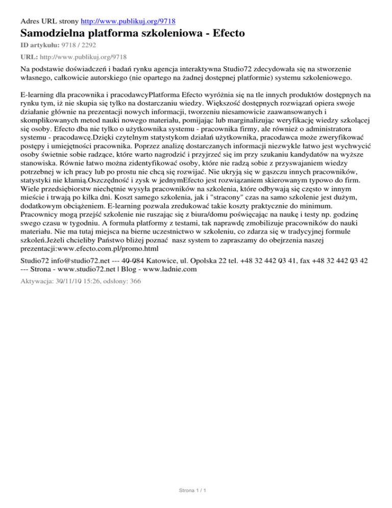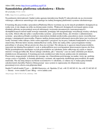Adres URL strony http://www.publikuj.org/9718 Samodzielna platforma szkoleniowa - Efecto ID artykułu: 9718 / 2292 URL: http://www.publikuj.org/9718 Na podstawie doświadczeń i badań rynku agencja interaktywna Studio72 zdecydowała się na stworzenie własnego, całkowicie autorskiego (nie opartego na żadnej dostępnej platformie) systemu szkoleniowego. E-learning dla pracownika i pracodawcyPlatforma Efecto wyróżnia się na tle innych produktów dostępnych na rynku tym, iż nie skupia się tylko na dostarczaniu wiedzy. Większość dostępnych rozwiązań opiera swoje działanie głównie na prezentacji nowych informacji, tworzeniu niesamowicie zaawansowanych i skomplikowanych metod nauki nowego materiału, pomijając lub marginalizując weryfikację wiedzy szkolącej się osoby. Efecto dba nie tylko o użytkownika systemu - pracownika firmy, ale również o administratora systemu - pracodawcę.Dzięki czytelnym statystykom działań użytkownika, pracodawca może zweryfikować postępy i umiejętności pracownika. Poprzez analizę dostarczanych informacji niezwykle łatwo jest wychwycić osoby świetnie sobie radzące, które warto nagrodzić i przyjrzeć się im przy szukaniu kandydatów na wyższe stanowiska. Równie łatwo można zidentyfikować osoby, które nie radzą sobie z przyswajaniem wiedzy potrzebnej w ich pracy lub po prostu nie chcą się rozwijać. Nie ukryją się w gąszczu innych pracowników, statystyki nie kłamią.Oszczędność i zysk w jednymEfecto jest rozwiązaniem skierowanym typowo do firm. Wiele przedsiębiorstw niechętnie wysyła pracowników na szkolenia, które odbywają się często w innym mieście i trwają po kilka dni. Koszt samego szkolenia, jak i "stracony" czas na samo szkolenie jest dużym, dodatkowym obciążeniem. E-learning pozwala zredukować takie koszty praktycznie do minimum. Pracownicy mogą przejść szkolenie nie ruszając się z biura/domu poświęcając na naukę i testy np. godzinę swego czasu w tygodniu. A formuła platformy z testami, tak naprawdę zmobilizuje pracowników do nauki materiału. Nie ma tutaj miejsca na bierne uczestnictwo w szkoleniu, co zdarza się w tradycyjnej formule szkoleń.Jeżeli chcieliby Państwo bliżej poznać nasz system to zapraszamy do obejrzenia naszej prezentacji:www.efecto.com.pl/promo.html Studio72 [email protected] --- 40-084 Katowice, ul. Opolska 22 tel. +48 32 442 03 41, fax +48 32 442 03 42 --- Strona - www.studio72.net | Blog - www.ladnie.com Aktywacja: 30/11/10 15:26, odsłony: 366 Strona 1 / 1