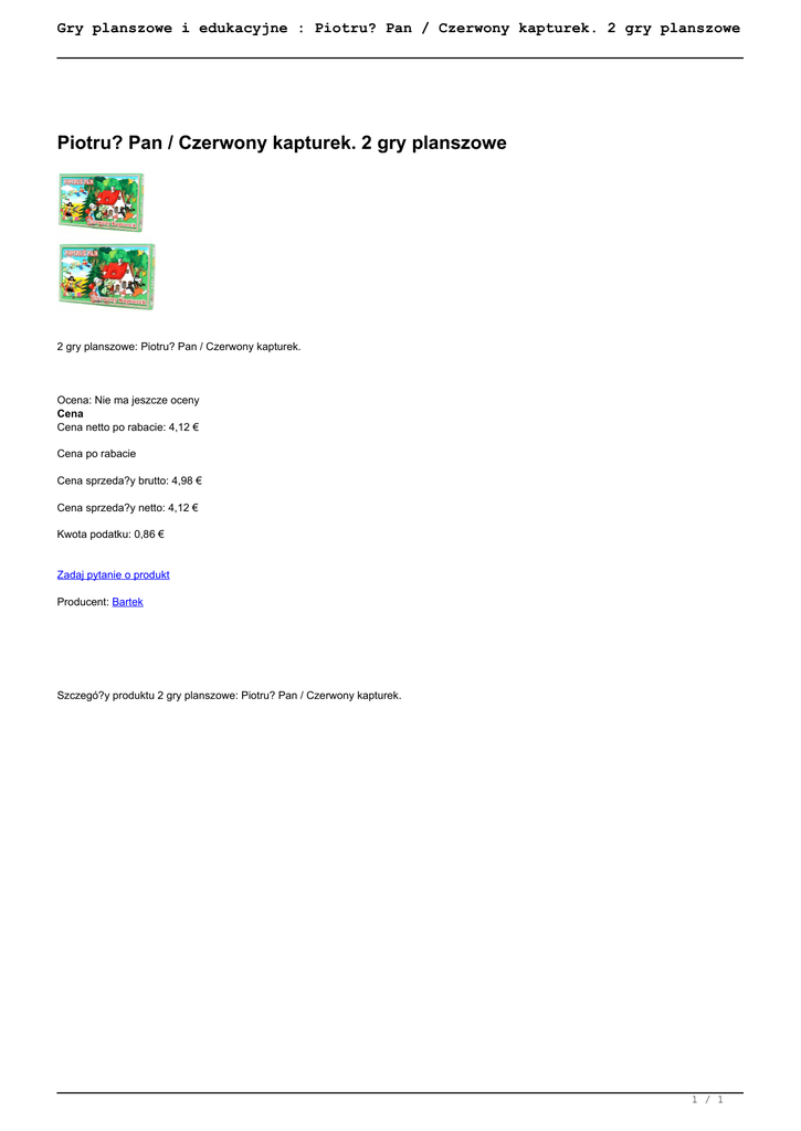 Gry planszowe i edukacyjne : Piotru? Pan / Czerwony kapturek. 2 gry planszowe Piotru? Pan / Czerwony kapturek. 2 gry planszowe 2 gry planszowe: Piotru? Pan / Czerwony kapturek. Ocena: Nie ma jeszcze oceny Cena Cena netto po rabacie: 4,12 € Cena po rabacie Cena sprzeda?y brutto: 4,98 € Cena sprzeda?y netto: 4,12 € Kwota podatku: 0,86 € Zadaj pytanie o produkt Producent: Bartek Szczegó?y produktu 2 gry planszowe: Piotru? Pan / Czerwony kapturek. 1 / 1 Powered by TCPDF (www.tcpdf.org)