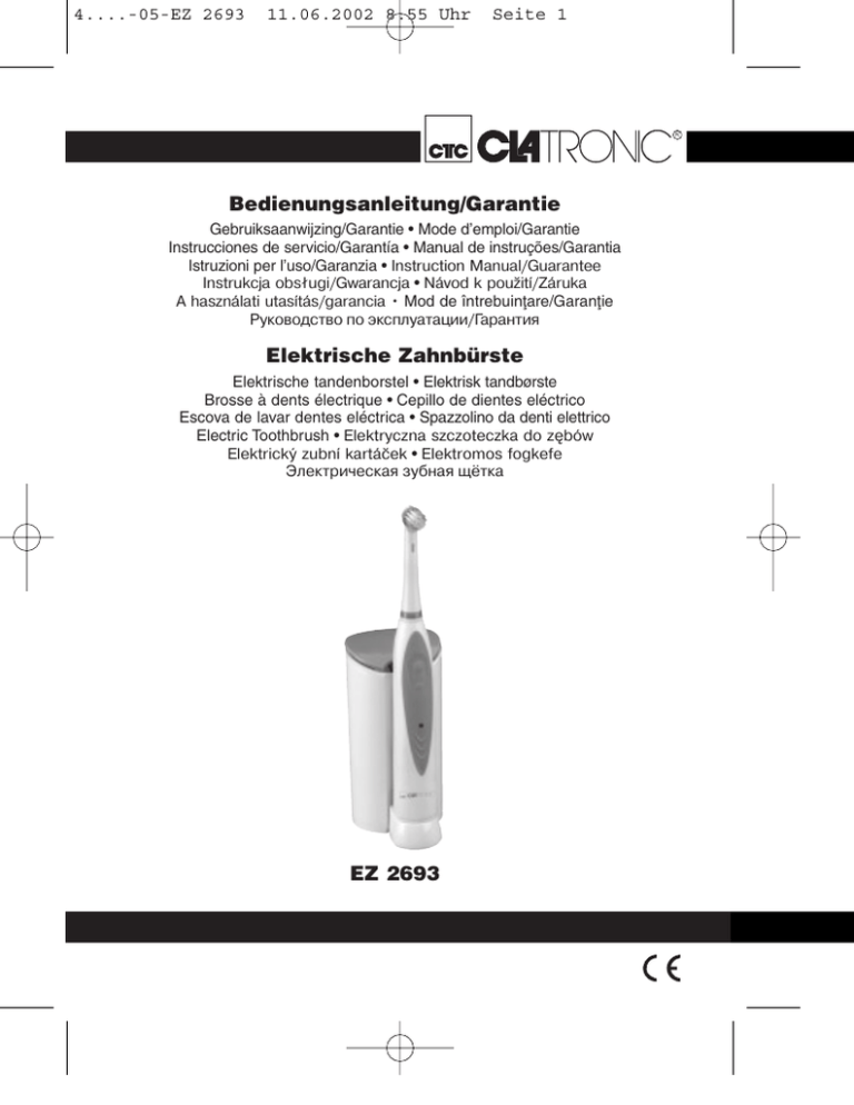 4....-05-EZ 2693 11.06.2002 8:55 Uhr Seite 1 R Bedienungsanleitung/Garantie Gebruiksaanwijzing/Garantie • Mode d’emploi/Garantie Instrucciones de servicio/Garantía • Manual de instruções/Garantia Istruzioni per l’uso/Garanzia • Instruction Manual/Guarantee Instrukcja obsługi/Gwarancja • Návod k použití/Záruka A használati utasítás/garancia • Mod de întrebuinflare/Garanflie Руководство по эксплуатации/Гарантия Elektrische Zahnbürste Elektrische tandenborstel • Elektrisk tandbørste Brosse à dents électrique • Cepillo de dientes eléctrico Escova de lavar dentes eléctrica • Spazzolino da denti elettrico Electric Toothbrush • Elektryczna szczoteczka do zębów Elektrický zubní kartáček • Elektromos fogkefe Электрическая зубная щётка EZ 2693 4....-05-EZ 2693 11.06.2002 8:55 Uhr Seite 2 Inhalt D NL F E P I GB PL CZ H RO RUS Inhoud • Sommaire • Indice • Índice • Indice Contents • Spis treści • Obsah • Tartalom • Conflinut • Содержание Übersicht Bedienelemente . . . . . . . . . . . . . . . . . . . . . . . . . .Seite Bedienungsanleitung . . . . . . . . . . . . . . . . . . . . . . . . . . . . . . .Seite Garantie . . . . . . . . . . . . . . . . . . . . . . . . . . . . . . . . . . . . . . . .Seite Overzicht bedieningselementen . . . . . . . . . . . . . . . . . . . . . .Pagina Gebruiksaanwijzing . . . . . . . . . . . . . . . . . . . . . . . . . . . . . . . .Pagina Garantie . . . . . . . . . . . . . . . . . . . . . . . . . . . . . . . . . . . . . . . .Pagina Aperçu des éléments de commande . . . . . . . . . . . . . . . . . . .Page Mode d’emploi . . . . . . . . . . . . . . . . . . . . . . . . . . . . . . . . . . .Page Garantie . . . . . . . . . . . . . . . . . . . . . . . . . . . . . . . . . . . . . . . .Page Vista de conjunto Elementos de mando . . . . . . . . . . . . . . . .Página Instrucciones de servicio . . . . . . . . . . . . . . . . . . . . . . . . . . . .Página Garantia . . . . . . . . . . . . . . . . . . . . . . . . . . . . . . . . . . . . . . . .Página Vista geral dos elemntos de comando . . . . . . . . . . . . . . . . .Página Manual de instruções . . . . . . . . . . . . . . . . . . . . . . . . . . . . . .Página Garantía . . . . . . . . . . . . . . . . . . . . . . . . . . . . . . . . . . . . . . . .Página Descrizione dei singoli pezzi . . . . . . . . . . . . . . . . . . . . . . . .Pagina Istruzioni per l’uso . . . . . . . . . . . . . . . . . . . . . . . . . . . . . . . . .Pagina Garanzia . . . . . . . . . . . . . . . . . . . . . . . . . . . . . . . . . . . .Pagina Control element overview . . . . . . . . . . . . . . . . . . . . . . . . . . .Page Instruction Manual . . . . . . . . . . . . . . . . . . . . . . . . . . . . . . . . .Page Guarantee . . . . . . . . . . . . . . . . . . . . . . . . . . . . . . . . . . . . . .Page Przegląd elemetów obsługi . . . . . . . . . . . . . . . . . . . . . . . . .Strona Instrukcja obsługi . . . . . . . . . . . . . . . . . . . . . . . . . . . . . . . .Strona Gwarancja . . . . . . . . . . . . . . . . . . . . . . . . . . . . . . . . . . .Strona Přehled obsluhovací prvky . . . . . . . . . . . . . . . . . . . . . . . . . .Strana Návod k použití . . . . . . . . . . . . . . . . . . . . . . . . . . . . . . . . . .Strana Záruka . . . . . . . . . . . . . . . . . . . . . . . . . . . . . . . . . . . . .Strana A hasznalt elemek megtekintése . . . . . . . . . . . . . . . . . . . . .Oldal A hasznalati utasítás . . . . . . . . . . . . . . . . . . . . . . . . . . . . . .Oldal Garancia . . . . . . . . . . . . . . . . . . . . . . . . . . . . . . . . . . . . . . . .Oldal Privire de ansamblu al modului de întrebuinflare . . . . . . . .Paginæ Mod de întrebuinflare . . . . . . . . . . . . . . . . . . . . . . . . . . . . . .Paginæ Garanflie . . . . . . . . . . . . . . . . . . . . . . . . . . . . . . . . . . . . . .Paginæ Обзор управляющих элементов . . . . . . . . . . . . . . . . . . . .стр. Руководство по эксплуатации . . . . . . . . . . . . . . . . . . . . . .стр. Гарантия . . . . . . . . . . . . . . . . . . . . . . . . . . . . . . . . . . . . . . . . .стр. 3 4 5 3 7 9 3 10 12 3 13 15 3 16 18 3 19 21 3 22 24 3 25 27 3 29 31 3 32 34 3 35 37 3 38 40 4....-05-EZ 2693 11.06.2002 8:55 Uhr Seite 3 1 3 4 2 6 7 5 8 Darstellung der Bedienelemente 1 2 3 4 Bürstenkopf Bürstenfach Bürstenschaft Farbring 5 6 7 8 Antriebsstange EIN-/AUS-Schalter Lade-Kontrollleuchte Ladestation 3 4....-05-EZ 2693 11.06.2002 8:55 Uhr Seite 4 Allgemeine Sicherheitshinweise D • • • Lesen Sie vor Inbetriebnahme dieses Gerätes die Bedienungsanleitung sehr sorgfältig durch und bewahren Sie diese inkl. Garantieschein, Kassenbon und nach Möglichkeit den Karton mit Innenverpackung gut auf. Benutzen Sie das Gerät ausschließlich für den privaten und den dafür vorgesehenen Zweck. Dieses Gerät ist nicht für den gewerblichen Gebrauch bestimmt. Benutzen Sie es nicht im Freien (außer es ist für den bedingten Einsatz im Freien vorgesehen). Halten Sie es vor Hitze, direkter Sonneneinstrahlung, Feuchtigkeit (auf keinen Fall in Flüssigkeiten tauchen) und scharfen Kanten fern. Benutzen Sie das Gerät nicht mit feuchten Händen. Bei feucht oder nass gewordenem Gerät sofort den Netzstecker ziehen. Nicht ins Wasser greifen. Schalten Sie das Gerät aus und ziehen Sie immer den Stecker aus der Steckdose (ziehen Sie am Stecker, nicht am Kabel) wenn Sie das Gerät nicht benutzen, Zubehörteile anbringen, zur Reinigung oder bei Störung. Lassen Sie das Gerät niemals unbeaufsichtigt. Um Kinder vor Gefahren elektrischer Geräte zu schützen, sorgen Sie bitte dafür, dass das Kabel nicht herunter hängt und Kinder keinen Zugriff auf das Gerät haben. Prüfen Sie Gerät und Kabel regelmäßig auf Schäden. Ein beschädigtes Gerät bitte nicht in Betrieb nehmen. Reparieren Sie das Gerät nicht 