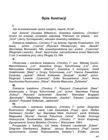 Spis Ilustracji I. Jan Kurdwanowski (autor książki), kapral „Krok". Kpt „Sosna" (Gustaw Billewicz), dowódca batalionu „Chrobry" (trzeci od prawej), prowadzi odprawę. Pierwszy od prawej - por. „Grot" (Jerzy Szczepanek), adiutant dowódcy batalionu. Żołnierze batalionu „Chrobry I" na terenie Ogrodu Krasińskich. Od lewej - pchor. „Czarny" (Ryszard Włodarczyk), strz. „Słowik" (Bronisław Borowski), NN, prawdopodobnie kpr. podch. „Czarnota" (Reginald Lewicki), „Ewa", łączniczka, zamordowana przez Niemców 2 lub 3 września przy ulicy Długiej 23, NN. II. Oficerowie i żołnierze batalionu „Chrobry I": por. Mikołaj DuninMarcinkiewicz „Lis", dowódca Grupy Szturmowej „Lis"; chor. Mieczysław Kalinowski „Wierny", dowódca 3 kompanii; Józef Gołębiowski „Mały" z Grupy Szturmowej „Lis"; Hanna ZawadzkaDziarska „Jędrek"; Witold Kotlewski „Strażak", „Kotlet"; pchor. Reginald Lewicki „Czarnota"; Zofia Boczarówna „Kos"; Anna Samborska-Rusinowicz „Wera"; Wanda Błazucka „Żydówka". III. Żołnierze batalionu „Chrobry I": Ryszard Chałupiński „Sław", artylerzysta z Grupy Szturmowej „Lis”; pchor. Stanisław Pietras „Kobuz"; Ryszard Jankowski „Szarota"; Stanisław Bugajski „Barykada"; Władysław Wiśniewski „Kawka"; Edward Laudański „Edwin"; Ryszard Sołtyński „Jabłoński". IV. Oficerowie i żołnierze batalionu „Chrobry I": pchor. Zbigniew Rusinowicz „Rogal”; sanit. Lala Zawadzka „Pups”; ppor. Stefan Zienkiwicz „Szofer”; kpr. Stanisław Maik „Hutnicki”; sanit. Elżbieta Majewska „Niunia”; Henryk Paluchow „Góral”. Źródło. Komisja Historyczna Środowiska Batalionu „Chrobry I" Armii Krajowej, Zgrupowanie Sosna Batalion Chrobry I, Warszawa 1993. Przyjaciele z Sadyby. Od lewej: Edward Laudański „Edwin”, Zbigniew Stankiewicz „Bajkop”, Janusz Bronowicz „Pepi” (autor opracowania „Dzieje Warszawskiej Sadyby”). Źródło. Janusz 387 Bronowicz, Dzieje Warszawskiej Sadyby, Rocznik Warszawski XXX, Zamek Królewski w Warszawie 2001. V. Zdobyte przez batalion „Chrobry I" na Stawkach działko przeciwpancerne. Na pierwszym planie (odwrócony tyłem) - strz. „Mongoł", siedzi na działku (w hełmie) -pchor. „Gryf. Żołnierze batalionu „Chrobry I" przy zdobytym działku. Pierwszy od lewej - plut. „Jur" (Jerzy Schabowicz), czwarty - „Hutnicki" (Stanisław Maik). Widok z wnętrza Pasażu Simonsa na skrzyżowanie ulic Długiej i Bielańskiej, w głębi domy obsadzone przez Niemców. Zdjęcie wykonane w czasie walk. Zwał gruzu to frontowa ściana Pasażu, która zwaliła się 23 sierpnia po ostrzelaniu przez czołgi i działa szturmowe grzebiąc uszkodzone już wcześniej działo i leżących obok niego poległych powstańców, radosnych i zwycięskich na zdjęciach powyżej. VI. Omawianie sytuacji bojowej na kwaterze dowódcy I kompanii w Pasażu Simonsa. Barykada na ulicy Nalewki między Pasażem Simonsa a Arsenałem. Pierwszy siedzący od lewej - strzelec „Słowik" (Bronisław Borowski) VII. Ksiądz błogosławi powstańców in articulo mortis. Od lewej: Edward Laudański „Edwin", Władysław Wiśniewski „Kawka", Stefan Milewski „Pietrek", Ryszard Prokopiak „Willy", Anna SamborskaRusinowicz „Wera". Pożary koło kościoła kalwińskiego przy ulicy Leszno, widziane od strony Arsenału. Na pierwszym planie mur dawnego getta. Kpt. pilot Wiktor Dobrzański – „Wład”. Źródło. Komisja Historyczna Środowiska Batalionu „Chrobry I" Armii Krajowej, Zgrupowanie Sosna Batalion Chrobry I, Warszawa 1993. VIII. „Tak lud gnieciony mielony rozdarty, przez głupich wodzów przegrany jak w karty” Fotografia z albumu „Warszawa w dniach Powstania 1944”, Lesław M. Bartelski i Tadeusz Bukowski; Krajowa Agencja Wydawnicza, Warszawa 1980. 388 IX. Pasaż Simonsa. Narożnik od strony ulic Nalewki i Wyjazd. Front zburzony przez „goliata". Fotografia z albumu „Warszawa 1945”, Leonard Sempoliński. Państwowe Wydawnictwa Naukowe, Warszawa 1975. X. Część wschodnia Woli i okolic, 1935 r. Fragment mapy Warszawy z albumu Warszawa Jaka Była; Wydawnictwo „Alfa” i Państwowe Przedsiębiorstwo Wydawnictw Kartograficznych, Warszawa 1984 . XI. Część zachodnia Woli i okolic, 1935 r. Fragment mapy Warszawy z albumu Warszawa Jaka Była; Wydawnictwo „Alfa” i Państwowe Przedsiębiorstwo Wydawnictw Kartograficznych, Warszawa 1984. XII. U góry - Nordwache, siedziba żandarmerii niemieckiej przy zbiegu ulic Żelaznej i Chłodnej po stoczonej bitwie z żołnierzami batalionu „Chrobry I”, 3 sierpień 1944 r. Źródło. Dni Powstania, Stanisław Kopf; Instytut Wydawniczy Pax, Warszawa 1984. U dołu – grupa żołnierzy batalionu „Chrobry I” przed zdobytym bunkrem. Źródło. Komisja Historyczna Środowiska Batalionu „Chrobry I" Armii Krajowej, Zgrupowanie Sosna Batalion Chrobry I, Warszawa 1993. XIII. Okolice Starego Miasta: 1 - Pasaż Simonsa, 2 - Harcowisko Granatników, 3 - Pusty Dom, 4 - Hotel Polski - Reduta Matki Boskiej, 5 - barykada „pod trupią główką", 6 - skład kafelków, 7 - rów dobiegowy, 8 - właz do kanału, 9 - zdechły koń. Sierpień 1944. Szkic ze zbiorów Władysława Strumiłło. XIIIa. Arsenał, Nalewki róg Długiej, ok.1935. Według strony internetowej warszawa1939.pl. Arsenał, Nalewki, Pasaż Simonsa, ok.1910. Według strony internetowej studiop2.pl. XIIIb. Pasaż Simonsa, od strony skrzyżowania Bielańskiej i Długiej, w kierunku placu Krasińskich, ok. 1910. Źródło. Warszawa Na Starej Fotografii; Wydawnictwo Artystyczno-Graficzne, 1960. Wschodnia część Pasażu Simonsa: 1 - winda i klatka schodowa, 2 - drabina do podziemi, 3 - kocioł, 4 - wielkie okno, 5 - zdechły koń, 389 SO - Sala Obrabiarek, PS - Pusta Sala. Według szkicu autora. XIIIc. Pasaż Simonsa od strony skrzyżowania Bielańskiej i Długiej. Po prawej narożny dom przy Długiej 48, 1948. Ze zbiorów autora. Narożny dom przy ulicy Długiej 48, ok.1930. Ba