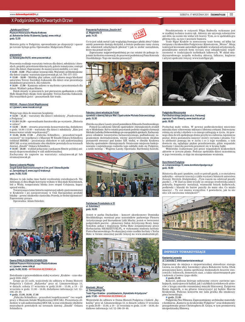 www.dziennikpolski24.pl SOBOTA, 17 WRZEŚNIA 2011 III X Podgórskie Dni Otwartych Drzwi „Apteka pod Orłem” Muzeum Historyczne Miasta Krakowa pl. Bohaterów Getta 18 (dawniej Zgody), www.mhk.pl godz. 12.30 Historia getta w Podgórzu, oprowadzanie po ekspozycji i spacer po terenie byłego getta. Oprowadza: Małgorzata Polzer. pracownia k ul. Kalwaryjska 64/10, www.pracowniak.pl Pracownia Pozłotnicza „Ossolin Art” ul. Węgierska 13 godz. 14.30 LAT 10 AMI ZN Co to jest szlak metal i jak wyglądają fruwające płatki złota? Gdzie anioły ponownie dostają skrzydeł, a świeżo pozłacane ramy cieszą oko właścicieli szlachetnych płócien? I jak to zrobić narzędziem, które ma ponad sto lat? Zapraszamy najprawdopodobniej po raz ostatni do pełnego tajemnic królestwa renowacji, do pracowni pozłotniczej Pana Konrada Ossolińskiego. Tego nie można przeoczyć! Przedstawienie w reżyserii Filipa Budweila wykonane jest w rzadkiej technice teatru rąk. Aktorzy nie używają rekwizytów ani słów, na scenie nie widać ich twarzy. Tym, co w spektaklu gra główną rolę, są ręce i poczucie humoru. Teatr Figur Kraków to nowoczesny teatr formy, od kilku lat związany z krakowskim Podgórzem i Kinoteatrem „Wrzos”. Misją teatru jest kreowanie autorskich spektakli i wydarzeń artystycznych, poszukiwanie nowych form wyrazu oraz odnajdywanie współczesności w tradycyjnych technikach lalkowych. W skład międzynarodowego zespołu wchodzą aktorzy, lalkarze, kuglarze i artyści społeczni (więcej: www.teatrfigur.pl). FOT. PRZEMYSŁAW SIERACZYŃSKI Pracownia realizuje warsztaty twórcze dla dzieci, młodzieży i dorosłych, projekty przestrzeni dziecięcych, galerie tematyczne, contept store dla dzieci. Zapraszamy do naszej nowej siedziby, a w niej: 12.00 – 13.00 – Place zabaw wczoraj i dziś. Warsztaty architektoniczne dla dzieci (zapisy: [email protected], tel. 795–577–557) 13.00 – 16.00 – Mobilny plac zabaw, czyli zabawa mega klockami autorstwa Teresy Zaorskiej–Łukaszuk dla dzieci oraz prezentacja działalności pracowni k. dla rodziców. 16.00 – 17.00 – Kamienie milowe w myśleniu o przestrzeniach dla dzieci. Wykład i pokaz filmów. Dzień otwarty w pracowni k. jest pierwszym spotkaniem z cyklu Mały dizajn/Duży dizajn. Gość specjalny: Teresa Zaorska–Łukaszuk. Dla wszystkich gości – poczęstunek fair trade. MOCAK – Muzeum Sztuki Współczesnej ul. Lipowa 4, www.mocak.com.pl Wstęp tego dnia do muzeum bezpłatny. 12.00 – 13.45 – warsztaty dla dzieci i młodzieży „Pozdrowienia z Podgórza”. 13.30 i 14.30 – oprowadzanie kuratorskie po wystawie „Historia w sztuce”. 14.00 – 16.00 – otwarta pracownia konserwatorska, dodatkowo o godz. 14.00 i 15.00 – warsztaty dla dzieci i młodzieży „Kim jest konserwator sztuki współczesnej?”. 15.00, 16.00, 17.00 – „Fabryka Schindlera – przeszłość/współczesność” we współpracy z Muzeum W Emalii Oskara Schindlera (oddział MHMK) – prezentacja slideshow w sali audiowizualnej MOCAK–u oraz zwiedzanie obu obiektów powstałych na terenach dawnej „Emalii” Oskara Schindlera. 18.00 – 20.00 – wykład połączony z pokazem filmów polskiej animacji eksperymentalnej w sali audiowizualnej. Zachęcamy do zapisów na warsztaty: [email protected] lub [email protected]. Fabryka z ziemi włoskiej do Polski opowieść o dawnej fabryce Wat i Opatrunków Michała Dobrowolskiego godz. 15.30 Zbiórka na placu Lasoty przed pomnikiem Edwarda Dembowskiego Pomysł na założenie fabryki opatrunków chirurgicznych zrodził się w Mediolanie. Był to ostatni przystanek podróży magistra farmacji Michała Ludwika Dobrowolskiego po europejskich aptekach. Zachęcony przez członków towarzystwa farmaceutycznego, podbudowany zagranicznym doświadczeniem, wierny pozytywistycznym ideałom postanowił stworzyć pod koniec XIX wieku, w obrębie Krakowa fabrykę opatrunków chirurgicznych. Ostatecznie miejscem funkcjonowania i największego rozkwitu tego zakładu stało się Podgórze, a ściśle mówiąc – Wzgórze Lasoty. Opowiada: Bartłomiej Sawicki. Posłuchaj mały widzu. W pewnej podkrakowskiej mieścinie mieszka stary schorowany młynarz z dwiema córkami. Dziewczyny różnią się urodą i obydwie o co innego zabiegają w życiu. Aż pewnego dnia do ich spokojnego domu przybywa cudowna, tajemnicza postać, która postanawia nauczyć siostry czytania i pisania. Czy te zdolności pomogą im w życiu i co z tego wyniknie, o tym dowiecie się, oglądając piękne przedstawienie, gdzie wspaniałe kostiumy i muzyka pozwolą przenieść się w krainę bajki. Widowisko realizowane jest przez wspaniałych krakowskich aktorów w żywym planie. Podczas spektaklu dzieci uczestniczą w jego tworzeniu, co daje im niezapomniane wrażenia. Dom Historii Podgórza ul. Limanowskiego 13, www.domhistoriipodgorza.pl godz. 19.00 Dawna Lodownia Miejska Zespół Szkół Gastronomicznych nr 2 im. prof. Odona Bujwida ul. Zamojskiego 6, www.zsgnr2-krakow.pl godz. 14.00, 15.00 Miejsce to jak żadne inne budzi wyobraźnię zwiedzających. Nic dziwnego, te dwa długie korytarze wykute w litej skale Krzemionek, lód z Wisły, temperatuta bliska zero stopni Celsjusza, kupcy sprzed wieku... Towarzysząca temu historia najstarszej szkoły gastronomicznej w Krakowie i jej zarejestrowany w Unii Europejskiej produkt lokalny – pewne smakowite ciasteczka. Prawda, że brzmi tajemniczo? Zapraszamy gorąco. Oprowadza: Adam Dziedzic. Podgórska Wieczorynka Park Bednarskiego (wejście od ul. Parkowej) zaprasza Teatr Otwarty, www.teatrto.art.pl godz. 18.00 Biżuteria dla pań i punków, czyli co potrafi guzik, a co metalowa nakrętka – otwarcie trzeciej z cyklu wystawy biżuterii autorstwa Zenony Stróżyk–Stulgińskiej. „Tym razem na odstrzał poszły guziki (...) W ślad za nimi wyszły ze swojego środowiska jakieś pokrętła, fragmenty instalacji, wianuszki łożysk kulkowych, podkówki i blaszki do butów puściły do m