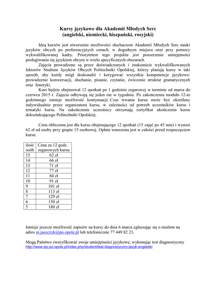 Kursy językowe dla Akademii Młodych Serc (angielski, niemiecki, hiszpański, rosyjski) Ideą kursów jest stworzenie możliwości słuchaczom Akademii Młodych Serc nauki języków obcych po preferencyjnych cenach, w dogodnym miejscu oraz przy pomocy wykwalifikowanej kadry. Priorytetem tego projektu jest poszerzenie umiejętności posługiwania się językiem obcym w wielu specyficznych obszarach. Zajęcia prowadzone są przez doświadczonych i znakomicie wykwalifikowanych lektorów Studium Języków Obcych Politechniki Opolskiej, którzy planują kursy w taki sposób, aby każdy mógł doskonalić i korygować wszystkie kompetencje językowe: prowadzenie konwersacji, słuchanie, pisanie, czytanie, ćwiczenie struktur gramatycznych oraz fonetyki. Kurs będzie obejmował 12 spotkań po 1 godzinie zegarowej w terminie od marca do czerwca 2015 r. Zajęcia odbywają się jeden raz w tygodniu. Po zakończeniu modułu 12-to godzinnego istnieje możliwość kontynuacji. Czas trwania kursu może być określany indywidualnie przez organizatora kursu, w zależności od potrzeb uczestników kursu i tematyki kursu. Na zakończenie uczestnicy otrzymają certyfikat ukończenia kursu dokształcającego Politechniki Opolskiej. Cena obliczona jest dla kursu obejmującego 12 spotkań (15 zajęć po 45 min) i wynosi 62 zł od osoby przy grupie 15 osobowej. Opłata wnoszona jest w całości przed rozpoczęciem kursu. ilość Cena za 12 godz. osób zegarowych kursu 15 62 zł 14 66 zł 13 71 zł 12 77 zł 11 84 zł 10 91 zł 9 101 zł 8 113 zł 7 129 zł 6 150 zł 5 180 zł Istnieje jeszcze możliwość zapisów na kursy do dnia 6 marca zgłaszając się e-mailem na adres [email protected] lub telefonicznie 77 449 82 23. Mogą Państwo zweryfikować swoje umiejętności językowe, wykonując test diagnostyczny http://www.sjo.po.opole.pl/index.php/student/test-diagnostyczny-jezyk-angielski
