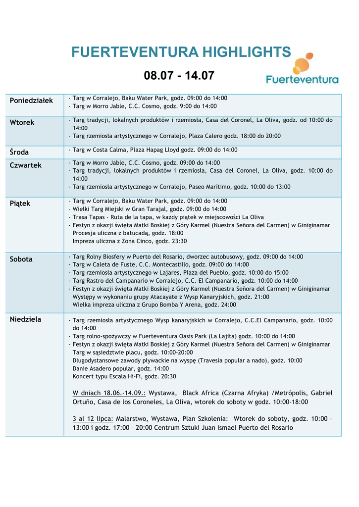 FUERTEVENTURA HIGHLIGHTS 08.07 - 14.07 Poniedziałek - Targ w Corralejo, Baku Water Park, godz. 09:00 do 14:00 - Targ w Morro Jable, C.C. Cosmo, godz. 9:00 do 14:00 Wtorek - Targ tradycji, lokalnych produktów i rzemiosła, Casa del Coronel, La Oliva, godz. od 10:00 do 14:00 - Targ rzemiosła artystycznego w Corralejo, Plaza Calero godz. 18:00 do 20:00 Środa - Targ w Costa Calma, Plaza Hapag Lloyd godz. 09:00 do 14:00 Czwartek - Targ w Morro Jable, C.C. Cosmo, godz. 09:00 do 14:00 - Targ tradycji, lokalnych produktów i rzemiosła, Casa del Coronel, La Oliva, godz. 10:00 do 14:00 - Targ rzemiosła artystycznego w Corralejo, Paseo Marítimo, godz. 10:00 do 13:00 Piątek - Targ w Corralejo, Baku Water Park, godz. 09:00 do 14:00 Wielki Targ Miejski w Gran Tarajal, godz. 09:00 do 14:00 Trasa Tapas - Ruta de la tapa, w każdy piątek w miejscowości La Oliva Festyn z okazji święta Matki Boskiej z Góry Karmel (Nuestra Señora del Carmen) w Giniginamar Procesja uliczna z batucadą, godz. 18:00 Impreza uliczna z Zona Cinco, godz. 23:30 Sobota - Targ Rolny Biosfery w Puerto del Rosario, dworzec autobusowy, godz. 09:00 do 14:00 Targ w Caleta de Fuste, C.C. Montecastillo, godz. 09:00 do 14:00 Targ rzemiosła artystycznego w Lajares, Plaza del Pueblo, godz. 10:00 do 15:00 Targ Rastro del Campanario w Corralejo, C.C. El Campanario, godz. 10:00 do 14:00 Festyn z okazji święta Matki Boskiej z Góry Karmel (Nuestra Señora del Carmen) w Giniginamar Występy w wykonaniu grupy Atacayate z Wysp Kanaryjskich, godz. 21:00 Wielka impreza uliczna z Grupo Bomba Y Arena, godz. 24:00 Niedziela - Targ rzemiosła artystycznego Wysp kanaryjskich w Corralejo, C.C.El Campanario, godz. 10:00 do 14:00 - Targ rolno-spożywczy w Fuerteventura Oasis Park (La Lajita) godz. 10:00 do 14:00 - Festyn z okazji święta Matki Boskiej z Góry Karmel (Nuestra Señora del Carmen) w Giniginamar Targ w sąsiedztwie placu, godz. 10:00-20:00 Długodystansowe zawody pływackie na wyspę (Travesía popular a nado), godz. 10:00 Danie Asadero popular, godz. 14:00 Koncert typu Escala Hi-Fi, godz. 20:30 W dniach 18.06.-14.09.: Wystawa, Black Africa (Czarna Afryka) /Metrópolis, Gabriel Ortuño, Casa de los Coroneles, La Oliva, wtorek do soboty w godz. 10:00-18:00 3 al 12 lipca: Malarstwo, Wystawa, Plan Szkolenia: Wtorek do soboty, godz. 10:00 – 13:00 i godz. 17:00 – 20:00 Centrum Sztuki Juan Ismael Puerto del Rosario