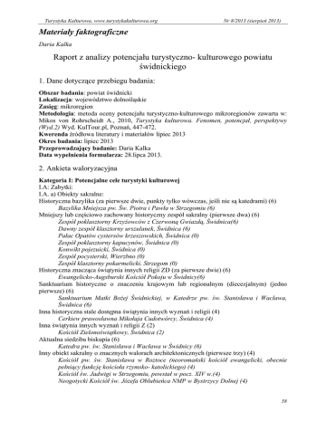 Turystyka Kulturowa, www.turystykakulturowa.org Nr 8/2013 (sierpień 2013) Materiały faktograficzne Daria Kalka Raport z analizy potencjału turystyczno- kulturowego powiatu świdnickiego 1. Dane dotyczące przebiegu badania: Obszar badania: powiat świdnicki Lokalizacja: województwo dolnośląskie Zasięg: mikroregion Metodologia: metoda oceny potencjału turystyczno-kulturowego mikroregionów zawarta w: Mikos von Rohrscheidt A., 2010, Turystyka kulturowa. Fenomen, potencjał, perspektywy (Wyd.2) Wyd. KulTour.pl, Poznań, 447-472. Kwerenda źródłowa literatury i materiałów lipiec 2013 Okres badania: lipiec 2013 Przeprowadzający badanie: Daria Kalka Data wypełnienia formularza: 28.lipca 2013. 2. Ankieta waloryzacyjna Kategoria I: Potencjalne cele turystyki kulturowej I.A: Zabytki: I.A. a) Obiekty sakralne: Historyczna bazylika (za pierwsze dwie, punkty tylko wówczas, jeśli nie są katedrami) (6) Bazylika Mniejsza pw. Św. Piotra i Pawła w Strzegomiu (6) Mniejszy lub częściowo zachowany historyczny zespół sakralny (pierwsze dwa) (6) Zespół poklasztorny Krzyżowców z Czerwoną Gwiazdą, Świdnica(6) Dawny zespół klasztorny urszulanek, Świdnica (6) Pałac Opatów cystersów krzeszowskich, Świdnica (0) Zespół poklasztorny kapucynów, Świdnica (0) Konwikt pojezuicki, Świdnica (0) Zespół pocysterski, Wierzbno (0) Zespół klasztorny pokarmelicki, Strzegom (0) Historyczna znacząca świątynia innych religii ZD (za pierwsze dwie) (6) Ewangelicko-Augsburski Kościół Pokoju w Świdnicy(6) Sanktuarium historyczne o znaczeniu krajowym lub regionalnym (diecezjalnym) (jedno pierwsze) (6) Sanktuarium Matki Bożej Świdnickiej, w Katedrze pw. św. Stanisława i Wacława, Świdnica (6) Inna historyczna stale dostępna świątynia innych wyznań i religii (4) Cerkiew prawosławna Mikołaja Cudotwórcy, Świdnica (4) Inna świątynia innych wyznań i religii Z (2) Kościół Zielonoświątkowy, Świdnica (2) Aktualna siedziba biskupia (6) Katedra pw. św. Stanisława i Wacława w Świdnicy (6) Inny obiekt sakralny o znacznych walorach architektonicznych (pierwsze trzy) (4) Kościół pw. św. Stanisława w Roztoce (neoromański kościół ewangelicki, obecnie pełniący funkcję kościoła rzymsko- katolickiego) (4) Kościół św. Jadwigi w Strzegomiu, powstał w pocz. XIV w.(4) Neogotycki Kościół św. Józefa Oblubieńca NMP w Bystrzycy Dolnej (4) 58 Turystyka Kulturowa, www.turystykakulturowa.org Nr 8/2013 (sierpień 2013) I.A. b) Zamki i pałace: Zamek lub pałac historyczny, miejsce ważnych wydarzeń ZD (pierwsze trzy) (5) Pałac w Krzyżowej z XVIII w. miejsce działania „Kreisauer Kreis” (5) Zamek lub pałac historyczny ZD (za pierwsze trzy) (3) Pałac w Burkatowie (3) Zamek lub pałac stylizowany D (za pierwsze dwa) (2) Pałac w Makowicach w stylu francuskiego neorenesansu (2) Dwór eklektyczny w Krukowie (2) Ruina historycznego zamku/ grodu/ pałacu D (za pierwsze trzy ***) (2) Pałac w Olszanach (2) Kompleks pałacowy w Łażanach (2) Pałac w Wierzbnej (2) Pałac w Siedlimowicach (0) Ruiny zamku w Kłaczynie (0) Pałac w Cierniach (0) Ruina historycznego zamku, pałacu, grodu, niedostępna (pierwsze trzy****) (1) Pałac w Wirach (1) Zamek w Bagieńcu (1) Ruina renesansowego dworu obronnego w Piotrowicach Świdnickich (1) I.A. c) Inne zabytkowe obiekty architektoniczne i techniczne: Średniowieczny cenny zespół urbanistyczny z rynkiem i ulicami, zachowany w znacznej części (za pierwsze trzy) (12) Zespół staromiejski w Świdnicy (12) Historyczny zespół urbanistyczny z rynkiem, zachowany we fragmentach (pierwsze dwa) (3) Ratusz z wieżą Targową w Strzegomiu (3) Zespół rynkowy i klasycystyczny ratusz w Świebodzicach (3) Budynek o znacznych walorach architektonicznych ZD (pierwsze trzy**) (4) Barokowa kamienica przy ul. Pułaskiego 34 z 1740 r., Świdnica (4) Gmach Sądu Okręgowego i Prokuratury Okręgowej z 1885r., Świdnica (0) Łaźnia miejska połączona z Domem Ludowym, Strzegom (0) Znaczne fragmenty historycznych fortyfikacji miejskich (2) Brama Kapturowa i resztki murów miejskich w Świdnicy z Basztą Strzegomską (2) Ruiny fortyfikacji miejskich (1) Dawne mury miejskie z XIV/XV wieku w Świebodzicach (1) Fragmenty murów obronnych przebudowywanych w XIV i XV wieku w Strzegomiu (1) Zabytek techniki/obiekt przemysłowy o znaczeniu regionalnym ZD (do 3 -***) (3) Sztolnia kopalni „Marie Agnes” w Bystrzycy Górnej (3) Dworzec Kolejowy w Jaworzynie Śląskiej (3) Młyn zbożowy, Świdnica (3) Dworzec kolejowy w Strzegomiu (0) Kamienna wieża wodna w Wierzbnej(0) Wiatrak w Wirach (0) I. A. d) Obiekty militarne (1) Pojedyncze obiekty forteczne częściowo dostępne, (pierwsze dwie ****) (1) Kaponiera przy ul. Żeromskiego (1) Kojec pod wieżą Bramy Kapturowej (1) Kazamata zewnętrzna Bramy Witoszowskiej (0) Zachowana w dużej części, dostępna linia umocnień, ważna strategicznie (pierwsze dwie) (4) Zewnętrzny pas umocnień- pozostałości Fleszy Nowomłyńskiej (4) 59 Turystyka Kulturowa, www.turystykakulturowa.org Podwalnia- kazamata parafialnego 260 m (4) komunikacyjna Nr 8/2013 (sierpień 2013) wału wewnętrznego wzdłuż Kościoła Dodatkowe punkty za obiekty dziedzictwa kulturowego: Obiekt Dziedzictwa Kulturowego o znaczeniu międzynarodowym ZD: UNESCO (dodatkowo 30) Kościół Pokoju p.w. św. Trójcy w Świdnicy (30) Obiekt będący na polskiej liście Pomników Historii ZD (dodatkowo jeśli nie znajduje się on na liście UNESCO) (15) Kościół pod wezwaniem św. Apostołów Piotra i Pawła w Strzegomiu (15) Dodatkowe punkty za wszystkie obiekty wpisanych powyżej klas: Za możliwość zamówienia przewodnika obiektowego (pierwsze pięć) (1) Wieża Ratuszowa w Świdnicy (1) Kościół Pokoju (1) Pałac w Krzyżowej (1) Za minimum dwa języki obce w ofercie przewodników obiektowych (w pierwszych pięciu) (1) Pałac w Krzyżowej, Kreisau (1) Ratusz świdnicki (1) Przewodniki elektroniczne po obiekcie (za pierwsze trzy) (1) Koś
