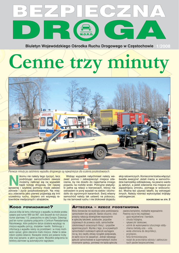 1 Biuletyn Wojewódzkiego Ośrodka Ruchu Drogowego w Częstochowie 1/2008 Cenne trzy minuty Pierwsze minuty po zaistnieniu wypadku drogowego są najważniejsze dla ocalenia poszkodowanych. ikomu nie należy tego życzyć, lecz podróżując samochodem zawsze możemy natknąć się na wypadek bądź kolizję drogową. Od naszej sprawnej i szybkiej pomocy może zależeć zdrowie i życie poszkodowanych. Na miejscu zdarzenia jako pierwsi pojawiają się inni uczestnicy ruchu, dopiero oni wzywają ratowników medycznych i strażaków. N KOGO Widząc wypadek natychmiast należy wezwać pomoc i zabezpieczyć miejsce zdarzenia, by nie doszło do najechania innego pojazdu na rozbite wraki. Policyjne statystyki pełne są relacji o kierowcach, którzy nie ostrzeżeni w porę wpadali na siebie i dochodziło do ogromnych karamboli. Swój własny samochód należy tak ustawić na poboczu, by nie tamował ruchu i nie blokował dojazdu POWIADAMIAĆ ? Jeszcze kilka lat temu informacje o wypadku na drodze przekazywano pod numer 999 lub 997, dziś doszedł do nich jeszcze numer alarmowy 112, powszechny w całej Europie. Dzwoniąc pod ten numer uzyskamy połączenie z Centrum Powiadamiania Ratunkowego, które podejmie dalsze działania wysyłając na miejsce wypadku policję, strażaków i karetki. Telefonując z informacją o wypadku należy się przedstawić i w miarę możliwości opisać, gdzie zdarzenie miało miejsce. Ułatwi to ratownikom szybkie dotarcie. Niezwykle istotne jest podanie liczby ofiar oraz opisanie, w jakim są stanie. Wszystkie połączenia na telefony alarmowe są automatycznie nagrywane. ekip ratowniczych. Koniecznie trzeba włączyć światła awaryjne! Jeżeli mamy w samochodzie kamizelkę odblaskową, na pewno warto ją założyć, a jeżeli zdarzenie ma miejsce po zapadnięciu zmroku, pomaga w widoczności. Można też używać latarki, by ostrzegać innych. Należy również wykorzystać trójkąty ostrzegawcze. DOKOŃCZENIE NA STR. 2 A PTECZKA – RZECZ PODSTAWOWA Wielu kierowców nie wyobraża sobie podróżowania zawiera kompletne, niezbędne wyposażenie. samochodem bez apteczki. Bardzo słusznie, choć Powinny się w niej znajdować: przepisy nakazują obowiązkowe wyposażenie - gaza wyjałowiona i bandaże, w apteczkę taksówek, autobusów, pojazdów - chusta trójkątna, ciężarowych do przewozu osób, samochodów - rękawiczki lateksowe, szkoleniowych oznaczonych literą L i pojazdów - ustnik do wykonywania sztucznego oddyegzaminacyjnych. Wynika z tego, że w prywatnych chania metodą usta – usta, samochodach osobowych apteczki wymagane - woda utleniona do dezynfekcji, nie są, lecz zwykły zdrowy rozsądek podpowiada, - przylepiec, że warto się w nie zaopatrzyć. Jednak nabywając - folia termoizolacyjna, apteczki samochodowe w supermarketach złudne - nożyk do przecinania odzieży i zakleszczomniemanie spokoju, ponieważ nie każda apteczka nych pasów bezpieczeństwa. 2 Pamiętajmy o prawidłowym ciśnieniu ogumienia Cenne trzy minuty DOKOŃCZENIE ZE STR. 1 Niezbędne jest sprawdzenie, czy rozbity samochód nie grozi pożarem. Dlatego trzeba wyłączyć zapłon i wyjąć kluczyki ze stacyjki, zaciągnąć ręczny hamulec. To wszystko, jeśli możliwy jest dostęp do wnętrza pojazdu. Jeżeli spod maski wydostaje się dym, lepiej nie unosić jej i nie dawać dostępu powietrza. Uważać z ogniem, ponieważ drobnych wycieków paliwa z uszkodzonej instalacji można nie spostrzec. Jeżeli drzwi są zakleszczone i trzeba wybić szybę, o wiele bezpieczniejsze dla znajdujących się w środku będzie rozbicie szyby przedniej lub tylnej – są klejone i da się je wyciągnąć niemal w całości. Szyby boczne roztrzaskują się na mnóstwo ostrych kawałków. Jeżeli osoby ranne nie wymagają reanimacji, zaś samochód nie grozi pożarem, lepiej do przyjazdu ratowników medycznych nie wyciągać rannych z rozbitego wraka i zmieniać ich pozycji. Można doprowadzić do nieodwracalnych uszkodzeń kręgosłupa. Koniecznie trzeba sprawdzić, czy nikt nie wypadł z wnętrza pojazdu w czasie zderzenia przez wybite szyby. Może leżeć nawet kilkanaście metrów dalej. Ofiary wypadków bywają często w szoku i bezwiednie oddalają się na duże odległości. W kolejnych wydaniach „Bezpiecznej Drogi” przedstawiać będziemy zasady udzielania pierwszej pomocy przedmedycznej, niezwykle istotnej w razie wypadku na drodze. Złote Trzy Minuty – tak mówi się o trzech minutach, w trakcie których koniecznie trzeba podjąć ratowanie osoby nieprzytomnej, u której ustała akcja serca. Potem dochodzi do zmian w mózgu z powodu niedokrwienia… Pamiętajmy również o tym, że pomoc ofiarom zdarzenia drogowego jest nie tylko obowiązkiem moralnym. Za nieudzielanie takiej pomocy grozi kara do 3 lat więzienia. Szkoda paliwa i opon! Większość stacji benzynowych jest wyposażona w samoobsługowe kompresory powietrzne do pompowania kół. ima wprawdzie jest taką porą roku jedynie z nazwy, lecz niższe temperatury powodują kurczenie się powietrza w oponach i zauważalny czasem spadek ciśnienia. Kierowcy nie doceniają znaczenia tego zjawiska i podróżują samochodami, których koła są po prostu zbyt nisko napompowane. Dopiero wyraźny ubytek, sygnalizowany też przez innych użytkowników dróg, powoduje, że ruszają na najbliższą stację benzynową uzupełnić powietrze w kołach, albo szukają najbliższego warsztatu wulkanizatorskiego. Tymczasem jedna z podstawowych zasad systematycznej obsługi samochodu mówi, że ciśnienie w oponach należy kontrolować tak często jak poziom oleju. Ma to bardzo wymier- Z Nosisz okulary – jedź w nich! ierowca, który w myśl zalecenia lekarza powinien prowadzić samochód w okularach, naraża się na spore nieprzyjemności w razie zatrzymania przez policję, kiedy akurat szkieł na nosie nie ma. Zalecenia medyczne znajdują się na odwrotnej stronie prawa jazdy, w rubryce nr 12. Jeżeli odczytamy w niej kod 01.01. pami