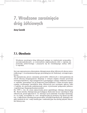 Czernik-Powiklania 07-08-:Czernik 2008-10-06 15:35 Page 105 7. Wrodzone zarośnięcie dróg żółciowych Jerzy Czernik 7.1. Określenie Wrodzone zarośnięcie dróg żółciowych polega na niedrożności przewodów zewnątrzwątrobowych, co uniemożliwia odprowadzenie żółci z wątroby do przewodu pokarmowego i przyczynia się do narastającego zastoju żółci w wątrobie. Jest ono najczęstszym schorzeniem chirurgicznym dróg żółciowych okresu noworodkowego i wczesnoniemowlęcego prowadzącym do cholestazy zewnątrzwątrobowej. Ten dynamiczny proces zarastania przewodów żółciowych o niewyjaśnionej do chwili obecnej etiopatogenezie obejmuje w różnym stopniu również przewody wewnątrzwątrobowe. Jego następstwem są postępujące zmiany włóknisto-marskie w wątrobie, prowadzące do jej krańcowej niewydolności. Celem leczenia operacyjnego wrodzonego zarośnięcia dróg żółciowych jest uzyskanie spływu żółci z wątroby do przewodu pokarmowego przez wytworzenie połączenia jelitowo-wątrobowego (hepatoportoenterostomii). Do 1959 r., tzn. do czasu opracowania przez japońskiego chirurga dziecięcego M. Kasai metody chirurgicznej pozwalającej skutecznie leczyć zarośnięcie dróg żółciowych, przed upływem 8.–12. miesiąca życia umierały wszystkie niemowlęta z tą wadą, szczególnie te z tzw. nieoperacyjną jej postacią (wg Kasai typ III), tzn. z całkowitym zarośnięciem przewodów zewnątrzwątrobowych. Istniejący niegdyś podział na tzw. wady korekcyjne i niekorekcyjne ma dzisiaj jedynie znaczenie historyczne. Czernik-Powiklania 07-08-:Czernik 2008-10-06 106 15:35 Page 106 Powikłania w chirurgii dziecięcej Jedynym skutecznym leczeniem mogącym uratować życie dziecka, a z pewnością znacznie go przedłużyć, jest leczenie operacyjne – hepatoportoenterostomia sposobem Kasai. 7.2. Epidemiologia Częstość występowania wrodzonego zarośnięcia dróg żółciowych określana jest na 1:10 000–1:12 000 żywo urodzonych noworodków z niewielką przewagą płci żeńskiej. Wada znacznie częściej występuje u rasy żółtej pomimo braku udokumentowanych czynników genetycznych. Można przyjąć, że w Polsce rodzi się rocznie 8–10 dzieci z tą anomalią rozwojową dróg żółciowych. 7.3. Rozpoznanie Wyjątkowego znaczenia nabiera jak najwcześniejsze rozpoznanie. Ustalenie przyczyn żółtaczki u noworodków i niemowląt jest jednak trudne. Wynika to z dużej liczby żółtaczek występujących w tej grupie wiekowej z przyczyn innych niż chirurgiczne. Rola czynnika czasu w tym schorzeniu jest zrozumiała ze względu na progresję procesu zarostowego obejmującego drogi żółciowe i procesu włóknisto-marskiego dotyczącego miąższu wątroby, chociaż Kimura zachęca do wykonywania operacji nawet u 5-miesięcznych niemowląt. Warto w tym miejscu zwrócić uwagę na różne rodzaje badań diagnostycznych stosowanych przez pediatrów i chirurgów dziecięcych Japonii, zaproponowanych przez Japanase Biliary Atresia Registry (JBAR). Do grupy tych badań należą: ultrasonografia, oznaczenie lipoproteiny X, badanie treści dwunastnicy na obecność kwasów żółciowych, scyntygrafia, endoskopowa cholangiopankreatografia wstępująca (ERCP), biopsja cienkoigłowa wątroby. Niemniej należy podkreślić, że wystarczającymi objawami do ustalenia rozpoznania są: objawy kliniczne, zwiększenie stężenia bilirubiny w surowicy krwi z ponad 20% obecnością bilirubiny bezpośredniej, stolce acholiczne (brak barwników żółciowych w stolcu), brak kwasów żółciowych w treści dwunastniczej. Charakterystyczne u dzieci z wrodzonym zarośnięciem dróg żółciowych jest to, że w pierwszych 3 miesiącach życia ich stan kliniczny – w odróżnieniu od dzieci z żółtaczkami na innym tle – jest dobry. W przypadku trudności diagnostycznych Czernik-Powiklania 07-08-:Czernik 2008-10-06 Wrodzone zarośnięcie dróg żółciowych 15:35 Page 107 107 w chwili obecnej można się posłużyć laparoskopią z możliwością wykonania cholangiografii* lub nawet laparotomii, która stanowi znacznie mniejsze obciążenie dla dziecka niż przedłużająca się w czasie diagnostyka i związane z tym następstwa w postaci progresji zmian obliteracyjnych w drogach żółciowych i zmian włóknisto-marskich w miąższu wątroby, o czym wspomniano wcześniej. Wartość laparoskopii diagnostycznej jest duża, tym bardziej że moment ustalenia rozpoznania jest momentem podjęcia decyzji o zabiegu radykalnym i ewentualnej konwersji. 7.4. Leczenie Istota zabiegu operacyjnego polega na dotarciu do wnęki wątroby drogą pęcherzyka żółciowego, o ile jest obecny, bądź drogą więzadła wątrobowo-dwunastniczego i jego struktur, a następnie na wycięciu zwłókniałej tkanki w poziomie żyły wrotnej wątroby (żyły bramnej), w której mogą się znajdować mikroskopijnej wielkości przewody wyprowadzające, na przygotowaniu pętli jelita sposobem Roux-Y i precyzyjnym wszyciu jelita do pierścienia tkanki łącznej, otaczającej wycięty skrawek miąższu wątroby (ryc. 7.1). Jedną z kardynalnych zasad techniki operacyjnej jest odpowiednia długość pętli odprowadzającej, wynosząca 50–70 cm. Wycięcie zwłókniałej tkanki w poziomie żyły wrotnej wątroby, a więc otwarcie mogących się znajdować w tej części wnęki wątroby szczątkowych przewodzików żółciowych łączących się z przewodzikami wewnątrzwątrobowymi, stwarza warunki ewakuacji żółci z zastoinowej wątroby do przewodu pokarmowego. Operacja Kasai (hepatoportoenterostomia) jest trudna technicznie i wymaga od operatora doskonałej znajomości anatomii wnęki wątroby, wielkiej precyzji oraz doświadczenia. Dlatego też, biorąc pod uwagę małą liczbę przypadków wrodzonego zarośnięcia dróg żółciowych w Polsce, powinna być ona wykonywana maksymalnie w 2–3 ośrodkach akademickich. 7.5. Powikłania Powikłania po operacyjnym leczeniu wrodzonego zarośnięcia dróg 