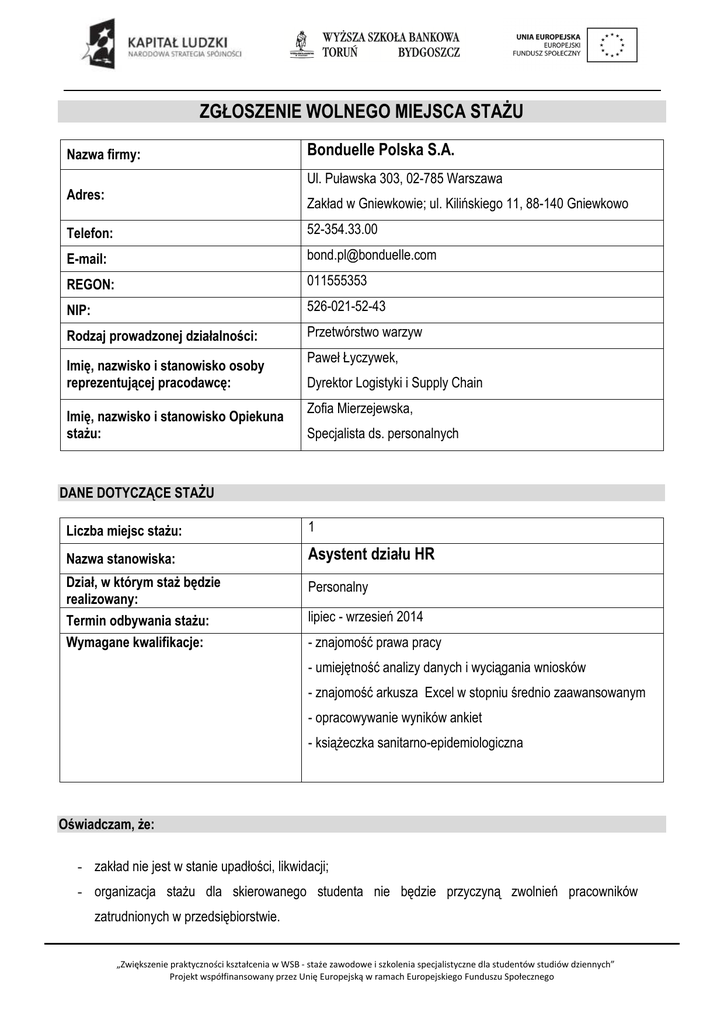 ZGŁOSZENIE WOLNEGO MIEJSCA STAŻU Nazwa firmy: Bonduelle Polska S.A. Ul. Puławska 303, 02-785 Warszawa Adres: Zakład w Gniewkowie; ul. Kilińskiego 11, 88-140 Gniewkowo Telefon: 52-354.33.00 E-mail: [email protected] REGON: 011555353 NIP: 526-021-52-43 Rodzaj prowadzonej działalności: Przetwórstwo warzyw Imię, nazwisko i stanowisko osoby reprezentującej pracodawcę: Imię, nazwisko i stanowisko Opiekuna stażu: Paweł Łyczywek, Dyrektor Logistyki i Supply Chain Zofia Mierzejewska, Specjalista ds. personalnych DANE DOTYCZĄCE STAŻU Liczba miejsc stażu: 1 Nazwa stanowiska: Asystent działu HR Dział, w którym staż będzie realizowany: Termin odbywania stażu: Wymagane kwalifikacje: Personalny lipiec - wrzesień 2014 - znajomość prawa pracy - umiejętność analizy danych i wyciągania wniosków - znajomość arkusza Excel w stopniu średnio zaawansowanym - opracowywanie wyników ankiet - książeczka sanitarno-epidemiologiczna Oświadczam, że: - zakład nie jest w stanie upadłości, likwidacji; - organizacja stażu dla skierowanego studenta nie będzie przyczyną zwolnień pracowników zatrudnionych w przedsiębiorstwie. „Zwiększenie praktyczności kształcenia w WSB - staże zawodowe i szkolenia specjalistyczne dla studentów studiów dziennych” Projekt współfinansowany przez Unię Europejską w ramach Europejskiego Funduszu Społecznego SZCZEGÓŁOWY PROGRAM STAŻU Zakres obowiązków Stażysty - pomoc we wdrażaniu pracowników sezonowych, - prowadzenie akt osobowych, - przeprowadzanie ankiet i przygotowanie prezentacji wyników, - przygotowanie rejestru szkoleń BHP i ppoż., - prace zlecone przez opiekuna stażu. Wymiar godzinowy Pełny etat (8 godzin dziennie/40 tygodniowo) Okres trwania stażu 3 miesięcy Cele edukacyjne Stażysta będzie miał możliwość zdobycia cennego doświadczenia i poznania zasad funkcjonowania działu personalnego. Zostanie wdrożony w sprawy administracyjno-kadrowe związane z zatrudnianiem nowego pracownika i prowadzeniem akt osobowych. Zdobędzie doświadczenie w tworzeniu analiz i statystyk oraz prezentacji tych wyników. Będzie przeprowadzał ankiety, porównywał wyniki, przygotowywał analizy i zaprezentuje wyniki w formie graficznej. O miejscu stażu O Bonduelle Bonduelle jest światowym graczem na rynku warzyw przetworzonych, w szczególności liderem konserw w Europie i w Kanadzie, europejskim liderem sektora paczkowanych sałat oraz odpowiednio numerem 1 w Kanadzie i numerem 3 w Europie na rynku mrożonek. Od kwietnia 2010 roku, kiedy przejął grupę France Champignons również istotnym graczem w sektorze pieczarkowym. W Polsce Bonduelle zajmuje pozycję lidera w konserwach warzywnych detalicznych oraz jest istotnym producentem na rynku gastronomicznym. Produkcja 2 zakładów, tj. fabryki w Gniewkowie k. Torunia i Ruchocicach k. Poznania trafia do Polski, na inne rynki Europy Środkowo-Wschodniej oraz do części krajów Europy Zachodniej. www.bonduelle.com.pl ………………………….. …………………..………………………………….. Miejscowość i data Podpis osoby reprezentującej i pieczątka firm „Zwiększenie praktyczności kształcenia w WSB - staże zawodowe i szkolenia specjalistyczne dla studentów studiów dziennych” Projekt współfinansowany przez Unię Europejską w ramach Europejskiego Funduszu Społecznego