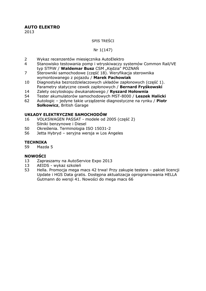 AUTO ELEKTRO 2013 SPIS TREŚCI Nr 1(147) 2 4 7 10 14 54 62 Wykaz recenzentów miesięcznika AutoElektro Stanowisko testowania pomp i wtryskiwaczy systemów Common Rail/VE typ STPiW / Waldemar Busz CSM „Kędzia" POZNAŃ Sterowniki samochodowe (część 18). Weryfikacja sterownika wymontowanego z pojazdu / Marek Pachowiak Diagnostyka bezrozdzielaczowych układów zapłonowych (część 1). Parametry statyczne cewek zapłonowych / Bernard Fryśkowski Zalety oscyloskopu dwukanałowego / Ryszard Hołownia Tester akumulatorów samochodowych MST-8000 / Leszek Halicki Autologic – jedyne takie urządzenie diagnostyczne na rynku / Piotr Sołkowicz, British Garage UKŁADY ELEKTRYCZNE SAMOCHODÓW 16 VOLKSWAGEN PASSAT - modele od 2005 (część 2) Silniki benzynowe i Diesel 50 Określenia. Terminologia ISO 15031-2 56 Jetta Hybryd – seryjna wersja w Los Angeles TECHNIKA 59 Mazda 5 NOWOŚCI 13 Zapraszamy na AutoService Expo 2013 13 AEIDS - wykaz szkoleń 53 Hella. Promocja mega macs 42 trwa! Przy zakupie testera – pakiet licencji Update i HGS Data gratis. Dostępna aktualizacja oprogramowania HELLA Gutmann do wersji 41. Nowości do mega macs 66 Nr 2(148) 3 9 12 59 62 Zima - Alternator pod szczególnym nadzorem / Włodzimierz Borkowski CSM „Kędzia” Poznań Sterowniki samochodowe (cz.19). Problematyczne kody usterek / Marek Pachowiak Diagnostyka bezrozdzielaczowych układów zapłonowych (cz.2). Analiza oscylogramów napięć i prądów w obwodzie pierwotnym / Bernard Fryśkowski Multimetr cyfrowy ST-9926 / Leszek Halicki Zastosowanie przyrządu CLT-1 do diagnozowania zaworu elektromagnetycznego sprężarek układu klimatyzacji z regulacją wydajności / Grzegorz Trawiński, Grzegorz Dyga UKŁADY ELEKTRYCZNE SAMOCHODÓW 16 Fiat Bravo. Silniki benzynowe 1.4 16V i 1.4 16V T-JET oraz Diesla 1.9 JTD 8V i 1.9 JTD 16V TECHNIKA 61 Renault: Mechaniczna strategia na rzecz redukcji emisji CO2 RADA MIESIĄCA 6 Samochód: Opel Combo C 1,7 DTI. Problem: Silnik gaśnie i/lub nie można uruchomić silnika Nr 3(149) 4 7 10 12 14 16 Zabezpieczenia antykradzieżowe w pojazdach (część 1) Kodowa blokada zapłonu koncernu PSA / Marek Pachowiak Oscyloskop w diagnostyce sieci CAN / Adrian Walaszyk OPEL 2,0 DTI Elektrozawory podciśnieniowe / Ireneusz Prochenka Uszkodzona turbosprężarka (część 1) / Stefan Myszkowski Kiedy rozrusznik nie kręci / Tomasz Maciejasz Diagnostyka bezrozdzielaczowych układów zapłonowych (część 3). Diagnostyka cewki zapłonowej od strony uzwojenia pierwotnego / Bernard Fryśkowski UKŁADY ELEKTRYCZNE SAMOCHODÓW 19 Suzuki Gran Vitara - modele od 09. 2005 Silniki benzynowe M16A i J20A oraz Diesel (część 1) TECHNIKA 41 Mitsubishi (część 1) Outlander nowej generacji - spójność + solidność =jakość 44 Nowy Lexus CT 200h 46 Nowa Kia Sportage - Ewolucja SUV - crossover 50 Mazda: Technologie SKYACTIVE NOWOŚCI 11 NGK wprowadza na rynek asortyment cewek zapłonowych AKADEMIA AUTOELEKTRO (Semestr letni) 58 Wykaz szkoleń Nr 4(150) 3 4 7 12 14 16 51 AKADEMIA AUTOELEKTRO – Wykaz szkoleń Zabezpieczenia antykradzieżowe w pojazdach (część 2) Wprowadzenie do systemów identyfikacji radiowej / Marek Pachowiak Systemy Air Bag w praktyce warsztatowej / Jarosław Olbrycht, CSM "Kędzia" Poznań Uszkodzona turbosprężarka (część 2) / Stefan Myszkowski Elektryczna pompa paliwa o elektronicznie regulowanym wydatku / Artur Chrust - szkoleniowiec Robert Bosch Sp. z o.o. Diagnostyka bezrozdzielaczowych układów zapłonowych (część 4) Metody kontroli obwodu pierwotnego podwójnej cewki zapłonowej / Bernard Fryśkowski Diagnostyka usterek chwilowych z wykorzystaniem testera diagnostycznego Solus Pro firmy Snap-on / Tomasz Urbaniak, Snap-on Diagnostics RADA MIESIĄCA 10 Pojazd: Fiat Ulisses 2,2 JTD (4Hw) Problem: komunikat o przepełnionym lub niedrożnym filtrze FAP UKŁADY ELEKTRYCZNE SAMOCHODÓW 19 Suzuki Grand Vitara - modele od 09.2005 Silniki benzynowe M16A i J20A oraz Diesel (część 2) TECHNIKA 41 Mitsubishi (część 2) OUTLANDER nowej generacji - jakość dla środowiska 45 Mazda Technologie SKYACTIVE (część 2) 54 MINI Cooper SD 49 Saga Clio NOWOŚCI 11 LAUNCH Polska Sp. z o. o Promocyjne warunki zakupu testerów diagnostycznych X-431 Master i Diagun 57 Konkurs Jubileuszowy I Spis schematów elektrycznych według marek samochodów - AutoElektro (nr 1 - nr 150) Nr 5(151) 2 5 6 9 12 16 49 RADA MIESIĄCA z Magneti Marelli Czujnik deszczu - nowe rozwiązania w systemach komfortu Wykaz szkoleń Akademii AutoElektro Zabezpieczenia antykradzieżowe w pojazdach (część 3). Architektura systemów i akwizycja danych / Marek Pachowiak Wyposażenie dydaktyczne jako środek wsparcia procesu kształcenia specjalistów elektromechaniki i elektroniki samochodowej / Włodzimierz Borkowski Termostaty z regulacją programową (część 1) / Stefan Myszkowski Diagnostyka bezrozdzielaczowych układów zapłonowych (część 5). Czas włączenia uzwojenia pierwotnego cewki zapłonowej / Bernard Fryśkowski Pompy wysokiego ciśnienia w silnikach FSI / Artur Chrust UKŁADY ELEKTRYCZNE SAMOCHODÓW 19 Opel Zafira B (część 1). Modele od 2005 do 2007 roku. Silniki benzynowe, diesla i na metan TECHNIKA 14 Bosch. Hydrauliczny napęd hybrydowy Bosch Ekonomiczne rozwiązanie i przyjemność z jazdy 42 Mitsubishi Outlander nowej generacji (część 3). Jakość dla bezpieczeństwa 46 Audi A8 hybrid. Wydajność w wielkim stylu 52 Texa - do niedawna niemożliwe! Stacje obsługi klimatyzacji KONFORT Nr 6(152) RADA MIESIĄCA 2 Pojazd: Mercedes klasa e(w211). Problem: Po obsłudze klimatyzacji, układ nie działa 5 Zabezpieczenia antykradzieżowe w pojazdach (część 4). Samochody marki Opel produkowane na rynek europejski / Marek Pachowiak 9 Czasami wystarczy prosty test / Waldemar Busz 12 Termostaty z regulacją programową (część 2) / Stefan Myszkowski 40 Diagnostyka bezrozdzielaczowych układów zapłonowych (część 6). Ograniczanie prądu uzwojenia pierwotnego cewki zapłonowej / Be