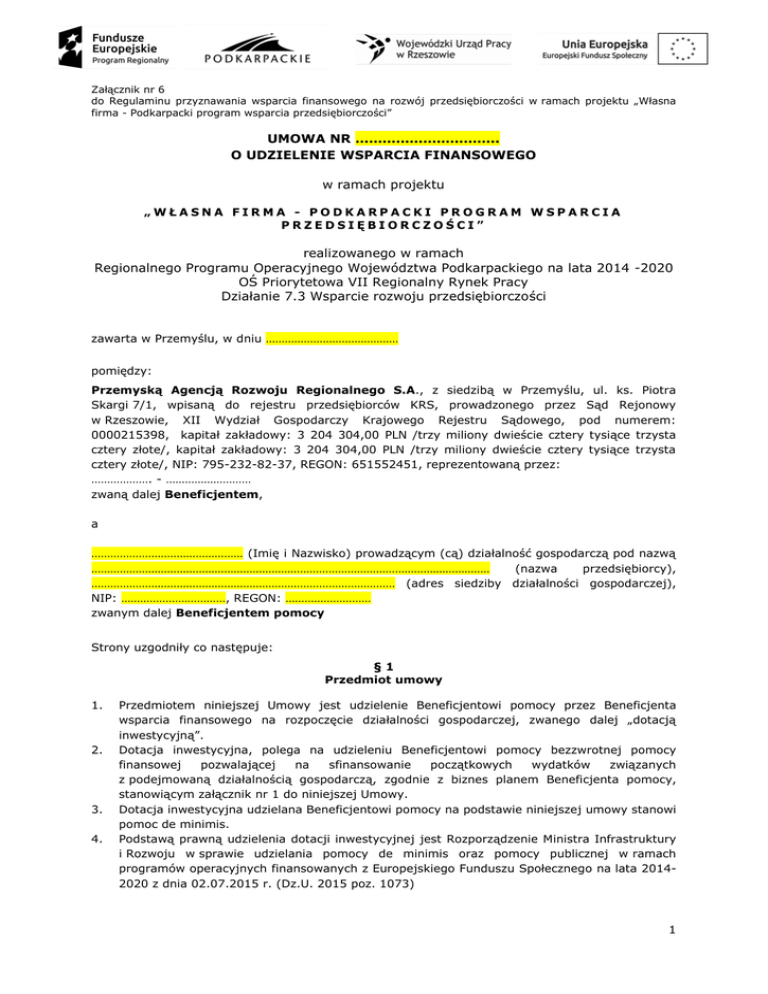 Załącznik nr 6 do Regulaminu przyznawania wsparcia finansowego na rozwój przedsiębiorczości w ramach projektu „Własna firma - Podkarpacki program wsparcia przedsiębiorczości” UMOWA NR ………………………….. O UDZIELENIE WSPARCIA FINANSOWEGO w ramach projektu „WŁASNA FIRMA - PODKARPACKI PROGRAM WSPARCIA PRZEDSIĘBIORCZOŚCI” realizowanego w ramach Regionalnego Programu Operacyjnego Województwa Podkarpackiego na lata 2014 -2020 OŚ Priorytetowa VII Regionalny Rynek Pracy Działanie 7.3 Wsparcie rozwoju przedsiębiorczości zawarta w Przemyślu, w dniu …………………………………… pomiędzy: Przemyską Agencją Rozwoju Regionalnego S.A., z siedzibą w Przemyślu, ul. ks. Piotra Skargi 7/1, wpisaną do rejestru przedsiębiorców KRS, prowadzonego przez Sąd Rejonowy w Rzeszowie, XII Wydział Gospodarczy Krajowego Rejestru Sądowego, pod numerem: 0000215398, kapitał zakładowy: 3 204 304,00 PLN /trzy miliony dwieście cztery tysiące trzysta cztery złote/, kapitał zakładowy: 3 204 304,00 PLN /trzy miliony dwieście cztery tysiące trzysta cztery złote/, NIP: 795-232-82-37, REGON: 651552451, reprezentowaną przez: ………………. - ……………………… zwaną dalej Beneficjentem, a ………………………………………… (Imię i Nazwisko) prowadzącym (cą) działalność gospodarczą pod nazwą ……………………………………………………………………………………………………………… (nazwa przedsiębiorcy), …………………………………………………………………………………… (adres siedziby działalności gospodarczej), NIP: ……………………………, REGON: ……………………… zwanym dalej Beneficjentem pomocy Strony uzgodniły co następuje: §1 Przedmiot umowy 1. 2. 3. 4. Przedmiotem niniejszej Umowy jest udzielenie Beneficjentowi pomocy przez Beneficjenta wsparcia finansowego na rozpoczęcie działalności gospodarczej, zwanego dalej „dotacją inwestycyjną”. Dotacja inwestycyjna, polega na udzieleniu Beneficjentowi pomocy bezzwrotnej pomocy finansowej pozwalającej na sfinansowanie początkowych wydatków związanych z podejmowaną działalnością gospodarczą, zgodnie z biznes planem Beneficjenta pomocy, stanowiącym załącznik nr 1 do niniejszej Umowy. Dotacja inwestycyjna udzielana Beneficjentowi pomocy na podstawie niniejszej umowy stanowi pomoc de minimis. Podstawą prawną udzielenia dotacji inwestycyjnej jest Rozporządzenie Ministra Infrastruktury i Rozwoju w sprawie udzielania pomocy de minimis oraz pomocy publicznej w ramach programów operacyjnych finansowanych z Europejskiego Funduszu Społecznego na lata 20142020 z dnia 02.07.2015 r. (Dz.U. 2015 poz. 1073) 1 5. W dniu podpisania niniejszej umowy Beneficjentowi pomocy zostanie wydane zaświadczenie o udzielonej pomocy de minimis. 6. Jeżeli w wyniku rozliczenia dotacji inwestycyjnej Beneficjent pomocy przedstawi dokumenty świadczące o wykorzystaniu mniejszej kwoty dotacji, niż wartość zapisana w zaświadczeniu, Beneficjent zobligowany jest do wydania zaktualizowanego zaświadczenia o przyznaniu pomocy objętej zasadą de minimis. 7. Beneficjent pomocy otrzymuje dotację inwestycyjną na zasadach i warunkach określonych w niniejszej umowie oraz załącznikach, które stanowią integralną część umowy. 8. Beneficjent pomocy zobowiązuje się do wykorzystania dotacji inwestycyjnej zgodnie z biznes planem stanowiącym załącznik nr 1 do niniejszej umowy, w szczególności z harmonogramem rzeczowo-finansowym wydatkowania środków finansowych na rozwój przedsiębiorczości będącym integralną częścią biznes planu. 9. W sytuacji, gdy w biznes planie stanowiącym załącznik do niniejszej umowy, uczestnik projektu zadeklarował powstanie miejsc pracy, celem udokumentowania wywiązania się z powyższego zobowiązania, Beneficjent pomocy zobowiązany będzie w terminie 7 dni kalendarzowych od podpisania umowy o pracę z pracownikiem dostarczyć do Beneficjenta potwierdzoną za zgodność oryginałem kopie tej umowy oraz dokumenty potwierdzające zgłoszenia pracownika do ZUS. Po upływie zadeklarowanego okresu zatrudnienia pracownika, Beneficjent pomocy zobowiązany będzie do dostarczenia Beneficjentowi kopii deklaracji DRA wraz z załącznikami potwierdzającymi zatrudnienie pracownika przez zadeklarowany okres. 10. Beneficjent pomocy zobowiązany jest przechowywać dokumentację związaną z otrzymaną dotacją przez okres 10 lat, licząc od dnia podpisania niniejszej umowy. §2 Finansowanie dotacji i płatności 1. 2. 3. 4. 5. 6. 7. 8. Całkowite wydatki inwestycyjne związane z przedsięwzięciem wynoszą brutto ................... PLN (słownie: …………………………………………………………………………… PLN). Kwota dotacji inwestycyjnej wynosi …………… PLN (słownie: ………………………………………………………………………PLN). Beneficjent wypłaci Beneficjentowi pomocy kwotę dotacji, o której mowa w ust. 2 w następujący sposób: 1) zaliczka w wysokości 90% kwoty dotacji, tj. ………… PLN (słownie: .........................................……………… PLN), zostanie wypłacona w terminie do 7 kalendarzowych po podpisaniu niniejszej umowy, z zastrzeżeniem § 4 ust 2 oraz pod warunkiem dostępności środków na rachunku bankowym Beneficjenta wyodrębnionym dla potrzeb realizacji projektu. 2) płatność końcowa (uzupełniająca) w formie refundacji poniesionych przez Beneficjenta pomocy całkowitych wydatków na realizację inwestycji, w wysokości nie większej niż 10% kwoty dotacji, tj. ……………… PLN (słownie: .................................................... PLN), wypłacona zostanie niezwłocznie po zatwierdzeniu przez Beneficjenta całkowitego rozliczenia inwestycji objętej dotacją, pod warunkiem dostępności środków na rachunku bankowym Beneficjenta. Beneficj