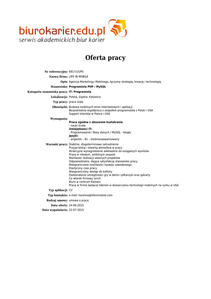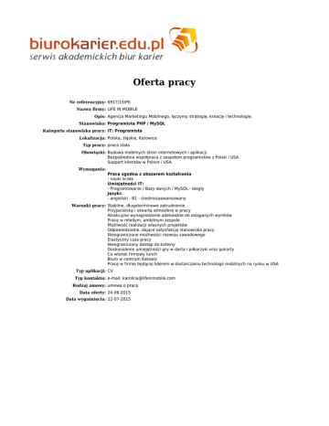 Oferta pracy Nr referencyjny: 6917/15/PS Nazwa firmy: LIFE IN MOBILE Opis: Agencja Marketingu Mobilnego, łączymy strategię, kreację i technologię. Stanowisko: Programista PHP / MySQL Kategoria stanowiska pracy: IT: Programista Lokalizacja: Polska, śląskie, Katowice Typ pracy: praca stała Obowiązki: Budowa mobilnych stron internetowych i aplikacji Bezpośrednia współpraca z zespołem programistów z Polski i USA Support klientów w Polsce i USA Wymagania: Praca zgodna z obszarem kształcenia - nauki ścisłe Umiejętności IT: - Programowanie / Bazy danych / MySQL - biegły Języki: - angielski - B1 - średniozaawansowany Warunki pracy: Stabilne, długoterminowe zatrudnienie Przyjacielską i otwartą atmosferę w pracy Atrakcyjne wynagrodzenie adekwatne do osiąganych wyników Pracę w młodym, ambitnym zespole Możliwość realizacji własnych projektów Odpowiedzialne, dające satysfakcję stanowisko pracy Nieograniczone możliwości rozwoju zawodowego Elastyczny czas pracy Nieograniczony dostęp do kofeiny Doskonalenie umiejętności gry w darta i piłkarzyki oraz gokarty Co wtorek firmowy lunch Biuro w centrum Katowic Pracę w firmie będącej liderem w dostarczaniu technologii mobilnych na rynku w USA Typ aplikacji: CV Typ kontaktu: e-mail: [email protected] Rodzaj umowy: umowa o pracę Data oferty: 24-06-2015 Data wygaśnięcia: 22-07-2015
