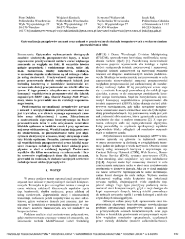 Piotr Delebis Wojciech Kmiecik Krzysztof Walkowiak Jacek Rak Politechnika Wrocławska Politechnika Wrocławska Politechnika Wrocławska Politechnika Gdańska Wyb. Wyspiańskiego 27 Wyb. Wyspiańskiego 27 Wyb. Wyspiańskiego 27 ul.Narutowicza 11/12 80-233 Gdańsk 50-370 Wrocław 50-370 Wrocław 50-370 Wrocław [email protected] [email protected] [email protected] [email protected] Optymalizacja przepływów anycast oraz unicast w przeżywalnych sieciach komputerowych z wykorzystaniem przeszukiwania tabu Streszczenie: Optymalne wykorzystanie dostępnych zasobów sieciowych, przepustowości łączy, a także zapewnienie przeżywalności nabiera coraz większego znaczenia ze względu na fakt, iż wszystkie istotne gałęzie gospodarki i codziennego życia, takie jak m.in. bankowość, służby ratunkowe, edukacja, w szerokim stopniu uzależnione są od różnego rodzaju usług sieciowych. Przeżywalność zapewniana poprzez generowanie dwóch rozłącznych ścieżek jest techniką kosztowną w kontekście konieczności rezerwowania dużej przepustowości na ścieżki alternatywne. Z tego powodu zdecydowano o zastosowaniu koncepcji współdzielenia przepustowości dla ścieżek zapasowych SBPP (ang. Shared Backup Path Protection), która to prowadzić ma do redukcji wspomnianego kosztu. Problematyka optymalizacji przepływów anycast i unicast z uwzględnieniem przeżywalności sieci nie jest trywialna, a w efekcie wymaga ogromnych zasobów mocy obliczeniowej i czasu. Zdecydowano o zastosowaniu algorytmu heurystycznego na bazie przeszukiwania tabu w celu otrzymania rezultatów bliskich optimum w krótkim czasie i przy ograniczonej mocy obliczeniowej. Wyniki badań dają podstawy do stwierdzenia, że przeszukiwanie tabu jest algorytmem efektywnym czasowo, który otrzymuje rezultaty bliskie optimum. Ponadto, zastosowanie koncepcji współdzielenia przepustowości przez ścieżki zapasowe znacząco redukuje średni koszt alokacji przepływów w sieci o ustalonej topologii. Porównanie wyników dla kilku scenariuszy rozmieszczenia i liczby serwerów replikujących dane dla żądań anycast, prowadzi do wniosku, że dodanie kolejnych serwerów redukuje koszt alokacji przepływów. 1. WSTĘP W pracy podjęto temat optymalizacji przepływów anycast oraz unicast w przeżywalnych sieciach komputerowych. Tematyka ta jest szczególnie istotna z uwagi na coraz większą zależność kluczowych aspektów życia (np. bankowość, służba medyczna, praca zdalna) od usług sieciowych. Zapewnienie stałej i niezawodniej transmisji, zwłaszcza jeżeli rozpatrywane są sieci szkieletowe, gdzie wolumen danych jest znaczny, jest konieczne w kontekście ewentualnie poniesionych w skutek awarii kosztów biznesowych, czy też nakładów na bezpieczeństwo. Poddano analizie sieci zorientowane połączeniowo, gdyż zaobserwowano znaczący wzrost ich znaczenia, np. stosowanie technik MultiProtocol Label Switching (MPLS) i Dense Wavelength Division Multiplexing (DWDM), spowodowane łatwiejszą możliwością zarządzania ruchem (QoS) [1]. Postulowaną niezawodność uzyskano poprzez wyznaczenie dla każdego z żądań dwóch rozłącznych ścieżek: podstawowej i zapasowej. Długości ścieżek zapasowych są zazwyczaj znacznie większe od długości analizowanych ścieżek podstawowych. Skutkuje to koniecznością zarezerwowania w celu zapewnienia niezawodności znacznej przepustowości względem przepustowości już zaalokowanej do standardowej realizacji żądań. W tej perspektywie cenne staje się rozważenie koncepcji prowadzącej do redukcji tego zjawiska, a przez to do znaczącego zmniejszenia kosztów całego rozwiązania. Stąd też zdecydowano się rozważyć koncepcję współdzielenia przepustowości dla ścieżek zapasowych (SBPP), która okazuje się być efektywnym rozwiązaniem, gdy tylko zawęzimy rozpatrywane scenariusze awarii elementów sieci do tych najbardziej prawdopodobnych. Jej podstawową wadą jest jednak złożoność obliczeniowa, która ograniczała uzyskanie rezultatów do sieci o małym rozmiarze [2]. Z tego powodu, celowym stało się zaprojektowanie algorytmu, który pozwalałby na uzyskanie aproksymacji wyników odpowiednio blisko odległych od rezultatów optymalnych w zadanym czasie. Dotychczasowe rozważania koncepcji SBPP w literaturze opierały się głównie na żądaniach unicast, w pracy poszerzono tą dyskusję o uwzględnienie transmisji jeden-do-jednego-z-wielu (anycast). Obecnie coraz więcej usług sieciowych korzysta z anycastingu, np. Content Delivery Network (CDN), Web Service, Domain Name Service (DNS), systemy peer-to-peer (P2P), video streaking, sieci czujników, czy sieci nakładkowe [3],[4]. Anycast może być stosowany również w celu zmniejszenia natężenia ruchu w sieci oraz zredukowania opóźnienia w dostawie danych. Jako że w sieci znajduje się wiele serwerów replikujących te same informacje, zatem koszt dostępu do nich maleje. Wyboru można dokonywać według wielu kryteriów (np. lokalizacji serwera repliki), obejmujących wiele aspektów (np. jakość usług). Tego typu przepływy podnoszą niezawodność sieci komputerowych, gdyż z racji dostępu do kopii zapasowych danych, istnieją ścieżki prowadzące do różnych serwerów replik i awaria któregoś z nich nie czyni danych nieosiągalnymi. Głównym celem pracy było opracowanie oraz implementacja algorytmu heurystycznego rozwiązującego problem optymalizacji przepływów unicast i anycast w przeżywalnych sieciach komputerowych, oraz jego analiza w kontekście porównania otrzymywanych wyników względem rezultatów optymalnych, uzyskanych przez metody dokładne (modele całkowitoliczbowe). PRZEGLĄD TELEKOMUNIKACYJNY * ROCZNIK LXXXVI * i WIADOMOŚCI TELEKOMUNIKACYJNE * ROCZNIK LXXXII * nr 8-9/2013 939 Zdecydowano, że przedstawiona zostanie koncepcja algorytmu nawiązująca do metody przeszukiwania tabu. Rozdział 2 zawiera przegląd literaturowy związany z tematyką optymalizacji prze