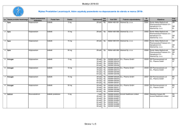 Biuletyn 2016-03 Wykaz Produktów Leczniczych, które uzyskały pozwolenie na dopuszczenie do obrotu w marcu 2016r. Lp. Nazwa produktu leczniczego 1 2 3 Apra Apra Apra Nazwa powszechnie stosowana Aripiprazolum Aripiprazolum Aripiprazolum Postać farm. tabletki tabletki tabletki Dawka Kat. dost. 28 tabl. Rp Opakowanie 5 mg 10 mg 28 tabl. 15 mg 28 tabl. Rp Rp Kod EAN Podmiot odpowiedzialny 5906414001051 Adamed Sp. z o.o. 5906414001068 Adamed Sp. z o.o. 5906414001075 Adamed Sp. z o.o. Nr Wytwórca pozw. 23061 Rontis Hellas Medical and Pharmaceutical Products S.A. Genepharm S.A. Adamed Sp. z o.o. Kraj wytw. GR 23062 Rontis Hellas Medical and Pharmaceutical Products S.A. Genepharm S.A. Adamed Sp. z o.o. GR 23063 Rontis Hellas Medical and Pharmaceutical Products S.A. Genepharm S.A. Adamed Sp. z o.o. GR GR PL GR PL GR PL 4 Apra Aripiprazolum tabletki 30 mg 28 tabl. Rp 5906414001082 Adamed Sp. z o.o. 23064 Rontis Hellas Medical and Pharmaceutical Products S.A. Genepharm S.A. Adamed Sp. z o.o. GR GR PL 5 Aricogan Aripiprazolum tabletki 5 mg 28 tabl. 30 tabl. 56 tabl. 60 tabl. Rp Rp Rp Rp 5909991265427 G.L. Pharma GmbH 5909991265434 5909991265441 5909991265458 23035 GE Pharmaceuticals Ltd G.L. Pharma GmbH BG AT 6 Aricogan Aripiprazolum tabletki 10 mg 28 tabl. 30 tabl. 56 tabl. 60 tabl. Rp Rp Rp Rp 5909991265465 G.L. Pharma GmbH 5909991265472 5909991265489 5909991265496 23036 GE Pharmaceuticals Ltd G.L. Pharma GmbH BG AT 7 Aricogan Aripiprazolum tabletki 15 mg 28 tabl. 30 tabl. 56 tabl. 60 tabl. Rp Rp Rp Rp 5909991265526 G.L. Pharma GmbH 5909991265533 5909991265540 5909991265557 23037 GE Pharmaceuticals Ltd G.L. Pharma GmbH BG AT 8 Aricogan Aripiprazolum tabletki 30 mg 28 tabl. 30 tabl. 56 tabl. 60 tabl. Rp Rp Rp Rp 5909991265564 G.L. Pharma GmbH 5909991265571 5909991265588 5909991265595 23038 GE Pharmaceuticals Ltd G.L. Pharma GmbH BG AT 9 Astrium Rosuvastatinum tabletki powlekane 5 mg 7 tabl. 28 tabl. 30 tabl. 60 tabl. 84 tabl. 90 tabl. 98 tabl. Rp Rp Rp Rp Rp Rp Rp 5909991264833 Accord Healthcare Limited 5909991264840 5909991264857 5909991264864 5909991264871 5909991264888 5909991264895 23040 Wessling Hungary Kft. Accord Healthcare Limited HU GB Strona 1 z 5 Biuletyn 2016-03 Nazwa powszechnie Lp. Nazwa produktu leczniczego stosowana 10 Astrium Rosuvastatinum Postać farm. Dawka Opakowanie 7 tabl. 28 tabl. 30 tabl. 60 tabl. 84 tabl. 90 tabl. 98 tabl. 100 tabl. Kat. dost. Rp Rp Rp Rp Rp Rp Rp Rp Nr Wytwórca pozw. 23041 Wessling Hungary Kft. Accord Healthcare Limited Kraj wytw. HU GB tabletki powlekane 10 mg 5909991264901 Accord Healthcare Limited 5909991264918 5909991264925 5909991264932 5909991264949 5909991264956 5909991264963 5909991264970 11 Astrium Rosuvastatinum tabletki powlekane 20 mg 7 tabl. 28 tabl. 30 tabl. 60 tabl. 84 tabl. 90 tabl. 98 tabl. 100 tabl. Rp Rp Rp Rp Rp Rp Rp Rp 5909991264987 Accord Healthcare Limited 5909991264994 5909991265007 5909991265014 5909991265021 5909991265038 5909991265045 5909991265052 23042 Wessling Hungary Kft. Accord Healthcare Limited HU GB 12 Astrium Rosuvastatinum tabletki powlekane 40 mg 7 tabl. 28 tabl. 30 tabl. 60 tabl. 90 tabl. 98 tabl. 100 tabl. Rp Rp Rp Rp Rp Rp Rp 5909991265069 Accord Healthcare Limited 5909991265076 5909991265083 5909991265090 5909991265106 5909991265113 5909991265120 23043 Wessling Hungary Kft. Accord Healthcare Limited HU GB 13 Bendamustine Zentiva Bendamustini hydrochloridum proszek do sporządzania koncentratu do roztworu do infuzji 2,5 mg/ml 1 fiol. 25 mg 1 fiol. 100 mg 5 fiol. 25 mg 5 fiol. 100 mg 10 fiol. 25 mg 20 fiol. 25 mg Rp Rp Rp Rp Rp Rp 5909991267261 Zentiva, k.s. 5909991267278 5909991267292 5909991267285 5909991267308 5909991267315 23050 Synthon Hispania S.L. Synthon s.r.o. ES CZ 14 Brinzolamide Actavis Brinzolamidum krople do oczu, zawiesina 10 mg/ml 1 butelka 5 ml 3 butelki 5 ml Rp Rp 5909991260453 Actavis Group PTC ehf. 5909991261986 23051 Lusomedicamenta Sociedade Tecnica Farmaceutica, S.A. PT 15 Calcium Folinate Kabi Calcii folinas roztwór do wstrzykiwań lub infuzji 10 mg/ml 1 fiol. 5 ml 1 fiol. 10 ml 1 fiol. 20 ml 1 fiol. 35 ml 1 fiol. 50 ml 1 fiol. 100 ml 5 fiol. 5 ml 5 fiol. 10 ml 5 fiol. 20 ml 5 fiol. 35 ml 5 fiol. 50 ml 5 fiol. 100 ml 10 fiol. 5 ml 10 fiol. 10 ml 10 fiol. 20 ml 10 fiol. 35 ml 10 fiol. 50 ml 10 fiol. 100 ml Rp Rp Rp Rp Rp Rp Rp Rp Rp Rp Rp Rp Rp Rp Rp Rp Rp Rp 5909991267339 Fresenius Kabi Deutschland 5909991267360 GmbH 5909991267353 5909991267377 5909991267346 5909991267322 5909991267391 5909991267384 5909991267407 5909991267414 5909991267438 5909991267421 5909991267476 5909991267452 5909991267483 5909991267469 5909991267445 5909991267490 23059 Fresenius Kabi Austria GmbH AT Strona 2 z 5 Kod EAN Podmiot odpowiedzialny Biuletyn 2016-03 Nazwa powszechnie Lp. Nazwa produktu leczniczego stosowana 16 Duloxetine Sandoz Duloxetinum Dawka Opakowanie kapsułki dojelitowe, twarde 30 mg 7 kaps. 14 kaps. 28 kaps. 30 kaps. 50 kaps. 56 kaps. 84 kaps. 98 kaps. Kat. dost. Rp Rp Rp Rp Rp Rp Rp Rp 7 kaps. 14 kaps. 28 kaps. 30 kaps. 50 kaps. 56 kaps. 84 kaps. 98 kaps. 10 tabl. 20 tabl. 30 tabl. 60 tabl. 90 tabl. 60 tabl. Rp Rp Rp Rp Rp Rp Rp Rp Rp Rp Rp Rp Rp Rp 5909991265243 Sandoz GmbH 5909991265250 5909991265267 5909991265274 5909991265281 5909991265298 5909991265304 5909991265311 5909991267216 Krka, d.d., Novo mesto 5909991267223 5909991267230 5909991267247 5909991267254 5909991267155 Actavis Group PTC ehf. 23030 Salutas Pharma GmbH DE Pharmathen S.A. GR Pharmathen International S.A. GR 30 tabl. 60 tabl. Rp Rp Postać farm. 17 Duloxetine Sandoz Duloxetinum kapsułki dojelitowe, twarde 60 mg 18 Gliclada Gliclazidum tabletki o przedłużonym uwalnianiu 90 mg 19 Gliclazide Sigillata Gliclazidum 30 mg 20 Gliclazide Sigillata Gliclazidum 21 Ibured Ibuprofenum tabletki o zmodyfikowanym uwalnianiu tabletki o zmodyfikowanym uwalnianiu żel 22 Ibured Forte Ibuprofenum żel 23 Lidiam Lidocainum krem 24 Mucosolvan Max Ambroxoli hydrochloridum kapsułki o przedłużonym uwalnianiu, twarde Pemetrexedum koncentrat d