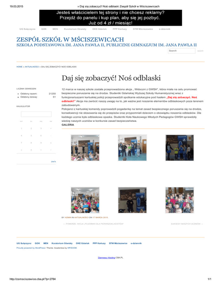19.03.2015 » Daj się zobaczyć! Noś odblaski Zespół Szkół w Mściszewicach UG Sulęczyno GOK MEN Kuratorium Oświaty OKE Gdańsk PPP Kartuzy STW Mściszewice edziennik ZESPÓŁ SZKÓŁ W MŚCISZEWICACH SZKOŁA PODSTAWOWA IM. JANA PAWŁA II, PUBLICZNE GIMNAZJUM IM. JANA PAWŁA II Search search HOME » AKTUALNOŚCI » DAJ SIĘ ZOBACZYĆ! NOŚ ODBLASKI Daj się zobaczyć! Noś odblaski LICZNIK ODWIEDZIN 12 marca w naszej szkole została przeprowadzona akcja „ Widoczni z GWSH”, która miała na celu promować Odsłony razem: 21250 Odsłony dzisiaj: 61 bezpieczne poruszanie się na drodze. Studentki Gdańskiej Wyższej Szkoły Humanistycznej wraz z funkcjonariuszami kartuskiej policji przeprowadzili spotkanie edukacyjne pod hasłem „Daj się zobaczyć. Noś odblaski!” Akcja ma zwrócić naszą uwagę na to, jak ważne jest noszenie elementów odblaskowych poza terenem zabudowanym. KALKULATOR Policjanci z kartuskiej komendy poprowadzili pogadankę na temat zasad bezpiecznego poruszania się na drodze, konsekwencji nie stosowania się do przepisów oraz przypomnieli dzieciom o obowiązku noszenia odblasków. Dla każdego ucznia była odblaskowa opaska. Studentki Koła Naukowego Młodych Pedagogów GWSH sprawdziły m+ m mc mr 1 2 3 + 4 5 6 7 8 9 x c 0 = / wiedzę naszych uczniów w konkursie zasad bezpieczeństwa. GALERIA Joe's BY ADMIN IN AKTUALNOŚCI ON 17 MARCA 2015. ← POMORZE: AKCJA „POJEMNIKI DLA PIERWSZOKLASISTÓW” UG Sulęczyno GOK MEN Kuratorium Oświaty OKE Gdańsk PPP Kartuzy STW Mściszewice SUKCESY NASZYCH UCZNIÓW → edziennik Proudly powered by WordPress / Theme: Academica by WPZOOM. Darmowy Hosting CBA.PL http://zsmsciszewice.cba.pl/?p=2784 1/1