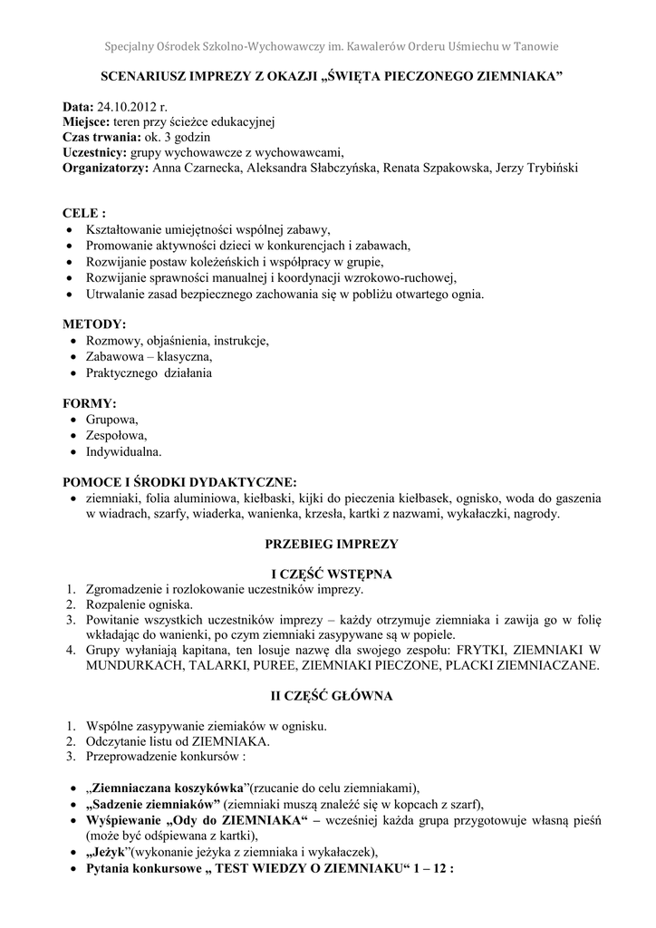 Specjalny Ośrodek Szkolno-Wychowawczy im. Kawalerów Orderu Uśmiechu w Tanowie SCENARIUSZ IMPREZY Z OKAZJI „ŚWIĘTA PIECZONEGO ZIEMNIAKA” Data: 24.10.2012 r. Miejsce: teren przy ścieżce edukacyjnej Czas trwania: ok. 3 godzin Uczestnicy: grupy wychowawcze z wychowawcami, Organizatorzy: Anna Czarnecka, Aleksandra Słabczyńska, Renata Szpakowska, Jerzy Trybiński CELE : Kształtowanie umiejętności wspólnej zabawy, Promowanie aktywności dzieci w konkurencjach i zabawach, Rozwijanie postaw koleżeńskich i współpracy w grupie, Rozwijanie sprawności manualnej i koordynacji wzrokowo-ruchowej, Utrwalanie zasad bezpiecznego zachowania się w pobliżu otwartego ognia. METODY: Rozmowy, objaśnienia, instrukcje, Zabawowa – klasyczna, Praktycznego działania FORMY: Grupowa, Zespołowa, Indywidualna. POMOCE I ŚRODKI DYDAKTYCZNE: ziemniaki, folia aluminiowa, kiełbaski, kijki do pieczenia kiełbasek, ognisko, woda do gaszenia w wiadrach, szarfy, wiaderka, wanienka, krzesła, kartki z nazwami, wykałaczki, nagrody. PRZEBIEG IMPREZY I CZĘŚĆ WSTĘPNA 1. Zgromadzenie i rozlokowanie uczestników imprezy. 2. Rozpalenie ogniska. 3. Powitanie wszystkich uczestników imprezy – każdy otrzymuje ziemniaka i zawija go w folię wkładając do wanienki, po czym ziemniaki zasypywane są w popiele. 4. Grupy wyłaniają kapitana, ten losuje nazwę dla swojego zespołu: FRYTKI, ZIEMNIAKI W MUNDURKACH, TALARKI, PUREE, ZIEMNIAKI PIECZONE, PLACKI ZIEMNIACZANE. II CZĘŚĆ GŁÓWNA 1. Wspólne zasypywanie ziemiaków w ognisku. 2. Odczytanie listu od ZIEMNIAKA. 3. Przeprowadzenie konkursów : „Ziemniaczana koszykówka”(rzucanie do celu ziemniakami), „Sadzenie ziemniaków” (ziemniaki muszą znaleźć się w kopcach z szarf), Wyśpiewanie „Ody do ZIEMNIAKA“ – wcześniej każda grupa przygotowuje własną pieśń (może być odśpiewana z kartki), „Jeżyk”(wykonanie jeżyka z ziemniaka i wykałaczek , Pytania konkursowe „ TEST WIEDZY O ZIEMNIAKU“ 1 – 12 : Specjalny Ośrodek Szkolno-Wychowawczy im. Kawalerów Orderu Uśmiechu w Tanowie Czy łodyga i liście ziemniaka są trujące? - odp: TAK, Jak nazywa się proste narzędzie do kopania ziemniaków? – odp: MOTYKA, Kiedy sadzimy ziemniaki? – odp: WIOSNĄ, Jak nazywa się zbiór ziemniaków i kiedy się odbywa? – odp: WYKOPKI, JESIENIĄ, W jakiej postaci można spożywać ziemniaki? – odp: GOTOWANE, SMAŻONE, PIECZONE, ZAPIEKANE 6. Jak nazywa się mąka zrobiona z ziemniaków? – odp: MĄKA ZIEMNIACZANA 7. Jak nazywa się owad żerujący na liściach ziemniaka? - odp: STONKA 8. Wymień dwie potrawy z ziemniaków? 9. Wymień inne nazwy ziemniaka używane w języku polskim? 10. Skąd pochodzi ziemniak? – odp: AMERYKA POŁUDNIOWA, PERU, 11. Kto sprowadził ziemniaka do Polski, który z królów? – odp: JAN III SOBIESKI, 12. Jak nazywa się jadalna część ziemniaka? – odp: BULWA 1. 2. 3. 4. 5. Wspólne pieczenie kiełbasek, wyjęcie ziemniaków z ogniska, wspólny posiłek. III CZĘŚĆ KOŃCOWA Podsumowanie i podziękowania. Wspólne sprzątanie terenu, bezpieczne gaszenie ogniska. Pożegnanie. List od Ziemniaka Tanowo, dn. 24.X.2012 r. Kochane dzieci z Tanowa ! To ja Ziemniak. Kłaniam się Wam nisko. Będziecie dziś obchodzić moje święto, bo jestem przecież bardzo popularny. A wiecie skąd pochodzę? Zostałem przywieziony, a raczej przypłynąłem z Ameryki Południowej, a konkretnie z Peru, gdzie uprawiali mnie Indianie. Około 500 lat temu przywędrowałem, znowu to przywędrowałem, a tak naprawdę, jak wspomniałem wcześniej przypłynąłem z panem Krzysztofem Kolumbem (wielkim żeglarzem do Europy. Początkowo stosowano mnie jako lekarstwo, a moje kwiaty wykorzystywano do układania bukietów. Do Polski sprowadził mnie król Jan III Sobieski w XVII w. Wtedy przekonywano się do mnie dość długo. Na początku uważano bowiem, że szkodzę zdrowiu. A przecież obecnie goszczę niemal codziennie na Waszych stołach. Mogę być gotowany, smażony i pieczony. Możecie mnie jeść jako frytki lub chipsy, jestem w różnych sałatkach jarzynowych. Teraz właśnie mamy czas zbioru ziemniaków czyli wykopki. Dawniej, w wielu wsiach z tej okazji świętowano. Przywróćmy dawne tradycje i świętujmy wspólnie ! Życzę Wam przyjemnej zabawy. Wasz Kartofel.