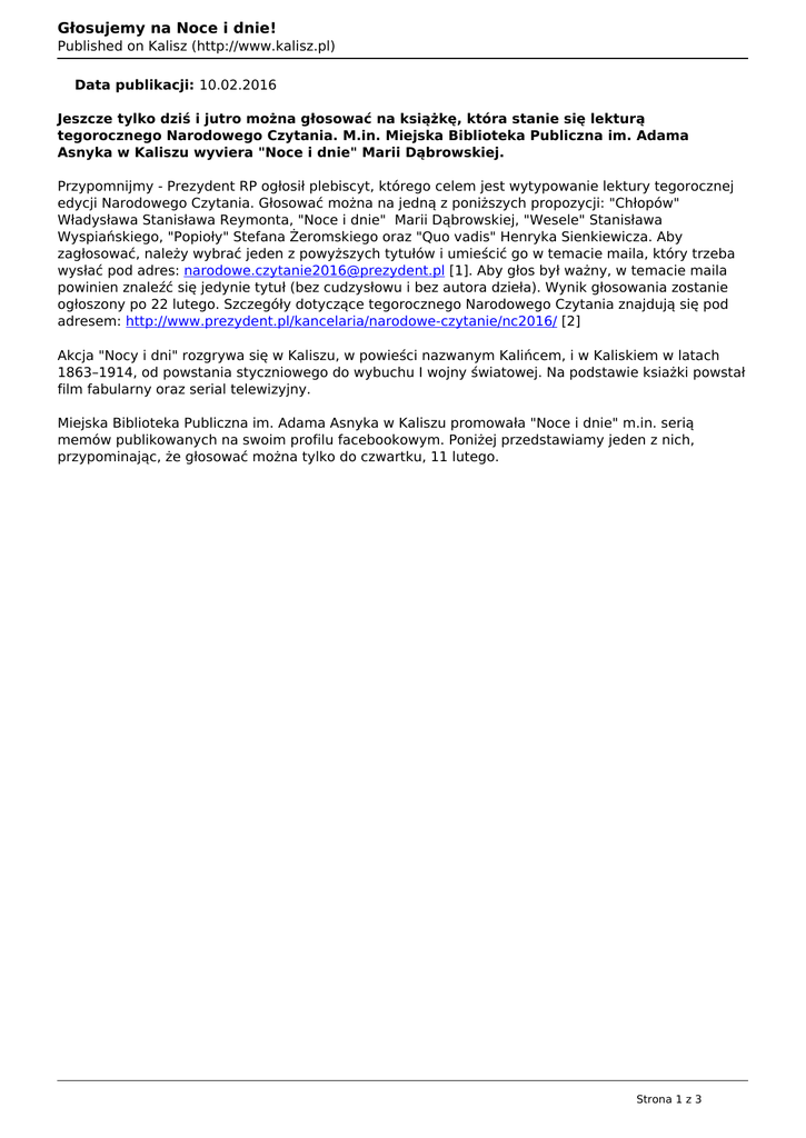 Głosujemy na Noce i dnie! Published on Kalisz (http://www.kalisz.pl) Data publikacji: 10.02.2016 Jeszcze tylko dziś i jutro można głosować na książkę, która stanie się lekturą tegorocznego Narodowego Czytania. M.in. Miejska Biblioteka Publiczna im. Adama Asnyka w Kaliszu wyviera "Noce i dnie" Marii Dąbrowskiej. Przypomnijmy - Prezydent RP ogłosił plebiscyt, którego celem jest wytypowanie lektury tegorocznej edycji Narodowego Czytania. Głosować można na jedną z poniższych propozycji: "Chłopów" Władysława Stanisława Reymonta, "Noce i dnie" Marii Dąbrowskiej, "Wesele" Stanisława Wyspiańskiego, "Popioły" Stefana Żeromskiego oraz "Quo vadis" Henryka Sienkiewicza. Aby zagłosować, należy wybrać jeden z powyższych tytułów i umieścić go w temacie maila, który trzeba wysłać pod adres: [email protected] [1]. Aby głos był ważny, w temacie maila powinien znaleźć się jedynie tytuł (bez cudzysłowu i bez autora dzieła). Wynik głosowania zostanie ogłoszony po 22 lutego. Szczegóły dotyczące tegorocznego Narodowego Czytania znajdują się pod adresem: http://www.prezydent.pl/kancelaria/narodowe-czytanie/nc2016/ [2] Akcja "Nocy i dni" rozgrywa się w Kaliszu, w powieści nazwanym Kalińcem, i w Kaliskiem w latach 1863–1914, od powstania styczniowego do wybuchu I wojny światowej. Na podstawie ksiażki powstał film fabularny oraz serial telewizyjny. Miejska Biblioteka Publiczna im. Adama Asnyka w Kaliszu promowała "Noce i dnie" m.in. serią memów publikowanych na swoim profilu facebookowym. Poniżej przedstawiamy jeden z nich, przypominając, że głosować można tylko do czwartku, 11 lutego. Strona 1 z 3 Głosujemy na Noce i dnie! Published on Kalisz (http://www.kalisz.pl) Strona 2 z 3 Głosujemy na Noce i dnie! Published on Kalisz (http://www.kalisz.pl) Tomasz Staszczyk Source URL: http://www.kalisz.pl/pl/q/aktualnosci/glosujemy-na-noce-i-dnie Odnośniki [1] mailto:[email protected] [2] http://www.prezydent.pl/kancelaria/narodowe-czytanie/nc2016/ Strona 3 z 3 Powered by TCPDF (www.tcpdf.org)