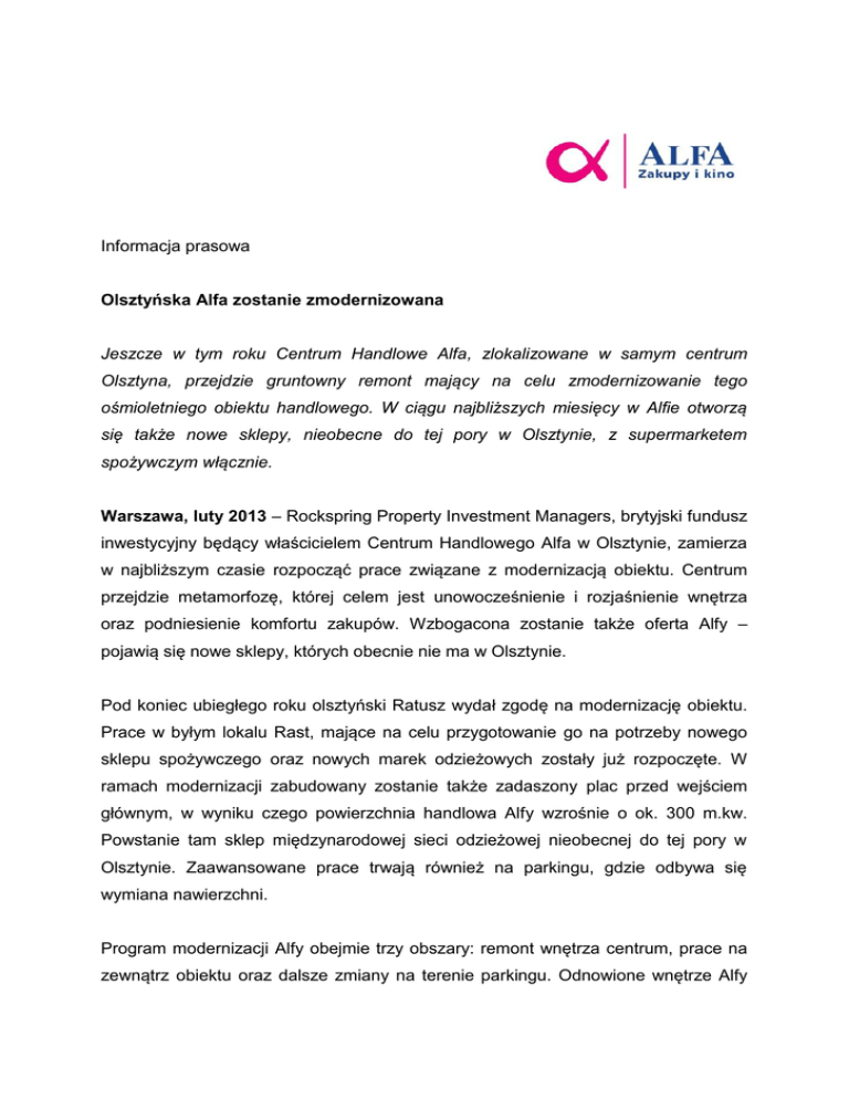 Informacja prasowa Olsztyńska Alfa zostanie zmodernizowana Jeszcze w tym roku Centrum Handlowe Alfa, zlokalizowane w samym centrum Olsztyna, przejdzie gruntowny remont mający na celu zmodernizowanie tego ośmioletniego obiektu handlowego. W ciągu najbliższych miesięcy w Alfie otworzą się także nowe sklepy, nieobecne do tej pory w Olsztynie, z supermarketem spożywczym włącznie. Warszawa, luty 2013 – Rockspring Property Investment Managers, brytyjski fundusz inwestycyjny będący właścicielem Centrum Handlowego Alfa w Olsztynie, zamierza w najbliższym czasie rozpocząć prace związane z modernizacją obiektu. Centrum przejdzie metamorfozę, której celem jest unowocześnienie i rozjaśnienie wnętrza oraz podniesienie komfortu zakupów. Wzbogacona zostanie także oferta Alfy – pojawią się nowe sklepy, których obecnie nie ma w Olsztynie. Pod koniec ubiegłego roku olsztyński Ratusz wydał zgodę na modernizację obiektu. Prace w byłym lokalu Rast, mające na celu przygotowanie go na potrzeby nowego sklepu spożywczego oraz nowych marek odzieżowych zostały już rozpoczęte. W ramach modernizacji zabudowany zostanie także zadaszony plac przed wejściem głównym, w wyniku czego powierzchnia handlowa Alfy wzrośnie o ok. 300 m.kw. Powstanie tam sklep międzynarodowej sieci odzieżowej nieobecnej do tej pory w Olsztynie. Zaawansowane prace trwają również na parkingu, gdzie odbywa się wymiana nawierzchni. Program modernizacji Alfy obejmie trzy obszary: remont wnętrza centrum, prace na zewnątrz obiektu oraz dalsze zmiany na terenie parkingu. Odnowione wnętrze Alfy będzie bardziej przyjazne i atrakcyjne dla klientów - wymienione zostaną m.in. sufity, oświetlenie, meble oraz oznakowanie na pasażach. Zmodernizowane zostaną wejścia do centrum - pojawi się wokół nich nowe oświetlenie, oznakowanie oraz więcej zieleni. Kontynuowany będzie także remont parkingu, którego celem jest podniesienie wygody korzystania z niego poprzez usprawnienie sposobu wjazdu i wyjazdu oraz ułatwienie poruszania się po obiekcie dzięki m.in. zamontowaniu nowego oznakowania. „Kiedy w 2012 uczestniczyliśmy w procesie zakupu CH Alfa przez Rockspring, mieliśmy już gotowy plan rewitalizacji Centrum polegający na wprowadzeniu nowych marek oraz dążeniu do tego, aby zakupy w Alfie były jak najbardziej przyjemnym i inspirującym doświadczeniem dla klientów” – mówi Katarzyna Tondel – Jędrzejczak – Asset Manager z warszawskiego biura Balmain Asset Management, firmy reprezentującej Rockspring. „Alfa ma szczególną lokalizację – bliskość zabytkowej starówki i ścisłego centrum miasta powodują, że nasze Centrum nie tylko stanowi istotne udogodnienie życia osób mieszkających i pracujących w pobliżu, ale jest również jednym z głównych pracodawców w mieście. Ulepszenia, które planujemy w Alfie jeszcze bardziej wzmocnią pozycję Centrum, jako serca Olsztyna i miejsca spotkań lokalnej społeczności” – dodała Tondel-Jędrzejczak. „Umowy najmu z nowym supermarketem spożywczym oraz innymi najemcami są właśnie finalizowane. Przewidujemy, że nazwy nowych marek podamy do wiadomości w ciągu kilku najbliższych tygodni. Prace związane z przystosowaniem powierzchni do potrzeb nowych najemców już trwają. Planujemy otwarcie nowych sklepów w połowie tego roku” – mówi Magdalena Kondeja, Dyrektor ds. Najmu w Balmain Asset Management. Trwa właśnie przetarg na głównego wykonawcę projektu, który zostanie rozstrzygnięty na początku marca. Przez cały okres prac modernizacyjnych Centrum Handlowe Alfa będzie w pełni otwarte, ponieważ większość prac będzie prowadzona wieczorami. Kompleksowy remont Alfy zakończy się wczesną jesienią bieżącego roku. Dodatkowych informacji udzielają: Agata Radlak-Piechowicz Balmain Asset Management Warsaw Towers, ul. Sienna 39, 00-121 Warszawa, tel. (+48), 606 361 492 e-mail: [email protected] Katarzyna Tondel - Jędrzejczak Balmain Asset Management Warsaw Towers, ul. Sienna 39, 00-121 Warszawa, tel. (+48) 22 206 40 58, e-mail: [email protected] CH Alfa (www.alfaolsztyn.com) jest wiodącym centrum handlowym w Olsztynie, które powstawało w dwóch etapach - pierwsza część obiektu została oddana do użytku w 2005 roku, druga, w 2009. W skład Centrum wchodzi 98 sklepów między innymi takich marek jak: H&M, Stradivarius, KappAhl, Rossmann, Empik, Smyk, Nike, CCC, Reserved, Home & You, Douglas i New Yorker. Na terenie Centrum znajduje się także 8-salowe kina Helios. W 2012 roku CH Alfa zostało kupione przez fundusz inwestycyjny zarządzany przez Rockspring Property Investment Managers z siedzibą w Londynie.