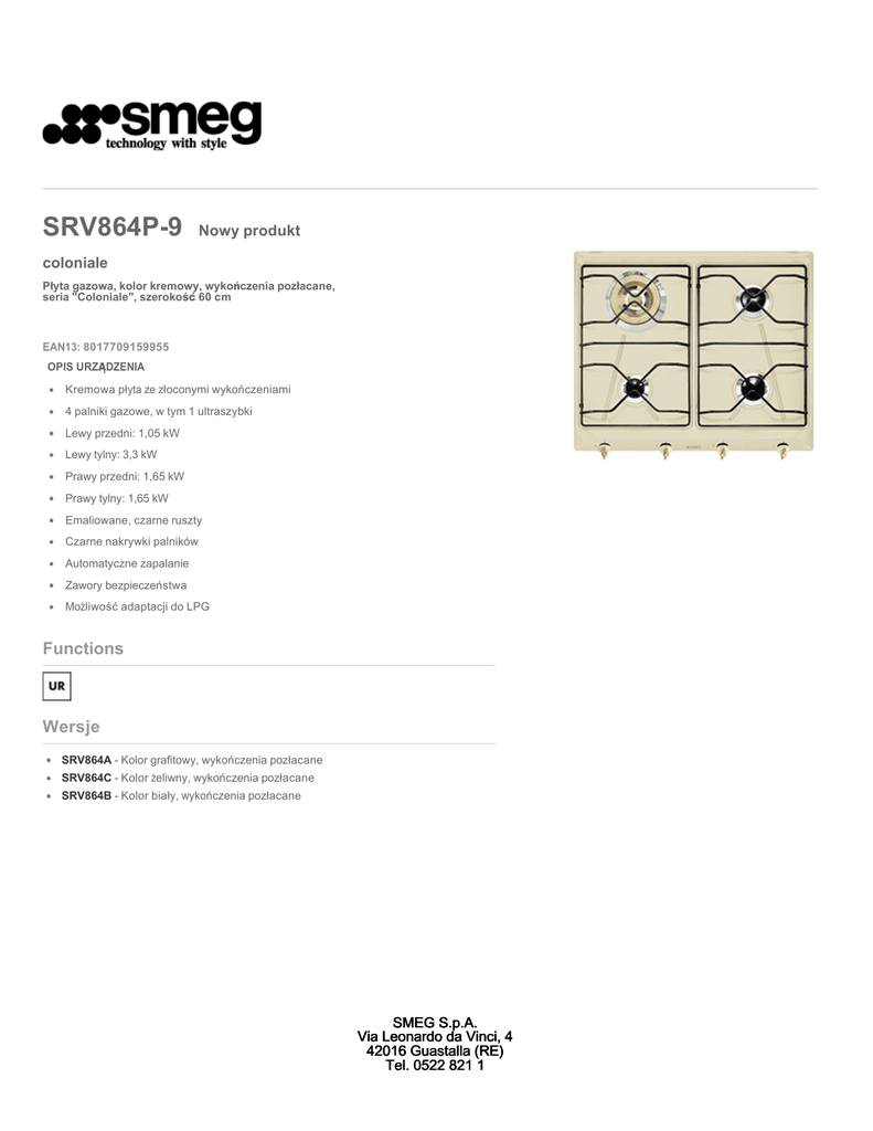 SRV864P-9 Nowy produkt coloniale Płyta gazowa, kolor kremowy, wykończenia pozłacane, seria "Coloniale", szerokość 60 cm EAN13: 8017709159955 OPIS URZĄDZENIA Kremowa płyta ze złoconymi wykończeniami 4 palniki gazowe, w tym 1 ultraszybki Lewy przedni: 1,05 kW Lewy tylny: 3,3 kW Prawy przedni: 1,65 kW Prawy tylny: 1,65 kW Emaliowane, czarne ruszty Czarne nakrywki palników Automatyczne zapalanie Zawory bezpieczeństwa Możliwość adaptacji do LPG Functions Wersje SRV864A - Kolor grafitowy, wykończenia pozłacane SRV864C - Kolor żeliwny, wykończenia pozłacane SRV864B - Kolor biały, wykończenia pozłacane SMEG S.p.A. Via Leonardo da Vinci, 4 42016 Guastalla (RE) Tel. 0522 821 1 SRV864P-9 coloniale gazowe 60 cm kremowy pokrętła z przodu gazowe Palnik ultra-szybki: Składa się podwójnej korony utworzonej przez połączenie małego palnika ( pomocniczego) i palnika dużego (głównego), które współpracując pozwalają na uzyskanie dużej mocy grzewczej SMEG S.p.A. Via Leonardo da Vinci, 4 42016 Guastalla (RE) Tel. 0522 821 1 SRV864P-9 coloniale gazowe 60 cm kremowy pokrętła z przodu gazowe SMEG S.p.A. Via Leonardo da Vinci, 4 42016 Guastalla (RE) Tel. 0522 821 1