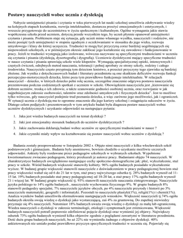 Postawy nauczycieli wobec ucznia z dysleksją Nabycie umiejętności pisania i czytania w toku pierwszych lat nauki szkolnej umożliwia zdobywanie wiedzy na kolejnych etapach kształcenia, rozwija intelektualnie, dostarcza przeżyć emocjonalnych i estetycznych, i wreszcie przygotowuje do uczestnictwa w życiu społecznym i kulturalnym. Ogólne wymagania jakie stawia współczesna szkoła przed uczniem, dotyczą przede wszystkim tego, by uczeń płynnie opanował umiejętności czytania i pisania. Problemem staje się sytuacja, gdy uczeń mimo własnego wysiłku, nauczycieli i rodziców, nie może posiąść tych umiejętności w stopniu zgodnym z oczekiwaniami w stosunku do jego wieku, rozwoju umysłowego i klasy do której uczęszcza. Trudności te mogą być przyczyną coraz bardziej uogólniających się niepowodzeń szkolnych, a w późniejszym okresie zakłócać jego kształcenie się zawodowe i funkcjonowanie w pracy. Jeżeli te trudności występują jako izolowane, wówczas nazywane są specyficznymi trudnościami w uczeniu się czytania i pisania (dysleksją, dysortografią i dysgrafią). Uczniowie dyslektyczni mający specyficzne trudności w nauce czytania i pisania sprawiają szkole wiele kłopotów. Wymagają specjalistycznej opieki, intensywnych i częstych ćwiczeń, odrębnych metod nauczania, tolerancji i pełnej aprobaty ze strony szkoły, rodziny i całego środowiska. Nauczyciele często przypisują tym dzieciom lenistwo, a przecież przyczyny tego zjawiska są bardziej złożone. Jak wynika z dotychczasowych badań i literatury przedmiotu są one skutkiem deficytów rozwoju funkcji percepcyjno-motorycznych dziecka, które poza tym prawidłowo funkcjonuje intelektualnie. W relacjach nauczyciel – dziecko, w których dziecko pełni rolę ucznia, szczególne znaczenie odgrywa postawa nauczyciela prezentowana podczas codziennych spotkań z uczniem w szkole. Obowiązkiem nauczyciela jest „kierowanie się dobrem uczniów, troską o ich zdrowie, a także szanowanie godności osobistej ucznia, oraz rozwijanie w jak najpełniejszym zakresie osobowości, talentów oraz zdolności umysłowych i fizycznych dziecka”. Jest to możliwe tylko wówczas, gdy nauczyciel podejmie trud poznania dziecka, a więc zarówno jego możliwości, jak i ograniczeń. W sytuacji ucznia z dysleksją ma to ogromne znaczenie dla jego kariery szkolnej i osiągnięcia sukcesów w życiu. Dlatego celem podjętych i prezentowanych w tym artykule badań była diagnoza postaw nauczycieli wobec uczniów dyslektycznych i uzyskanie odpowiedzi na następujące pytania: 1. Jaka jest wiedza badanych nauczycieli na temat dysleksji ? 2. Jaki jest emocjonalny stosunek badanych do uczniów dyslektycznych ? 3. Jakie zachowania deklarują badani wobec uczniów ze specyficznymi trudnościami w nauce ? 4. Jakie czynniki miały wpływ na kształtowanie się postaw nauczycieli wobec uczniów z dysleksją ? Badania zostały przeprowadzone w listopadzie 2002 r. Objęto nimi nauczycieli z kilku włocławskich szkół podstawowych i gimnazjum.. Badania były anonimowe, bowiem chodziło o uzyskanie możliwie szczerych odpowiedzi. Ankiety były rozdawane przez pedagogów szkolnych w wybranych szkołach. Wypełnione kwestionariusze zwracano pedagogom, którzy przekazali je autorce pracy. Badaniami objęto 74 nauczycieli. W charakterystyce badanych uwzględniono następujące cechy społeczno-demograficzne jak: płeć, wykształcenie, staż pracy w szkole. Wśród badanych większość stanowiły kobiety. 96% ogółu badanych posiadało wykształcenie wyższe. W badanej grupie większość stanowili nauczyciele z doświadczeniem w pracy pedagogicznej bowiem staż pracy większości wahał się od 6 do 21 lat w tym, staż pracy najwyższego odsetka tj. 28% badanych wynosił od 1115 lat. 19% badanych posiadało staż pracy pedagogicznej od 18-20 lat, a staż pracy 17% ogółu badanych wynosił 21 i więcej lat. W badanej grupie większość tj. 93% stanowili nauczyciele nauczania zintegrowanego. Nauczyciele języka polskiego to 14% ogółu badanych , nauczyciele wychowania fizycznego 9%. W grupie badanych 8% stanowili pedagodzy specjalni, 7% nauczyciele języków obcych, po 4% nauczyciele przyrody i historii po 3% nauczyciele matematyki, geografii i informatyki. Pozostali to nauczyciele plastyki(1%), religii(1%) i chemii(1%). Analiza wyników badań umożliwiła sformułowanie następujących wniosków. Większość nauczycieli tj.74% ogółu badanych określa swoją wiedzę o dysleksji jako wystarczającą, zaś 4% za gruntowną. Do zupełnej niewiedzy przyznaje się 4% nauczycieli. Natomiast 18% badanych uważa swoją wiedzę o dysleksji za małą lub ograniczoną. Wiedza nauczycieli o dysleksji w zakresie terminologii, etiologii i symptomach jest zróżnicowana, Większość badanych nauczycieli potrafi poprawnie zdefiniować pojęcie dysleksji oraz wymienić jej objawy. Największy odsetek 73% ogółu badanych wymienił kilka objawów zgodnie z poglądami zawartymi w literaturze przedmiotu. Dość duża grupa badanych nauczycieli, bo aż 22% nie wymieniła żadnego z objawów dysleksji. 40% ankietowanych nie umiało podać prawidłowo przyczyn specyficznych trudności w uczeniu się. Pojawiały się opinie, że przyczyną dysleksji jest upośledzenie umysłowe, brak stymulacji środowiskowej, wady wzroku lub słuchu. Większość badanych nauczycieli dostrzega potrzeby uczniów z dysleksją. Najwięcej ankietowanych (77%) wskazuje na zwolnienie ich z oceny za poprawność ortograficzną i graficzną pisma, podkreślając, że nie zwalnia ich to z pracy w pokonywaniu swoich trudności.60 % nauczycieli uważa, że w pracy z uczniem z dysleksją należy dostosować do jego możliwości, wydłużyć limit czasu na sprawdzianach, pomagać w czasie lekcji np. w odczytywaniu treści z tablicy. Badani nauczyciele wykazali się dobrą znajomością dotyczącą możliwości pomocy jakiej można udzielić dyslektykom. Wiedzą, że u