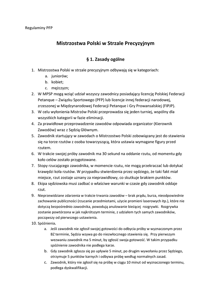 Regulaminy PFP Mistrzostwa Polski w Strzale Precyzyjnym § 1. Zasady ogólne 1. Mistrzostwa Polski w strzale precyzyjnym odbywają się w kategoriach: a. juniorów; b. kobiet; c. mężczyzn; 2. W MPSP mogą wziąć udział wszyscy zawodnicy posiadający licencję Polskiej Federacji Petanque – Związku Sportowego (PFP) lub licencje innej federacji narodowej, zrzeszonej w Międzynarodowej Federacji Petanque i Gry Prowansalskiej (FIPJP). 3. W celu wyłonienia Mistrzów Polski przeprowadza się jeden turniej, wspólny dla wszystkich kategorii w fazie eliminacji. 4. Za prawidłowe przeprowadzenie zawodów odpowiada organizator (Kierownik Zawodów) wraz z Sędzią Głównym. 5. Zawodnik startujący w zawodach o Mistrzostwo Polski zobowiązany jest do stawienia się na torze rzutów z osoba towarzyszącą, która ustawia wymagane figury przed rzutem. 6. W trakcie swojej próby zawodnik ma 30 sekund na oddanie rzutu, od momentu gdy koło celów zostało przygotowane. 7. Stopy rzucającego zawodnika, w momencie rzutu, nie mogą przekraczać lub dotykać krawędzi koła rzutów. W przypadku stwierdzenia przez sędziego, że taki fakt miał miejsce, rzut zostaje uznany za nieprawidłowy, co skutkuje brakiem punktów. 8. Ekipa sędziowska musi zadbać o właściwe warunki w czasie gdy zawodnik oddaje rzut. 9. Nieprzewidziane zdarzenia w trakcie trwania zawodów – brak prądu, burza, nieodpowiednie zachowanie publiczności (rzucanie przedmiotami, użycie promieni laserowych itp.), które nie dotyczą bezpośrednio zawodnika, powodują anulowanie bieżącej rozgrywki. Rozgrywka zostanie powtórzona w jak najkrótszym terminie, z udziałem tych samych zawodników, począwszy od pierwszego ustawienia. 10. Spóźnienia. a. Jeśli zawodnik nie zgłosił swojej gotowości do odbycia próby w wyznaczonym przez BZ terminie, Sędzia wzywa go do niezwłocznego stawienia się. Przy pierwszym wezwaniu zawodnik ma 5 minut, by zgłosić swoja gotowość. W takim przypadku spóźnienie zawodnika nie podlega karze. b. Gdy zawodnik zgłasza się po upływie 5 minut, po drugim wywołaniu przez Sędziego, otrzymuje 5 punktów karnych i odbywa próbę według normalnych zasad. c. Zawodnik, który nie zgłosił się na próbę w ciągu 10 minut od wyznaczonego terminu, podlega dyskwalifikacji. 11. Zwycięzcy zawodów otrzymują tytuły: a. Mistrza Polski w Strzale Precyzyjnym Juniorów; b. Mistrzyni Polski w Strzale Precyzyjnym; c. Mistrza Polski w Strzale Precyzyjnym; d. Mistrza Polski Mistrzów Strzału Precyzyjnego; e. Kolejne miejsca określa się formułą: Mistrzostwa Polski w Strzale Precyzyjnym … (J,K,M) – miejsce II, III, IV Zwycięzcy otrzymują statuetki, medale oraz nagrody przewidziane przez organizatora. 12. W konkursach Strzału Precyzyjnego notuje się rekordy Polski w kategoriach juniorów, kobiet i mężczyzn. Rekordowe wyniki są umieszczane w zakładce najlepsze wyniki na stronie www.petanque.pl. By rekord mógł zostać uznany, podczas rekordowej próby musi być zaangażowanych dwóch licencjonowanych sędziów PFP oraz jeden obserwator PFP, a próba musi być fragmentem składowym oficjalnych zawodów w strzale precyzyjnym organizowanych na szczeblu centralnym lub regionalnym. § 2. Teren i sprzęt 1. Zawody w strzale precyzyjnym odbywają się na terenie przeznaczonym do gry w petanque. 2. Do przeprowadzenia zawodów służy tor narysowany lub ułożony na terenie, składający się z koła celów o średnicy 1 metra oraz czterech kół rzutów o średnicy 0,5 metra. Układane tory muszą być tak umocowane do podłoża, by niemożliwe było ich przesuwanie w trakcie zawodów. Środki koła celów i kół rzutów wyznaczają linię prostą. Odległości pomiędzy kołem celu a kołami rzutów to 6, 7, 8 i 9 metrów, wyznaczone przez najbliższe sobie krawędzie kół, przy czym pomiaru dokonuje się od zewnętrznych krawędzi kół. 3. Kule: a. kula cel – gładka, jasna, o wadze od 700 do 720 gram, o średnicy 72 - 74 mm; b. kule przeszkody –gładkie, ciemne o wadze 700 do 720 gram, o średnicy 72 – 74 mm; c. świnki – o średnicy 30 milimetrów, w 3 kontrastowych kolorach, do wyboru dla zawodnika; 4. Wszystkie kule używane podczas zawodów jako cele lub jako przeszkody muszą mieć identyczne cechy, na wszystkich używanych torach. § 3. Figury 1. Kula. Kula cel ustawiona w środku koła celów. Zadanie polega na trafieniu kuli celu. Punktacja: 5 punktów - trafienie w kulę cel, które wyrzuca ją z koła celów, gdy kula rzucana przez zawodnika pozostaje w kole celów; 3 punkty - trafienie w kulę cel, które wyrzuca ją z koła celów, gdy kula rzucana przez zawodnika również opuszcza koło celów; 1 punkt - trafienie w kulę cel, które nie powoduje wypchnięcia jej z koła celów; 0 punktów - gdy rzucana kula odbije się przed kołem celów lub zahaczy o jego krawędź; - gdy rzucana kula nie trafia w kulę cel. 2. Kula za świnką. Kula cel ustawiona w środku koła celów. 10 centymetrów przed nią ustawiona świnka przeszkoda. Zadanie polega na trafieniu kuli celu. Punktacja: 5 punktów - trafienie w kulę cel, które wyrzuca ją z koła celów, gdy kula rzucana przez zawodnika pozostaje w kole celów; 3 punkty - trafienie w kulę cel, które wyrzuca ją z koła celów, gdy kula rzucana przez zawodnika również opuszcza koło celów; 1 punkt - trafienie w kulę cel, które nie powoduje wypchnięcia jej z koła celów; - gdy rzucana kula potrąca kulę świnkę przeszkodę po odbiciu się od kuli celu; 0 punktów - gdy rzucana kula odbije się przed kołem celów lub zahaczy o jego krawędź; - gdy rzucana kula trafia w świnkę przeszkodę przed trafieniem w kulę cel; - gdy rzucana kula nie trafia w kulę cel. 3. Kula środkowa. Kula cel ustawiona w środku koła. Po bokach kuli celu, w odległości 3 centymetrów od niej, dwie kule przeszkody. Zadanie polega na trafieniu kuli celu. Punktacja: 5 punktów - trafienie w kulę cel, które wyrzuca ją z koła celów, gd