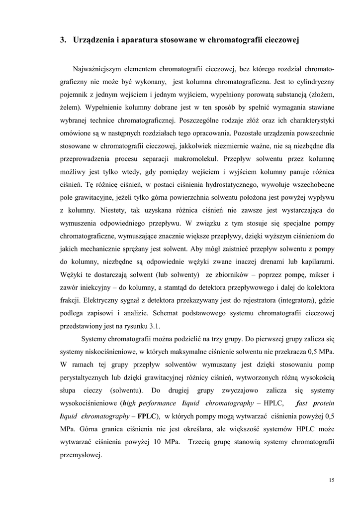 3. Urządzenia i aparatura stosowane w chromatografii cieczowej Najważniejszym elementem chromatografii cieczowej, bez którego rozdział chromatograficzny nie może być wykonany, jest kolumna chromatograficzna. Jest to cylindryczny pojemnik z jednym wejściem i jednym wyjściem, wypełniony porowatą substancją (złożem, żelem). Wypełnienie kolumny dobrane jest w ten sposób by spełnić wymagania stawiane wybranej technice chromatograficznej. Poszczególne rodzaje złóż oraz ich charakterystyki omówione są w następnych rozdziałach tego opracowania. Pozostałe urządzenia powszechnie stosowane w chromatografii cieczowej, jakkolwiek niezmiernie ważne, nie są niezbędne dla przeprowadzenia procesu separacji makromolekuł. Przepływ solwentu przez kolumnę możliwy jest tylko wtedy, gdy pomiędzy wejściem i wyjściem kolumny panuje różnica ciśnień. Tę różnicę ciśnień, w postaci ciśnienia hydrostatycznego, wywołuje wszechobecne pole grawitacyjne, jeżeli tylko górna powierzchnia solwentu położona jest powyżej wypływu z kolumny. Niestety, tak uzyskana różnica ciśnień nie zawsze jest wystarczająca do wymuszenia odpowiedniego przepływu. W związku z tym stosuje się specjalne pompy chromatograficzne, wymuszające znacznie większe przepływy, dzięki wyższym ciśnieniom do jakich mechanicznie sprężany jest solwent. Aby mógł zaistnieć przepływ solwentu z pompy do kolumny, niezbędne są odpowiednie wężyki zwane inaczej drenami lub kapilarami. Wężyki te dostarczają solwent (lub solwenty) ze zbiorników – poprzez pompę, mikser i zawór iniekcyjny – do kolumny, a stamtąd do detektora przepływowego i dalej do kolektora frakcji. Elektryczny sygnał z detektora przekazywany jest do rejestratora (integratora), gdzie podlega zapisowi i analizie. Schemat podstawowego systemu chromatografii cieczowej przedstawiony jest na rysunku 3.1. Systemy chromatografii można podzielić na trzy grupy. Do pierwszej grupy zalicza się systemy niskociśnieniowe, w których maksymalne ciśnienie solwentu nie przekracza 0,5 MPa. W ramach tej grupy przepływ solwentów wymuszany jest dzięki stosowaniu pomp perystaltycznych lub dzięki grawitacyjnej różnicy ciśnień, wytworzonych różną wysokością słupa cieczy (solwentu). Do drugiej grupy zwyczajowo zalicza wysokociśnieniowe (high performance liquid chromatography – HPLC, się systemy fast protein liquid chromatography – FPLC), w których pompy mogą wytwarzać ciśnienia powyżej 0,5 MPa. Górna granica ciśnienia nie jest określana, ale większość systemów HPLC może wytwarzać ciśnienia powyżej 10 MPa. Trzecią grupę stanowią systemy chromatografii przemysłowej. 15 Rys. 3.1. Schemat systemu chromatografii cieczowej. Przepływ cieczy (solwentów) z naczyń A i B wymuszany jest przez pompę P. Skład solwentu kontrolowany jest przez zawór Z, dzięki któremu możliwe jest tworzenie gradientu stężenia cieczy B w A. Z pompy ciecz podawana jest do miksera M, gdzie jest poddawana dokładnemu wymieszaniu. W następnej kolejności solwent podawany jest do zaworu iniekcyjnego ZI. Zawór ten ma zwykle kilka portów, co umożliwia wybór drogi przepływu solwentu. Solwent może być skierowany bezpośrednio na kolumnę, z pominięciem pętli L. Jeżeli próbka do rozdziału wcześniej naniesiona jest do pętli L (przy pomocy strzykawki S) to przeprowadzenie solwentu przez tę pętlę powoduje naniesienie próbki na kolumnę K. Naczynie W gromadzi solwent wypchnięty z pętli L w trakcie jej wypełniania próbką oraz solwent użyty do przemycia systemu. Rozdzielone składniki próbki wraz z solwentem wypływają z kolumny i dostają się do detektora UV i ewentualnie do detektora pH-metrycznego i/lub konduktometrycznego. Zmiany właściwości fizycznych wypływającego z kolumny materiału są rejestrowane przez detektor (detektory). Informacja o tym przekazywana jest do rejestratora-integratora INT, a rozdzielony na kolumnie materiał zbierany jest przez kolektor frakcji FRA. Całość systemu jest sterowana z poziomu kontrolera chromatografii KON. Do systemu takiego można podłączyć automatyczny podajnik próbek (autosampler), co pozwala zautomatyzować cykl rozdziałów. 3.1. Urządzenia i aparatura w chromatografii niskociśnieniowej Poniżej zwięźle scharakteryzowane są różne akcesoria potrzebne do zestawienia niskociśnieniowego, manualnego systemu chromatografii cieczowej. W następnej kolejności omówiony zostanie system automatyczny, zawierający w przeważającej większości w swym składzie omówione wcześniej elementy. 3.1.1. Kolumny 16 W zależności od potrzeb i przeznaczenia stosowane są kolumny o różnych rozmiarach i różnym typie budowy. Kolumny te przeznaczone są do samodzielnego ich wypełniania wybranymi złożami. Aby uprościć proces upakowywania złoża w kolumnie, stosuje się specjalne naczynia mocowane na górnej części kolumny (ang. packing reservoirs), które ułatwiają uzyskanie jednorodnej struktury złoża. Wysokość złoża w kolumnie może być regulowana przy pomocy adaptorów, które wypełniają sobą część kolumny wolną od złoża i pozwalają do minimum ograniczyć objętość martwą kolumny. Kolumny mogą być osłonięte dodatkowym pojemnikiem (ang. thermostatic jacket) umożliwiającym termostatowanie złoża przy pomocy opływającego kolumnę płaszcza wodnego. Rys. 3.2. Schemat kolumny chromatograficznej XK. Podstawowym elementem składowym kolumny jest szklana lub plastikowa rura R, na końcach której zamocowane są końcówki K wyposażone w specjalnej konstrukcji sita S utrzymujące wypełnienie w kolumnie. Do końcówek kolumny mocowane są wężyki W doprowadzające i odprowadzające solwent. Kolumna może być wyposażona w adaptor A oraz płaszcz termostatujący T. W tabeli 3.1. zebrane są najważniejsze informacje dotyczące pustych kolumn. Przy wyborze kolumny należy kierować się głównie jej rozmiarami oraz wytrzym