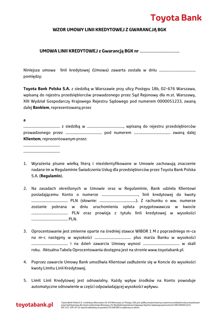 WZOR UMOWY LINII KREDYTOWEJ Z GWARANCJĄ BGK UMOWA LINII KREDYTOWEJ z Gwarancją BGK nr .................................... Niniejsza umowa linii kredytowej (Umowa) zawarta została w dniu .................................... pomiędzy: Toyota Bank Polska S.A. z siedzibą w Warszawie przy ulicy Postępu 18b, 02-676 Warszawa, wpisaną do rejestru przedsiębiorców prowadzonego przez Sąd Rejonowy dla m.st. Warszawy, XIII Wydział Gospodarczy Krajowego Rejestru Sądowego pod numerem 0000051233, zwaną dalej Bankiem, reprezentowaną przez a .................................... z siedzibą w ...................................., wpisaną do rejestru przedsiębiorców prowadzonego przez .................................... pod numerem .................................... zwaną dalej Klientem, reprezentowanym przez: .................................... .................................... 1. Wyrażenia pisane wielką literą i niezidentyfikowane w Umowie zachowują znaczenie nadane im w Regulaminie Świadczenia Usług dla przedsiębiorców przez Toyota Bank Polska S.A. (Regulamin). 2. Na zasadach określonych w Umowie oraz w Regulaminie, Bank udziela Klientowi posiadającemu Konto o numerze ...................................., linii kredytowej do kwoty .................................... PLN (słownie: ....................................). Z rachunku o ww. numerze zostanie pobrana w .................................... PLN dniu uruchomienia opłata przygotowawcza oraz prowizja z tytułu linii kredytowej w w kwocie wysokości .................................... PLN. 3. Oprocentowanie jest zmienne oparte na średniej stawce WIBOR 1 M z poprzedniego m-ca na m-c następny w wysokości .................................... plus marża Banku w wysokości .................................... i na dzień zawarcia Umowy wynosi .................................... w skali roku.Aktualna Tabela Oprocentowania dostępna jest na stronie www.toyotabank.pl. 4. Poprzez zawarcie Umowy Bank umożliwia Klientowi zadłużenie się w Koncie do wysokości kwoty Limitu Linii Kredytowej. 5. Limit Linii Kredytowej jest odnawialny. Każdy wpływ środków na Konto powoduje automatyczne odnowienie w części odpowiadającej wysokości wpływu. 6. Klient zobowiązuje się do zwrotu Linii Kredytowej wraz z odsetkami, w terminach i na zasadach określonych w Umowie oraz w Regulaminie oraz do zapłaty na rzecz Banku prowizji i opłat wynikających z Umowy oraz z Tabeli Opłat i Prowizji Toyota Bank Polska S.A (Tabela Opłat i Prowizji). Wysokość opłat i prowizji oraz zmiennego oprocentowania mogą ulec zmianom na zasadach określonych w Regulaminie. 7. Klient zobowiązuje się, iż od dnia zawarcia niniejszej Umowy dokonywać będzie wszelkich rozliczeń bankowych związanych z prowadzeniem działalności gospodarczej w wysokości nie mniej niż 100 % wartości posiadanej Linii Kredytowej za pośrednictwem rachunku bieżącego prowadzonego przez Bank. Weryfikacja rozliczeń będzie prowadzona przez Bank w cyklach miesięcznych. W przypadku nie wywiązania się z zobowiązania wynikającego ze zdania poprzedniego przez kolejne dwa pełne miesiące, marża Banku zostanie podwyższona o dodatkowe .................................... począwszy od pierwszego dnia następnego miesiąca. 8. Udostępnienie Linii Kredytowej nastąpi na Koncie Klienta nr .................................... najpóźniej w terminie 3 dni roboczych od dnia zawarcia Umowy/od dnia ustanowienia zabezpieczenia. 9. Niniejsza Umowa zawarta jest na 20 miesięcy. Po upływie terminu 20 miesięcy Klient może: (a) spłacić całość zadłużenia wynikającego z Umowy, w takim wypadku niniejsza Umowa wygaśnie lub (b) Umowa może być przedłużona na kolejne okresy 12 miesięczne – po ustanowieniu zaakceptowanych przez Bank zabezpieczeń spłaty Linii Kredytowej 10. Zabezpieczeniem Spłaty Linii Kredytowej są: (a) weksel własny in blanco z deklaracją wekslową (b) gwarancja Banku Gospodarstwa Krajowego (BGK) spłaty kredytu w ramach portfelowej linii gwarancyjnej de minimis (Gwarancja de minimis); (c) inne ....................................* *niepotrzebne skreślić Klient zobowiązuje się do dostarczania Bankowi kwartalnych informacji (do 15 dnia miesiąca następującego po końcu kwartału) potwierdzających zdolność kredytową Klienta. Klient zobowiązany jest umożliwić podejmowanie przez Bank czynności związanych z oceną jego sytuacji finansowej i gospodarczej. 11. Warunki Gwarancji de minimis: (a) Kwota gwarancji: .................................... (b) Termin ważności gwarancji: .................................... (c) Wskaźnik procentowy jednostkowej gwarancji: .................................... 12. Klient niniejszym akceptuje ostateczne warunki Gwarancji de minimis wskazane w pkt 11 oraz wyraża zgodę na zmianę Wniosku o udzielenie przez BGK gwarancji spłaty kredytu w ramach portfelowej linii gwarancyjnej de minimis (Wniosek) w zakresie w jakim ostateczne warunki gwarancji różnią się od warunków wynikających z Wniosku. Wzór wniosku wraz załącznikami stanowi załączniki do niniejszej Umowy. 13. W związku z objęciem niniejszej Umowy Gwarancją de minimis, Bank informuje, co następuje: (a) zgodnie z Umową portfelowej linii gwarancyjnej de minimis z dnia 5 kwietnia 2013 r. zawartą z BGK, Bank jest upoważniony do prowadzenia działań w zakresie dochodzenia roszczeń BGK wobec Klienta po zrealizowaniu gwarancji będącej zabezpieczeniem niniejszej Umowy kredytowej. Zakres upoważnienia Banku obejmuje prawo Banku do podejmowania w imieniu BGK wszelkich czynności, mających na celu dochodzenie roszczeń BGK względem Klienta z tytułu realizacji danej gwarancji, a w szczególności do podjęcia działań skutkujących zawarciem ugody, restrukturyzacją zadłużenia lub innym dobrowolnym zaspokojeniem roszczeń BGK,a także do reprezentowania BGK w postępowaniu zmierzającym do uzyskania tytułu wykonawczego, 