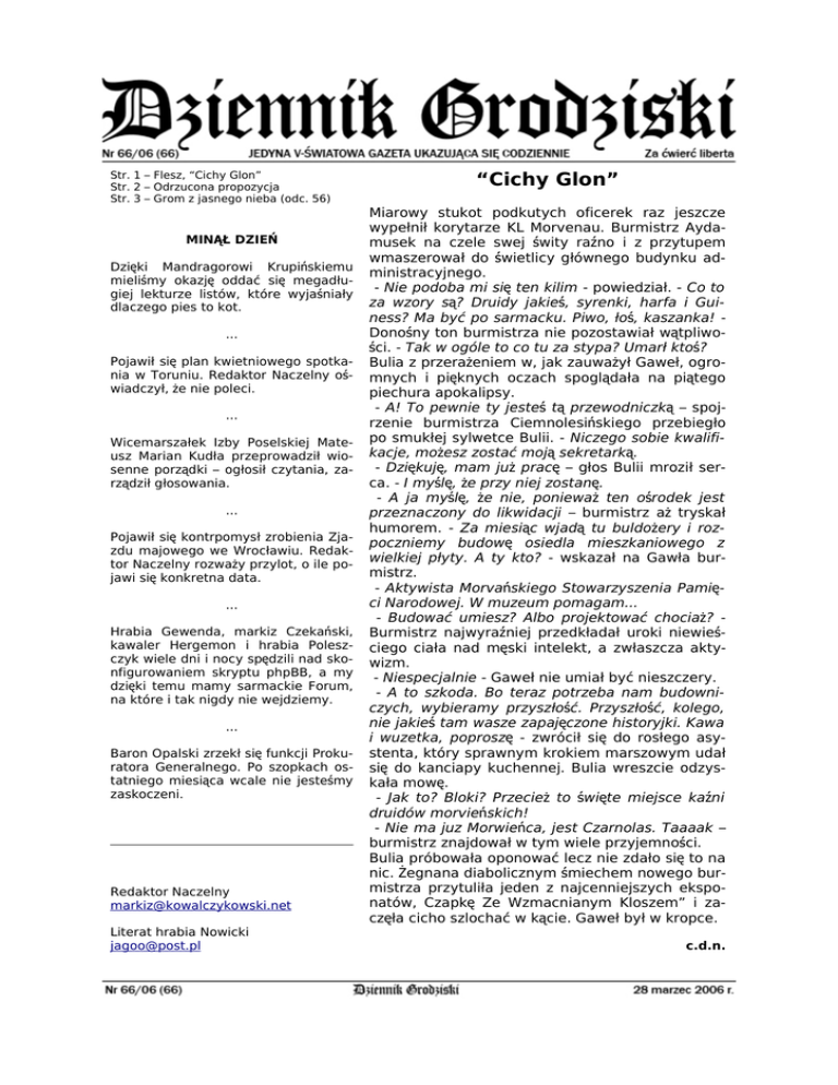 Str. 1 – Flesz, “Cichy Glon” Str. 2 – Odrzucona propozycja Str. 3 – Grom z jasnego nieba (odc. 56) MINĄŁ DZIEŃ Dzięki Mandragorowi Krupińskiemu mieliśmy okazję oddać się megadługiej lekturze listów, które wyjaśniały dlaczego pies to kot. ... Pojawił się plan kwietniowego spotkania w Toruniu. Redaktor Naczelny oświadczył, że nie poleci. ... Wicemarszałek Izby Poselskiej Mateusz Marian Kudła przeprowadził wiosenne porządki – ogłosił czytania, zarządził głosowania. ... Pojawił się kontrpomysł zrobienia Zjazdu majowego we Wrocławiu. Redaktor Naczelny rozważy przylot, o ile pojawi się konkretna data. ... Hrabia Gewenda, markiz Czekański, kawaler Hergemon i hrabia Poleszczyk wiele dni i nocy spędzili nad skonfigurowaniem skryptu phpBB, a my dzięki temu mamy sarmackie Forum, na które i tak nigdy nie wejdziemy. ... Baron Opalski zrzekł się funkcji Prokuratora Generalnego. Po szopkach ostatniego miesiąca wcale nie jesteśmy zaskoczeni. Redaktor Naczelny [email protected] Literat hrabia Nowicki [email protected] “Cichy Glon” Miarowy stukot podkutych oficerek raz jeszcze wypełnił korytarze KL Morvenau. Burmistrz Aydamusek na czele swej świty raźno i z przytupem wmaszerował do świetlicy głównego budynku administracyjnego. - Nie podoba mi się ten kilim - powiedział. - Co to za wzory są? Druidy jakieś, syrenki, harfa i Guiness? Ma być po sarmacku. Piwo, łoś, kaszanka! Donośny ton burmistrza nie pozostawiał wątpliwości. - Tak w ogóle to co tu za stypa? Umarł ktoś? Bulia z przerażeniem w, jak zauważył Gaweł, ogromnych i pięknych oczach spoglądała na piątego piechura apokalipsy. - A! To pewnie ty jesteś tą przewodniczką – spojrzenie burmistrza Ciemnolesińskiego przebiegło po smukłej sylwetce Bulii. - Niczego sobie kwalifikacje, możesz zostać moją sekretarką. - Dziękuję, mam już pracę – głos Bulii mroził serca. - I myślę, że przy niej zostanę. - A ja myślę, że nie, ponieważ ten ośrodek jest przeznaczony do likwidacji – burmistrz aż tryskał humorem. - Za miesiąc wjadą tu buldożery i rozpoczniemy budowę osiedla mieszkaniowego z wielkiej płyty. A ty kto? - wskazał na Gawła burmistrz. - Aktywista Morvańskiego Stowarzyszenia Pamięci Narodowej. W muzeum pomagam... - Budować umiesz? Albo projektować chociaż? Burmistrz najwyraźniej przedkładał uroki niewieściego ciała nad męski intelekt, a zwłaszcza aktywizm. - Niespecjalnie - Gaweł nie umiał być nieszczery. - A to szkoda. Bo teraz potrzeba nam budowniczych, wybieramy przyszłość. Przyszłość, kolego, nie jakieś tam wasze zapajęczone historyjki. Kawa i wuzetka, poproszę - zwrócił się do rosłego asystenta, który sprawnym krokiem marszowym udał się do kanciapy kuchennej. Bulia wreszcie odzyskała mowę. - Jak to? Bloki? Przecież to święte miejsce kaźni druidów morvieńskich! - Nie ma juz Morwieńca, jest Czarnolas. Taaaak – burmistrz znajdował w tym wiele przyjemności. Bulia próbowała oponować lecz nie zdało się to na nic. Żegnana diabolicznym śmiechem nowego burmistrza przytuliła jeden z najcenniejszych eksponatów, Czapkę Ze Wzmacnianym Kloszem” i zaczęła cicho szlochać w kącie. Gaweł był w kropce. c.d.n. WYWIAD AUTORYZOWANY Odrzucona propozycja Robert markiz Czekański, Przewodniczący NZM: NZM dziś złożyło propozycję zmierzającą do ustabilizowania sytuacji w kraju. Najwyższe władze oceniły propozycję jako uczciwą. SPD, a w zasadzie M. M. Kudła propozycję odrzucił. Propozycja polegała na cofnięciu wniosku o referendum w zamian za wspólną pracę nad zmianą ordynacji, i w zamian za uchwałę o samorozwiazaniu IP. Zakładała nowe wybory na bazie nowej ordynacji proporcjonalnej, wybory uczciwe. Zakładała wspólne rządy po nowych wyborach. Dziennik Grodziski: Kto konkretnie wystąpił z propozycją? RC: Ja. W imieniu NZM. DG: Czy NZM wiedziało o tej propozycji? RC: Wiedziało. DG: Co się kryje pod sformuowaniem "najwyższe władze"? RC: Książę i Regent. DG: Czy Minister-Kanclerz Kudła udzielił jakiejkolwiek odpowiedzi odrzucając propozycję? RC: Tak, uznał, że za propozycją kryje się, zacytuję... Albo nie zacytuję. Powiem. Uważa, że to mój pomysł nastawiony na "rzeź" SPD, że ja chcę przejąć władzę, że propozycja jest cyniczna, że propozycja to oszustwo cwaniaka dla zysku cwaniaka. Wie, że spadło SPD poparcie i sądzi, że nie wejdą do IP. I na koniec cytat: "Nie dostaniecie się do czerwca. (co najmniej)". DG: NZM dość niewybrednie postąpił z obywatelami popierającymi wniosek o referendum w sprawie odwołania Kanclerza. Zostali potraktowani instrumentalnie po to tylko, by wywalczyć dla NZMu jakiś kąsek władzy. Co im Pan teraz ma do powiedzenia? RC: NZM nic takiego nie zrobiło. Wniosek o referendum pozostaje w mocy. Propozycja NZM była nastawiona na łagodzenie problemu a nie na jego eskalowanie. DG: Jakie w takim wypadku są plany NZM na najbliższą przyszłość? RC: NZM cierpliwie poczeka na zarządzenie referendum oraz będzie kontynuować swoją aktywną pracę w IS i samorządach. DG: Przyjmując, że referendum zostanie przez NZM wygrane to... co to da? RC: Referendum pokaże, że SPD nie jest w stanie stworzyć i utrzymać stabilnego, działającego rządu. Liczymy, że wtedy liderzy SPD, którzy już dziś mają problemy z prawem, opamiętają się i dla dobra Sarmacji zdecydują się na przedterminowe wybory. NZM nie jest w stanie zrozumieć w jaki sposób partia licząca ponad 40 osób, oraz posiadająca 100% mandatów w IP nie jest w stanie prawidłowo rządzić. DG: Jeśli NZM miałoby w tej chwili stworzyć Rząd, to kto by się w nim znalazł? RC: NZM proponowało w czasie kampanii wyborczej rząd oparty o sprawdzonych ekspertów. Tak więc, znaleźli by się w rządzie Panowie Bartkowiak, Poleszczyk, Janiczek, Radecki, Czekański. Także młodsi i aktywni mieszkańcy tacy jak Pan Karakachanow. NZM nawiązało