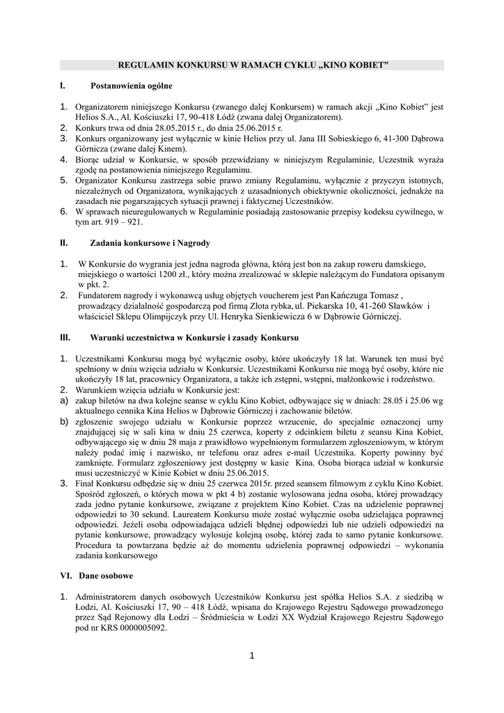 REGULAMIN KONKURSU W RAMACH CYKLU „KINO KOBIET” I. Postanowienia ogólne 1. Organizatorem niniejszego Konkursu (zwanego dalej Konkursem) w ramach akcji „Kino Kobiet” jest Helios S.A., Al. Kościuszki 17, 90-418 Łódź (zwana dalej Organizatorem). 2. Konkurs trwa od dnia 28.05.2015 r., do dnia 25.06.2015 r. 3. Konkurs organizowany jest wyłącznie w kinie Helios przy ul. Jana III Sobieskiego 6, 41-300 Dąbrowa Górnicza (zwane dalej Kinem). 4. Biorąc udział w Konkursie, w sposób przewidziany w niniejszym Regulaminie, Uczestnik wyraża zgodę na postanowienia niniejszego Regulaminu. 5. Organizator Konkursu zastrzega sobie prawo zmiany Regulaminu, wyłącznie z przyczyn istotnych, niezależnych od Organizatora, wynikających z uzasadnionych obiektywnie okoliczności, jednakże na zasadach nie pogarszających sytuacji prawnej i faktycznej Uczestników. 6. W sprawach nieuregulowanych w Regulaminie posiadają zastosowanie przepisy kodeksu cywilnego, w tym art. 919 – 921. II. 1. 2. III. Zadania konkursowe i Nagrody W Konkursie do wygrania jest jedna nagroda główna, którą jest bon na zakup roweru damskiego, miejskiego o wartości 1200 zł., który można zrealizować w sklepie należącym do Fundatora opisanym w pkt. 2. Fundatorem nagrody i wykonawcą usług objętych voucherem jest Pan Kańczuga Tomasz , prowadzący działalność gospodarczą pod firmą Złota rybka, ul. Piekarska 10, 41-260 Sławków i właściciel Sklepu Olimpijczyk przy Ul. Henryka Sienkiewicza 6 w Dąbrowie Górniczej. Warunki uczestnictwa w Konkursie i zasady Konkursu 1. Uczestnikami Konkursu mogą być wyłącznie osoby, które ukończyły 18 lat. Warunek ten musi być spełniony w dniu wzięcia udziału w Konkursie. Uczestnikami Konkursu nie mogą być osoby, które nie ukończyły 18 lat, pracownicy Organizatora, a także ich zstępni, wstępni, małżonkowie i rodzeństwo. 2. Warunkiem wzięcia udziału w Konkursie jest: a) zakup biletów na dwa kolejne seanse w cyklu Kino Kobiet, odbywające się w dniach: 28.05 i 25.06 wg aktualnego cennika Kina Helios w Dąbrowie Górniczej i zachowanie biletów. b) zgłoszenie swojego udziału w Konkursie poprzez wrzucenie, do specjalnie oznaczonej urny znajdującej się w sali kina w dniu 25 czerwca, koperty z odcinkiem biletu z seansu Kina Kobiet, odbywającego się w dniu 28 maja z prawidłowo wypełnionym formularzem zgłoszeniowym, w którym należy podać imię i nazwisko, nr telefonu oraz adres e-mail Uczestnika. Koperty powinny być zamknięte. Formularz zgłoszeniowy jest dostępny w kasie Kina. Osoba biorąca udział w konkursie musi uczestniczyć w Kinie Kobiet w dniu 25.06.2015. 3. Finał Konkursu odbędzie się w dniu 25 czerwca 2015r. przed seansem filmowym z cyklu Kino Kobiet. Spośród zgłoszeń, o których mowa w pkt 4 b) zostanie wylosowana jedna osoba, której prowadzący zada jedno pytanie konkursowe, związane z projektem Kino Kobiet. Czas na udzielenie poprawnej odpowiedzi to 30 sekund. Laureatem Konkursu może zostać wyłącznie osoba udzielająca poprawnej odpowiedzi. Jeżeli osoba odpowiadająca udzieli błędnej odpowiedzi lub nie udzieli odpowiedzi na pytanie konkursowe, prowadzący wylosuje kolejną osobę, której zada to samo pytanie konkursowe. Procedura ta powtarzana będzie aż do momentu udzielenia poprawnej odpowiedzi – wykonania zadania konkursowego VI. Dane osobowe 1. Administratorem danych osobowych Uczestników Konkursu jest spółka Helios S.A. z siedzibą w Łodzi, Al. Kościuszki 17, 90 – 418 Łódź, wpisana do Krajowego Rejestru Sądowego prowadzonego przez Sąd Rejonowy dla Łodzi – Śródmieścia w Łodzi XX Wydział Krajowego Rejestru Sądowego pod nr KRS 0000005092. 1 2. Podanie przez Uczestnika danych osobowych jest dobrowolne lecz niezbędne do wzięcia udziału w Konkursie. 3. Podane przez Uczestnika dane osobowe będą przetwarzane zgodnie z przepisami ustawy z dnia 29 sierpnia 1997 r. o ochronie danych osobowych, w celach związanych z organizacją i przeprowadzeniem Konkursu, w tym wydaniem nagród. 4. Uczestnik ma prawo dostępu do swoich danych oraz ich modyfikacji. Uczestnik może żądać zaprzestania przetwarzania lub usunięcia jego danych osobowych. IV. Warunki odbioru nagród 1. Warunkiem wydania i odbioru nagrody jest wpłacenie przez laureata na rachunek bankowy Organizatora podany w pkt 2 poniżej, kwoty będącej równowartością 10% (słownie: dziesięciu procent) wartości nagrody, celem przekazania jej tytułem podatku dochodowego od osób fizycznych, na rachunek bankowy właściwego dla laureata Konkursu Urzędu Skarbowego i dostarczenie Organizatorowi osobiście, listem poleconym lub przesyłką kurierską na adres Organizatora, wskazany powyżej w Regulaminie, w terminie 7 dni od dnia otrzymania informacji o wygraniu nagrody, dowodu dokonania wpłaty. 2. Wpłaty należy dokonać na rachunek Organizatora w Kredyt Banku S.A. III Oddział w Łodzi, o numerze: 24 1500 1982 1219 8000 9116 0000. 3. Laureatowi nie przysługuje prawo do zastrzeżenia wyboru szczególnych właściwości nagrody ani do otrzymania jej ekwiwalentu (pieniężnego, rzeczowego). 4. Wydanie nagrody głównej może nastąpić po spełnieniu poniższych warunków: a) zapłata podatku dochodowego od osób fizycznych, w sposób i wysokości wskazanych powyżej b) osobiste stawienie się Laureata w biurze Kina, w terminie max. 14 dni od dnia rozstrzygnięcia Konkursu i okazanie pracownikowi Organizatora dokumentu tożsamości oraz dowodu zapłaty kwoty odpowiadającej należnemu podatkowi. 5. Nagroda nie może być przeniesiona na osoby trzecie wskazane przez laureata. 6. Nagroda, po której odbiór laureat nie zgłosi się w ciągu 14 dni od dnia rozstrzygnięcia Konkursu pozostaje własnością Organizatora. 7. Organizator nie ponosi odpowiedzialności za niemożność realizacji nagród z przyczyn leżących po stronie Uczestników. 8. Fundator nagrody ponosi odpowiedzialność z tytułu rękojmi i gwarancji według z
