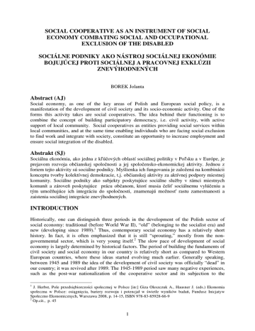 SOCIAL COOPERATIVE AS AN INSTRUMENT OF SOCIAL ECONOMY COMBATING SOCIAL AND OCCUPATIONAL EXCLUSION OF THE DISABLED SOCIÁLNE PODNIKY AKO NÁSTROJ SOCIÁLNEJ EKONÓMIE BOJUJÚCEJ PROTI SOCIÁLNEJ A PRACOVNEJ EXKLÚZII ZNEVÝHODNENÝCH BOREK Jolanta Abstract (AJ) Social economy, as one of the key areas of Polish and European social policy, is a manifestation of the development of civil society and its socio-economic activity. One of the forms this activity takes are social cooperatives. The idea behind their functioning is to combine the concept of building participatory democracy, i.e. civil activity, with active support of local community. Social cooperatives as entities providing social services within local communities, and at the same time enabling individuals who are facing social exclusion to find work and integrate with society, constitute an opportunity to increase employment and ensure social integration of the disabled. Abstrakt (SJ) Sociálna ekonómia, ako jedna z kľúčových oblastí sociálnej politiky v Poľsku a v Európe, je prejavom rozvoja občianskej spoločnosti a jej spoločensko-ekonomickej aktivity. Jednou z foriem tejto aktivity sú sociálne podniky. Myšlienka ich fungovania je založená na kombinácii konceptu tvorby kolektívnej demokracie, t.j. občianskej aktivity za aktívnej podpory miestnej komunity. Sociálne podniky ako subjekty poskytujúce sociálne služby v rámci miestnych komunít a zároveň poskytujúce prácu občanom, ktorí musia čeliť sociálnemu vylúčeniu a tým umožňujúce ich integráciu do spoločnosti, znamenajú možnosť rastu zamestnanosti a zaistenia sociálnej integrácie znevýhodnených. INTRODUCTION Historically, one can distinguish three periods in the development of the Polish sector of social economy: traditional (before World War II), “old” (belonging to the socialist era) and new (developing since 1989).1 Thus, contemporary social economy has a relatively short history. In fact, it is often emphasized that it is still “sprouting,” mostly from the nongovernmental sector, which is very young itself.2 The slow pace of development of social economy is largely determined by historical factors. The period of building the fundaments of civil society and social economy in our country is relatively short as compared to Western European countries, where these ideas started evolving much earlier. Generally speaking, between 1945 and 1989 the idea of the development of civil society was officially “dead” in our country; it was revived after 1989. The 1945-1989 period saw many negative experiences, such as the post-war nationalization of the cooperative sector and its subjection to the 1 J. Herbst, Pole przedsiębiorczości społecznej w Polsce [in:] Giza Oleszczuk A., Hausner J. (eds.) Ekonomia społeczna w Polsce: osiągnięcia, bariery rozwoju i potencjał w świetle wyników badań, Fundusz Inicjatyw Społeczno Ekonomicznych, Warszawa 2008, p. 14-15, ISBN 978-83-85928-66-9 2 Op.cit., p. 45 1 centrally controlled administration.3 The excessive growth of the latter undermined the authenticity of democratic mechanisms of cooperative movement. This process was accompanied by the use of force (at least in the first post-war period), resulting in people’s mistrust and in disbanding of the bulk of cooperatives after 1956, as well as in rejection of various forms of cooperation by the society in the 1990s.4 Another reason for the crisis of the cooperative movement in Poland was the fact that the cooperative structures were under the control of people “of the previous [i.e. communist] era”5 who could not adjust their the way of running things to the changing conditions of their surroundings. It is noted that the return to the achievements and traditions of social economy was an institutional reaction to the crisis of the welfare state.6 It was also an effect of the development of civil society and of an increase in economic activity of non-governmental organizations, as well as a reaction to the problem of social exclusion which, despite the economic development and social progress, affects or is a threat to many individuals. Among those facing exclusion are the disabled. Social cooperatives, as an entity of social economy combining civil activity with an active support of local community,7 involve those disadvantaged on the labour market in the process of normalizing their own lives. As a response to the departing from passive forms of support in favour of active, development-oriented solutions, social cooperatives become part of the mainstream Polish and European social policy. The idea behind the functioning of social cooperatives is based on combining some aspects of occupational development with social integration. One of target groups this form of enterprise is directed at are the disabled. This shows that social cooperatives can have a vital role in the process of occupational and social reintegration of disabled people. The objective of this paper is to present the social cooperative as an instrument of social economy, which can play a major role in the process of occupational development and social integration of the disabled in their local environment. The paper consists of three parts preceded by an introduction and followed by a summary. The first part presents information on disability in Poland. Part two discusses socio-economical reasons for the development of social cooperatives. The third part touches upon the issue of the positive impact of social cooperatives on the process of occupational and social reintegration of disabled people. The summary discusses the impediments to the development of social cooperatives in Poland. 1 FACTS AND FIGURES ON DISABILITY IN POLAND For many years, Poland has seen a raise in the number of the disabled and their percentage in total population. The highest percentage, of 14.3%, was recorded in 2002. From 2002 to 2011 the total number of disabled people dropped from 