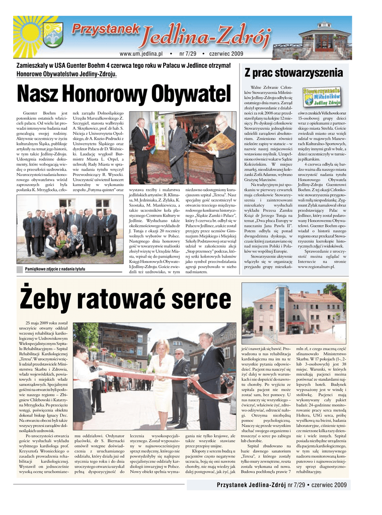 www.um.jedlina.pl • nr 7/29 • czerwiec 2009 Zamieszkały w USA Guenter Boehm 4 czerwca tego roku w Pałacu w Jedlince otrzymał Honorowe Obywatelstwo Jedliny-Zdroju. Nasz Honorowy Obywatel Guenter Boehm jest potomkiem ostatnich właścicieli pałacu. Od wielu lat prowadzi intensywne badania nad genealogią swojej rodziny. Aktywnie uczestniczy w życiu kulturalnym Śląska, publikuje artykuły na temat jego historii, w tym także Jedliny-Zdroju. Udostępnia rodzinne dokumenty, które wzbogacają wiedzę o przeszłości uzdrowiska. Na uroczystości nadania honorowego obywatelstwa wśród zaproszonych gości była posłanka K. Mrzygłocka, czło- nek zarządu Dolnośląskiego Urzędu Marszałkowskiego Z. Szczygieł, starosta wałbrzyski A. Skrętkowicz, prof. dr hab. S. Nicieja z Uniwersytetu Opolskiego, dr A. Kuzio-Podrucki z Uniwersytetu Śląskiego oraz dyrektor Pałacu dr D. Woźnicki. Laudację wygłosił Burmistrz Miasta L. Orpel, a uchwałę Rady Miasta w sprawie nadania tytułu wręczył Przewodniczący R. Wysocki. Uroczystość uświetnił koncert kameralny w wykonaniu zespołu „Futyma quintet” oraz Pamiątkowe zdjęcie z nadania tytułu wystawa rzeźby i malarstwa jedlińskich artystów: R. Klimasa, M. Jedziniaka, Z. Żyłaka, K. Szostaka, M. Mankiewicza, a także uczestników koła plastycznego Centrum Kultury w Jedlinie. Wysłuchano także okolicznościowego wykładu dr J. Tutaja z okazji 20 rocznicy wolnych wyborów w Polsce. Następnego dnia honorowy gość w towarzystwie małżonki złożył wizytę w Urzędzie Miasta, wpisał się do pamiątkowej Księgi Honorowych Obywateli Jedliny-Zdroju. Goście zwiedzili też uzdrowisko, w tym niedawno udostępniony kuracjuszom szpital „Teresa”. Nasz specjalny gość uczestniczył w otwarciu trzeciego międzynarodowego konkursu historycznego „Śląskie Zamki i Pałace”, który 5 czerwca br. odbył się w Pałacu w Jedlince, a także został przyjęty przez uczniów Gimnazjum Miejskiego i Miejskiej Szkoły Podstawowej oraz wziął udział w zakończeniu akcji „Stop przemocy” podczas, której setki kolorowych balonów jako symbol przeciwdziałania agresji poszybowało w niebo nad miastem. Z prac stowarzyszenia Walne Zebranie Członków Stowarzyszenia Miłośników Jedliny-Zdroju odbyło się ostatniego dnia marca. Zarząd złożył sprawozdanie z działalności za rok 2008 oraz przedstawił plany na kolejne 12 miesięcy. Po dyskusji członkowie Stowarzyszenia jednogłośnie udzielili zarządowi absolutorium. Zmieniono również niektóre zapisy w statucie – w nazwie naszej miejscowości wstawiono myślnik. Uzupełniono również wakat w Sądzie Koleżeńskim. W miejsce zmarłej, nieodżałowanej koleżanki Zofii Adamus, wybrano Grażynę Marcinów. Na tradycyjnym już spotkaniu w pierwszy czwartek maja członkowie Stowarzyszenia i zainteresowani mieszkańcy wysłuchali wykładu Prezesa Zamku Książ dr Jerzego Tutaja na temat „Dwa płuca Europy w nauczaniu Jana Pawła II”. Potem odbyła się ponad dwugodzinna dyskusja, w czasie której zastanawiano się nad miejscem Polski i Polaków we wspólnej Europie. Stowarzyszenie aktywnie włączyło się w organizację przyjazdu grupy mieszkań- ców z czeskich Velichovek oraz 15-osobowej grupy dzieci wraz z opiekunami z partnerskiego miasta Strehla. Goście zwiedzali miasto oraz wzięli udział w majowych Manewrach Kulturalno-Sportowych, między innymi grali w bule, a dzieci uczestniczyły w turnieju piłkarskim. 4 czerwca odbyła się bardzo ważna dla naszego miasta uroczystość nadania tytułu Honorowego Obywatela Jedliny-Zdroju Guenterowi Boehm. Z tej okazji Członkowie stowarzyszenia przygotowali miłą niespodziankę. Zygmunt Żyłak namalował obraz przedstawiający Pałac w Jedlince, który został podarowany Honorowemu Obywatelowi. Guenter Boehm opowiadał o historii naszego regionu oraz przekazał Stowarzyszeniu kserokopie historycznych zdjęć i widokówek. Sprawozdanie z uroczystość można oglądać w Internecie na stronie www.regionalnatv.pl. Żeby ratować serce 25 maja 2009 roku został uroczyście otwarty oddział wczesnej rehabilitacji kardiologicznej w Uzdrowiskowym Wielospecjalistycznym Szpitalu Rehabilitacyjnym – Szpital Rehabilitacji Kardiologicznej „Teresa”. W uroczystości wzięli udział przedstawiciele Ministerstwa Skarbu i Zdrowia, władz wojewódzkich, powiatowych i miejskich władz samorządowych. Specjalnymi gośćmi na otwarciu byli posłowie naszego regionu – Zbigniew Chlebowski i Katarzyna Mrzygłocka. Po przecięciu wstęgi, poświęcenia obiektu dokonał biskup Ignacy Dec. Na otwarciu obecni byli także wszyscy prezesi zarządów dolnośląskich uzdrowisk. Po uroczystości otwarcia goście wysłuchali wykładu wybitnego kardiologa prof. Krzysztofa Wronieckiego o zasadach prowadzenia rehabilitacji kardiologicznej. Wystawił on jednocześnie wysoką ocenę uruchomiane- mu oddziałowi. Ordynator placówki, dr S. Biernacki omówił wstępne doświadczenia z uruchamianego oddziału, który działa już od stycznia tego roku i do dnia uroczystego otwarcia uzyskał pełną dyspozycyjność do leczenia wysokospecjalistycznego. Został wyposażony w najnowocześniejszy sprzęt medyczny, którego nie powstydziłyby się najlepsze specjalistyczne oddziały kardiologii inwazyjnej w Polsce. Nowy obiekt spełnia wyma- gania nie tylko krajowe, ale także wszystkie stawiane przez przepisy unijne. Kłopoty z sercem budzą u pacjentów często negatywne uczucia, boją się oni nawrotu choroby, nie mają wiedzy jak dalej postępować, jak żyć, jak jeść i nawet jak się bawić. Prowadzona u nas rehabilitacja kardiologiczna ma im na te wszystkie pytania odpowiedzieć. Pacjent ma nauczyć się żyć dalej w nowych warunkach i nie dopuścić do nawrotu choroby. Po wyjściu ze szpitala pacjent nie może zostać sam, bez pomocy. U nas nauczy się wszystkiego – ćwiczyć, właściwie żyć, zdrowo odżywiać, odrzucić nałogi. Otrzyma niezbędną