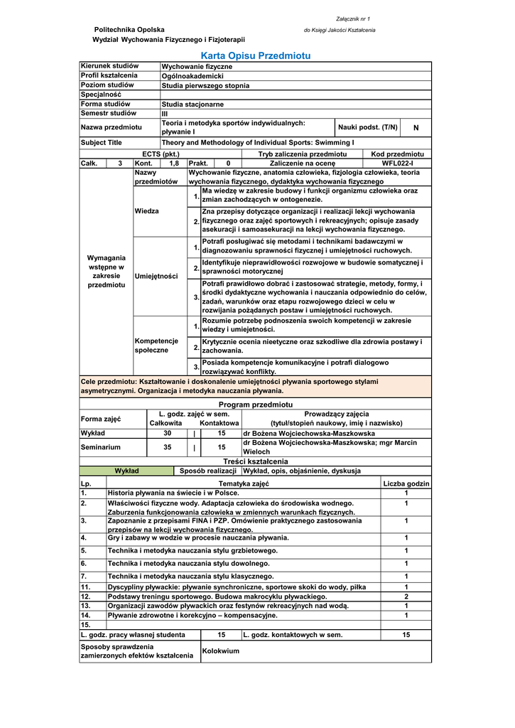 Załącznik nr 1 Politechnika Opolska Wydział Wychowania Fizycznego i Fizjoterapii do Księgi Jakości Kształcenia Karta Opisu Przedmiotu Kierunek studiów Profil kształcenia Poziom studiów Specjalność Forma studiów Semestr studiów Wychowanie fizyczne Ogólnoakademicki Studia pierwszego stopnia Studia stacjonarne III Teoria i metodyka sportów indywidualnych: pływanie I Nazwa przedmiotu Subject Title Całk. 3 Nauki podst. (T/N) N Theory and Methodology of Individual Sports: Swimming I ECTS (pkt.) Kont. 1,8 Nazwy przedmiotów Tryb zaliczenia przedmiotu Kod przedmiotu Prakt. 0 Zaliczenie na ocenę WFL022-I Wychowanie fizyczne, anatomia człowieka, fizjologia człowieka, teoria wychowania fizycznego, dydaktyka wychowania fizycznego Ma wiedzę w zakresie budowy i funkcji organizmu człowieka oraz 1. zmian zachodzących w ontogenezie. Zna przepisy dotyczące organizacji i realizacji lekcji wychowania 2. fizycznego oraz zajęć sportowych i rekreacyjnych; opisuje zasady asekuracji i samoasekuracji na lekcji wychowania fizycznego. Wiedza Potrafi posługiwać się metodami i technikami badawczymi w 1. diagnozowaniu sprawności fizycznej i umiejętności ruchowych. Wymagania wstępne w zakresie przedmiotu Identyfikuje nieprawidłowości rozwojowe w budowie somatycznej i 2. sprawności motorycznej Umiejętności Potrafi prawidłowo dobrać i zastosować strategie, metody, formy, i środki dydaktyczne wychowania i nauczania odpowiednio do celów, 3. zadań, warunków oraz etapu rozwojowego dzieci w celu w rozwijania pożądanych postaw i umiejętności ruchowych. Rozumie potrzebę podnoszenia swoich kompetencji w zakresie 1. wiedzy i umiejetności. Kompetencje społeczne Krytycznie ocenia nieetyczne oraz szkodliwe dla zdrowia postawy i 2. zachowania. Posiada kompetencje komunikacyjne i potrafi dialogowo rozwiązywać konflikty. Cele przedmiotu: Kształtowanie i doskonalenie umiejętności pływania sportowego stylami asymetrycznymi. Organizacja i metodyka nauczania pływania. 3. Program przedmiotu Forma zajęć Wykład Seminarium L. godz. zajęć w sem. Prowadzący zajęcia Całkowita Kontaktowa (tytuł/stopień naukowy, imię i nazwisko) 30 15 | dr Bożena Wojciechowska-Maszkowska dr Bożena Wojciechowska-Maszkowska; mgr Marcin 35 15 | Wieloch Treści kształcenia Wykład Sposób realizacji Wykład, opis, objaśnienie, dyskusja 4. Tematyka zajęć Historia pływania na świecie i w Polsce. Właściwości fizyczne wody. Adaptacja człowieka do środowiska wodnego. Zaburzenia funkcjonowania człowieka w zmiennych warunkach fizycznych. Zapoznanie z przepisami FINA i PZP. Omówienie praktycznego zastosowania przepisów na lekcji wychowania fizycznego. Gry i zabawy w wodzie w procesie nauczania pływania. 5. Technika i metodyka nauczania stylu grzbietowego. 1 6. Technika i metodyka nauczania stylu dowolnego. 1 7. Technika i metodyka nauczania stylu klasycznego. 1 Lp. 1. 2. 3. 11. Dyscypliny pływackie: pływanie synchroniczne, sportowe skoki do wody, piłka 12. Podstawy treningu sportowego. Budowa makrocyklu pływackiego. 13. Organizacji zawodów pływackich oraz festynów rekreacyjnych nad wodą. 14. Pływanie zdrowotne i korekcyjno – kompensacyjne. 15. L. godz. pracy własnej studenta 15 L. godz. kontaktowych w sem. Sposoby sprawdzenia zamierzonych efektów kształcenia Kolokwium Liczba godzin 1 1 1 1 1 2 1 1 15 Seminarium Lp. Sposób realizacji Ćwiczenia praktyczne w wodzie, pokaz i objaśnienie Tematyka zajęć Liczba godzin 1. Zajęcia organizacyjne i test praktycznych umiejętności pływania. 2 2. Matodyka ćwiczeń wypornościowych w wodzie. Proste ruchy napędowe w wodzie. 1 3. Wykorzystanie przyborów pomocniczych (wypornościowych) w procesie nauczania pływania. Gry i zabawy oswajające ze środowiskiem wodnym. 1 4. Metodyka nauczania pływania stylem grzbietowym. 2 5. Diagnozowanie i korygowanie błędów pracy rąk i nóg w stylu grzbietowym. 1 6. Metodyka nauczania pływania stylem dowolnym. 2 7. Diagnozowanie i korygowanie błędów pracy rąk i nóg w stylu dowolnym. 1 8. Metodyka nauczania startów sportowych w stylu grzbietowym i dowolnym. 1 9. Metodyka nauczania nawrotów płaskich i koziołkowych w stylach pływackich. 1 10. 11. 12. Gry i zabawy z elementami pływania i nurkowania jako alternatywna forma nauczania pływania. Zaliczenie praktyczne: pływanie na dystansie 50 m stylem grzbietowym zgodnie z przepisami FINA oraz norm czasowych. Zaliczenie praktyczne: pływanie na dystansie 50 m stylem dowolnym zgodnie z przepisami FINA oraz norm czasowych. L. godz. pracy własnej studenta 20 L. godz. kontaktowych w sem. 1 1 1 15 Obserwacja aktywności na zjęciach seminaryjnych, ocena z przebiegu ćwiczeń, identyfikacja błędów i analiza techniki ruchu, metoda i forma rozwiązania sytuacji problemowej, zaliczenie praktyczne. Zna zasady planowania i cele lekcji nauczania i doskonalenia 1. umiejętności pływania oraz uregulowania prawne dotyczące zajęć z dziećmi w wodzie. Wiedza Zna zasady organizacyjne i uczestnictwa dzieci w zajęciach 2. na basenie, uwzględniając prawa i obowiązki nauczyciela wychowania fizycznego. 1. Posiada techniczne umiejętności skoków statowych, nawrotów i pływania na dystansie stylem grzbietowym i dowolnym. 2. Potrafi wykorzystać podstawowy sprzęt wypornościowy w Umiejętności nauczaniu pływania i doskonaleniu techniki ruchu. 3. Przestrzega zasad organizacji i uczestnictwa w zajęciach ruchowych w wodzie. 4. Potrafi wykorzystać muzykę, ćwiczenia rytmiczne oraz gry i zabawy na zajęciach ruchowych z dziećmi. Jest odpowiedzialny za uczestników zajęć dydaktycznych i 1. wykazuje troskę o powierzony sprzęt. Kompetencje Jest świadomy znaczenia doskonalenia sprawności fizycznej społeczne 2. i umiejętności ruchowych w działalności zawodowej lidera kultury fizycznej. Sposoby sprawdzenia zamierzonych efektów kształcenia Efekty kształcenia dla przedmiotu - po zakończonym cyklu kształcenia Metody dydaktyczne: 1) Podając