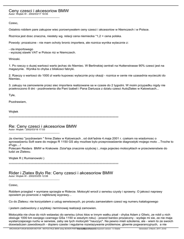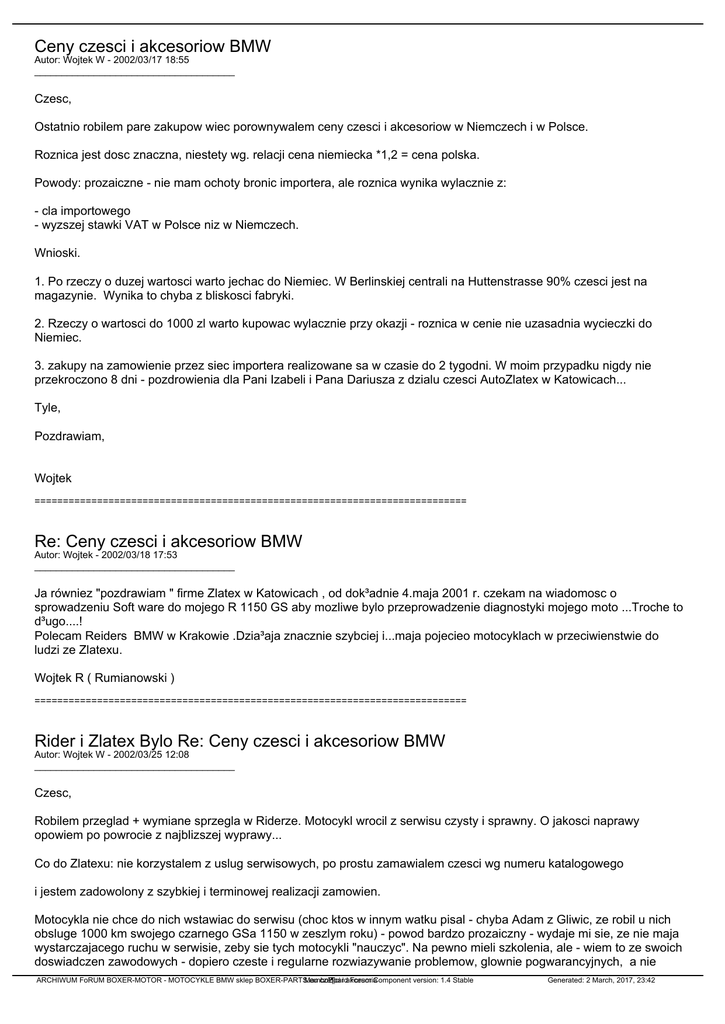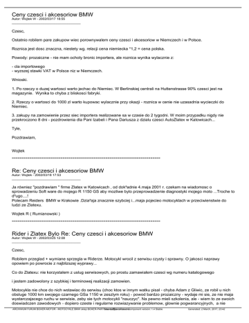 Ceny czesci i akcesoriow BMW Autor: Wojtek W - 2002/03/17 18:55 _____________________________________ Czesc, Ostatnio robilem pare zakupow wiec porownywalem ceny czesci i akcesoriow w Niemczech i w Polsce. Roznica jest dosc znaczna, niestety wg. relacji cena niemiecka *1,2 = cena polska. Powody: prozaiczne - nie mam ochoty bronic importera, ale roznica wynika wylacznie z: - cla importowego - wyzszej stawki VAT w Polsce niz w Niemczech. Wnioski. 1. Po rzeczy o duzej wartosci warto jechac do Niemiec. W Berlinskiej centrali na Huttenstrasse 90% czesci jest na magazynie. Wynika to chyba z bliskosci fabryki. 2. Rzeczy o wartosci do 1000 zl warto kupowac wylacznie przy okazji - roznica w cenie nie uzasadnia wycieczki do Niemiec. 3. zakupy na zamowienie przez siec importera realizowane sa w czasie do 2 tygodni. W moim przypadku nigdy nie przekroczono 8 dni - pozdrowienia dla Pani Izabeli i Pana Dariusza z dzialu czesci AutoZlatex w Katowicach... Tyle, Pozdrawiam, Wojtek ============================================================================ Re: Ceny czesci i akcesoriow BMW Autor: Wojtek - 2002/03/18 17:53 _____________________________________ Ja równiez "pozdrawiam " firme Zlatex w Katowicach , od dok³adnie 4.maja 2001 r. czekam na wiadomosc o sprowadzeniu Soft ware do mojego R 1150 GS aby mozliwe bylo przeprowadzenie diagnostyki mojego moto ...Troche to d³ugo....! Polecam Reiders BMW w Krakowie .Dzia³aja znacznie szybciej i...maja pojecieo motocyklach w przeciwienstwie do ludzi ze Zlatexu. Wojtek R ( Rumianowski ) ============================================================================ Rider i Zlatex Bylo Re: Ceny czesci i akcesoriow BMW Autor: Wojtek W - 2002/03/25 12:08 _____________________________________ Czesc, Robilem przeglad + wymiane sprzegla w Riderze. Motocykl wrocil z serwisu czysty i sprawny. O jakosci naprawy opowiem po powrocie z najblizszej wyprawy... Co do Zlatexu: nie korzystalem z uslug serwisowych, po prostu zamawialem czesci wg numeru katalogowego i jestem zadowolony z szybkiej i terminowej realizacji zamowien. Motocykla nie chce do nich wstawiac do serwisu (choc ktos w innym watku pisal - chyba Adam z Gliwic, ze robil u nich obsluge 1000 km swojego czarnego GSa 1150 w zeszlym roku) - powod bardzo prozaiczny - wydaje mi sie, ze nie maja wystarczajacego ruchu w serwisie, zeby sie tych motocykli "nauczyc". Na pewno mieli szkolenia, ale - wiem to ze swoich doswiadczen zawodowych - dopiero czeste i regularne rozwiazywanie problemow, glownie pogwarancyjnych, a nie ARCHIWUM FoRUM BOXER-MOTOR - MOTOCYKLE BMW sklep BOXER-PARTS.eu MamboBoard czê¶ci i akcesoria Forum Component version: 1.4 Stable Generated: 2 March, 2017, 23:42 realizacja prac prewencyjnych pozwalaja obsludze nabyc wlasciwe obycie w pracy z danym modelem czy grupa modeli... No to bylo na tyle. Pozdrawiam, Wojtek Wróblewski R1100GS Kalahari "¯uczek" - Gliwice ============================================================================ Re: Ceny czesci i akcesoriow BMW Autor: Zbyszek - 2002/03/26 14:04 _____________________________________ Ja robiê zakupy we Wiedniu (mam bli¿ej). Ceny tak¿e s± ciekawe. Nawet serwis BMW jest atrakcyjny. Zbyszek ============================================================================ Re: Ceny czesci i akcesoriow BMW Autor: grzesiek - 2002/03/28 11:50 _____________________________________ Zbyszek , prosze Ciê o kontakt e-mail , jestem zainteresowany zkupem a do Wiednia z Krakowa jest niedaleko ============================================================================ ARCHIWUM FoRUM BOXER-MOTOR - MOTOCYKLE BMW sklep BOXER-PARTS.eu MamboBoard czê¶ci i akcesoria Forum Component version: 1.4 Stable Generated: 2 March, 2017, 23:42