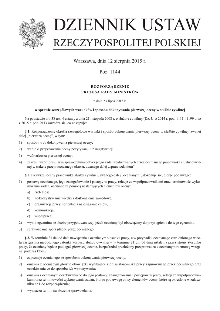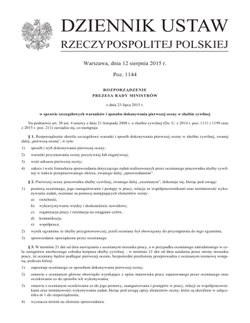 DZIENNIK USTAW RZECZYPOSPOLITEJ POLSKIEJ Warszawa, dnia 12 sierpnia 2015 r. Poz. 1144 ROZPORZĄDZENIE PREZESA RADY MINISTRÓW z dnia 23 lipca 2015 r. w sprawie szczegółowych warunków i sposobu dokonywania pierwszej oceny w służbie cywilnej Na podstawie art. 38 ust. 4 ustawy z dnia 21 listopada 2008 r. o służbie cywilnej (Dz. U. z 2014 r. poz. 1111 i 1199 oraz z 2015 r. poz. 211) zarządza się, co następuje: § 1. Rozporządzenie określa szczegółowe warunki i sposób dokonywania pierwszej oceny w służbie cywilnej, zwanej dalej „pierwszą oceną”, w tym: 1) sposób i tryb dokonywania pierwszej oceny; 2) warunki przyznawania oceny pozytywnej lub negatywnej; 3) wzór arkusza pierwszej oceny; 4) zakres i wzór formularza sprawozdania dotyczącego zadań realizowanych przez ocenianego pracownika służby cywilnej w trakcie przepracowanego okresu, zwanego dalej „sprawozdaniem”. § 2. Pierwszej oceny pracownika służby cywilnej, zwanego dalej „ocenianym”, dokonuje się, biorąc pod uwagę: 1) postawę ocenianego, jego zaangażowanie i postępy w pracy, relacje ze współpracownikami oraz terminowość wykonywania zadań, oceniane za pomocą następujących elementów oceny: a) rzetelność, b) wykorzystywanie wiedzy i doskonalenie zawodowe, c) organizacja pracy i orientacja na osiąganie celów, d) komunikacja, e) współpraca; 2) wynik egzaminu ze służby przygotowawczej, jeżeli oceniany był obowiązany do przystąpienia do tego egzaminu; 3) sprawozdanie sporządzone przez ocenianego. § 3. W terminie 21 dni od dnia nawiązania z ocenianym stosunku pracy, a w przypadku ocenianego zatrudnionego w celu zastępstwa nieobecnego członka korpusu służby cywilnej – w terminie 21 dni od dnia ustalenia przez strony stosunku pracy, że oceniany będzie podlegać pierwszej ocenie, bezpośredni przełożony przeprowadza z ocenianym rozmowę wstępną, podczas której: 1) zapoznaje ocenianego ze sposobem dokonywania pierwszej oceny; 2) omawia z ocenianym główne obowiązki wynikające z opisu stanowiska pracy zajmowanego przez ocenianego oraz oczekiwania co do sposobu ich wykonywania; 3) omawia z ocenianym oczekiwania co do jego postawy, zaangażowania i postępów w pracy, relacji ze współpracownikami oraz terminowości wykonywania zadań, biorąc pod uwagę opisy elementów oceny, które są określone w załączniku nr 1 do rozporządzenia; 4) wyznacza termin na złożenie sprawozdania. Dziennik Ustaw –2– Poz. 1144 § 4. 1. Termin na złożenie sprawozdania, wskazujący datę początkową i końcową wyznaczonego okresu, ustala się w taki sposób, aby przypadał on po upływie 8 miesięcy od dnia nawiązania z ocenianym stosunku pracy i aby dokonanie pierwszej oceny mogło nastąpić w terminie określonym w art. 38 ust. 1 ustawy z dnia 21 listopada 2008 r. o służbie cywilnej, zwanej dalej „ustawą”. 2. Bezpośredni przełożony wpisuje do arkusza pierwszej oceny, zwanego dalej „arkuszem”, informacje o: 1) terminie przeprowadzonej rozmowy wstępnej; 2) terminie wyznaczonym na złożenie sprawozdania; 3) okresie, w którym powinna zostać dokonana pierwsza ocena. 3. Oceniany potwierdza podpisem przeprowadzenie z nim rozmowy wstępnej i zapoznanie się z terminem wyznaczonym na złożenie sprawozdania. 4. Po dokonaniu czynności, o których mowa w ust. 1–3, bezpośredni przełożony przekazuje ocenianemu kopię części I i II arkusza. 5. Wzór arkusza jest określony w załączniku nr 2 do rozporządzenia. § 5. 1. W uzasadnionych przypadkach bezpośredni przełożony wyznacza nowy termin na złożenie sprawozdania w związku z usprawiedliwioną nieobecnością w pracy ocenianego albo wykonywaniem przez niego obowiązków służbowych poza miejscem pracy, przedłużając dotychczasowy termin o okres tej nieobecności albo wykonywania obowiązków służbowych poza miejscem pracy. 2. Bezpośredni przełożony wyznacza nowy termin na złożenie sprawozdania w przypadku przedłużenia okresu trwania umowy o pracę w okolicznościach wskazanych w art. 35 ust. 4 ustawy. 3. Bezpośredni przełożony wyznacza nowy termin na złożenie sprawozdania, o którym mowa w ust. 1 lub 2, w taki sposób, aby dokonanie pierwszej oceny mogło nastąpić nie później niż miesiąc przed zakończeniem stosunku pracy. 4. O wyznaczeniu nowego terminu na złożenie sprawozdania bezpośredni przełożony niezwłocznie zawiadamia pisemnie ocenianego, a kopię pisma dołącza do arkusza. § 6. 1. Sprawozdanie obejmuje przepracowany przez ocenianego okres nie krótszy niż 7 miesięcy. 2. W sprawozdaniu oceniany opisuje: 1) zadania z opisu stanowiska pracy i ewentualnie inne istotne zadania, które wykonywał w trakcie przepracowanego okresu; 2) problemy, z którymi spotkał się przy wykonywaniu zadań, i sposób ich rozwiązania; 3) zdobyte nowe umiejętności i wiedzę; 4) wnioski dotyczące usprawnienia sposobu wykonywania zadań. 3. Wzór formularza sprawozdania jest określony w załączniku nr 3 do rozporządzenia. § 7. Dokonanie pierwszej oceny polega na: 1) przeprowadzeniu z ocenianym rozmowy oceniającej, w zakresie określonym w § 2, podczas której bezpośredni przełożony może omówić także kierunki dalszego rozwoju zawodowego i potrzeby ocenianego; 2) przyznaniu ocen cząstkowych za postawę ocenianego, jego zaangażowanie i postępy w pracy, relacje ze współpracownikami oraz terminowość wykonywania zadań, odpowiednio do poziomu spełniania przez ocenianego każdego z elementów oceny, z uwzględnieniem ich opisów; 3) ustaleniu oceny łącznej, będącej średnią arytmetyczną z ocen cząstkowych, o których mowa w pkt 2; 4) przyznaniu pozytywnej lub negatywnej pierwszej oceny. Dziennik Ustaw –3– Poz. 1144 § 8. 1. Bezpośredni przełożony przeprowadza z ocenianym rozmowę oceniającą niezwłocznie po złożeniu sprawozdania przez ocenianego albo po upływie terminu wyznaczonego na złożenie sprawozdania. 2. W rozmowie może uczestniczyć kieruj