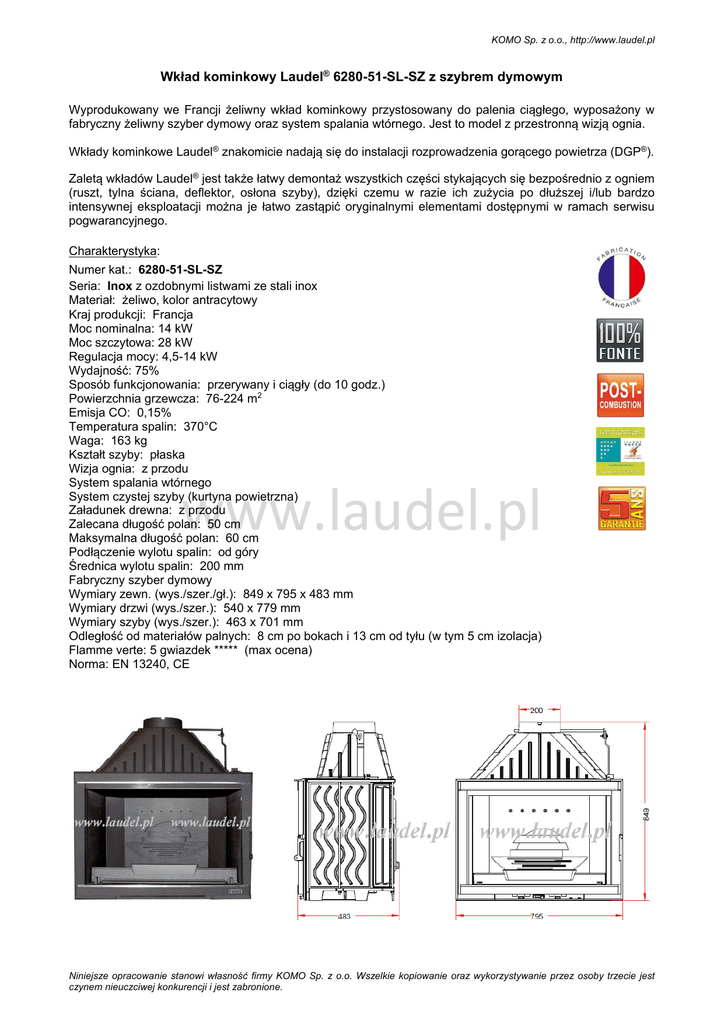 KOMO Sp. z o.o., http://www.laudel.pl Wkład kominkowy Laudel® 6280-51-SL-SZ z szybrem dymowym Wyprodukowany we Francji żeliwny wkład kominkowy przystosowany do palenia ciągłego, wyposażony w fabryczny żeliwny szyber dymowy oraz system spalania wtórnego. Jest to model z przestronną wizją ognia. Wkłady kominkowe Laudel® znakomicie nadają się do instalacji rozprowadzenia gorącego powietrza (DGP®). Zaletą wkładów Laudel® jest także łatwy demontaż wszystkich części stykających się bezpośrednio z ogniem (ruszt, tylna ściana, deflektor, osłona szyby), dzięki czemu w razie ich zużycia po dłuższej i/lub bardzo intensywnej eksploatacji można je łatwo zastąpić oryginalnymi elementami dostępnymi w ramach serwisu pogwarancyjnego. Charakterystyka: Numer kat.: 6280-51-SL-SZ Seria: Inox z ozdobnymi listwami ze stali inox Materiał: żeliwo, kolor antracytowy Kraj produkcji: Francja Moc nominalna: 14 kW Moc szczytowa: 28 kW Regulacja mocy: 4,5-14 kW Wydajność: 75% Sposób funkcjonowania: przerywany i ciągły (do 10 godz.) Powierzchnia grzewcza: 76-224 m2 Emisja CO: 0,15% Temperatura spalin: 370°C Waga: 163 kg Kształt szyby: płaska Wizja ognia: z przodu System spalania wtórnego System czystej szyby (kurtyna powietrzna) Załadunek drewna: z przodu Zalecana długość polan: 50 cm Maksymalna długość polan: 60 cm Podłączenie wylotu spalin: od góry Średnica wylotu spalin: 200 mm Fabryczny szyber dymowy Wymiary zewn. (wys./szer./gł.): 849 x 795 x 483 mm Wymiary drzwi (wys./szer.): 540 x 779 mm Wymiary szyby (wys./szer.): 463 x 701 mm Odległość od materiałów palnych: 8 cm po bokach i 13 cm od tyłu (w tym 5 cm izolacja) Flamme verte: 5 gwiazdek ***** (max ocena) Norma: EN 13240, CE www.laudel.pl Niniejsze opracowanie stanowi własność firmy KOMO Sp. z o.o. Wszelkie kopiowanie oraz wykorzystywanie przez osoby trzecie jest czynem nieuczciwej konkurencji i jest zabronione. KOMO Sp. z o.o., http://www.laudel.pl DEFINICJE: Funkcjonowanie/palenie przerywane i ciągłe: Palenie „przerywane” wymaga dokładania małych ilości drewna co 45 minut. Zaletą tego sposobu palenia jest szczególna wydajność i przyjazność dla środowiska (sprzyjanie ochronie środowiska). Urządzenie umożliwia także działanie "ciągłe", gdy nie możemy spełnić wymogów palenia przerywanego (tj. dokładać drewna, co 45 min) lub pożądana jest mniejsza moc grzewcza. W tym przypadku, pełna moc grzewcza może zostać osiągnięta w ciągu 3 godzin, zaś przy zredukowanej prędkości palenia i małej mocy, palenie przy jednorazowym załadunku może trwać do 10 godzin. Regulacja mocy: Możliwość dostosowania mocy grzewczej do wymogów pomieszczenia. Minimalna moc grzewcza jest osiągana przy zredukowanej prędkości palenia. Moc nominalna: Nominalna moc grzewcza to średnia ilość ciepła wytwarzana po załadowaniu odpowiedniej ilości drewna, przy normalnej (średniej) prędkości palenia. W przypadku palenia przerywanego moc nominalna jest otrzymywana przy ciśnieniu w kominie 12 Pa oraz załadunku 2,5 kg drewna w postaci 2 ½ polan, dokładanych co 45 minut, z przepustnicą prędkości spalania ustawioną w pozycji na wpół otwartej. W przypadku palenia ciągłego załadunek drewna wzrasta do 3 polan o wadze 5-6 kg, dokładanych co ok. 2 godziny. Moc szczytowa: Podczas godzinnych testów laboratoryjnych notowana jest zmienna prędkość spalania drewna. Maksymalna moc grzewcza jest osiągana w ciągu 15 minut, podczas szczytowej aktywności wkładu kominkowego (maksymalna prędkość spalania). www.laudel.pl Powierzchnia grzewcza: To liczba metrów kwadratowych, które można ogrzać za pomocą wkładu kominkowego. Jest ona zależna od lokalizacji domu (ukształtowanie terenu, sąsiedztwo, ekspozycja na wiatr, itp.), współczynnika przenikalności cieplnej ścian, okien i dachu oraz układu pomieszczeń. Podawane wskaźniki dotyczą pomieszczeń o standardowej wysokości 2,5 m. System czystej szyby (kurtyna powietrzna) Strumień powietrza jest kierowany na wewnętrzną stronę szyby kominkowej, co zapobiega osadzaniu się sadzy. Jednakże ważnym warunkiem utrzymania szyby w czystości jest sprawność komina oraz stosowanie suchego drewna (wilgotność poniżej 20%) twardych drzew liściastych. System spalania wtórnego: Polega na wdmuchiwaniu przez tylną część urządzenia dodatkowego świeżego powietrza, które jest wstępnie ogrzewane w przestrzeni pomiędzy żeliwną płytą tylną a ścianą tylną wkładu, po czym kierowane do komory paleniska, w której rozpoczyna się spalanie wtórne węglowodoru i pyłów powstałych w wyniku spalania drewna. Proces ten zapewnia całkowite spalanie, zwiększa wydajność cieplną urządzenia, co z kolei ogranicza zużycie drewna oraz redukuje do minimum emisję zanieczyszczeń do atmosfery. Powietrze wtórne dodatkowo chroni szybę przed dymem oraz odkładaniem się sadzy. SCHEMAT OBUDOWANIA WKŁADU Zgodnie z zaleceniami Producenta zawartymi w instrukcji montażu i użytkowania wkładu i kasety kominkowej oraz wymogami polskiego prawa budowlanego, montaż urządzenia ogrzewczego musi być wykonany przez wykwalifikowany personel. W celu zapewnienia właściwego obiegu powietrza konwekcyjnego, zapobieżenia nagrzewaniu się ścianek stanowiących obudowę kominka oraz zapewnienia właściwego funkcjonowania urządzenia, należy dostosować się do wymagań schematu poniżej, stosując odpowiednie materiały izolacyjne oraz zachowując właściwe odległości obudowy od urządzenia. Niniejsze opracowanie stanowi własność firmy KOMO Sp. z o.o. Wszelkie kopiowanie oraz wykorzystywanie przez osoby trzecie jest czynem nieuczciwej konkurencji i jest zabronione. KOMO Sp. z o.o., http://www.laudel.pl ściany i podłoże kominka beton wełna mineralna o grubości 50mm, przewodnictwo maksimum 0,04 W/m* C z jedną stroną pokrytą aluminium, od strony kominka www.laudel.pl Niniejsze opracowanie stanowi własność firmy KOMO