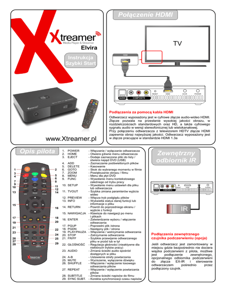 Połączenie HDMI Zewnętrzny odbiornik IR www.Xtreamer.pl Opis