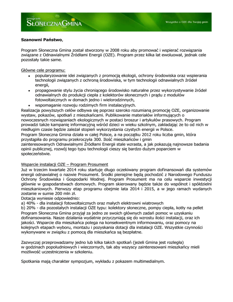 Szanowni Państwo, Program Słoneczna Gmina został stworzony w 2008 roku aby promować i wspierać rozwiązania związane z Odnawialnymi Źródłami Energii (OZE). Program przez kilka lat ewoluował, jednak cele pozostały takie same. Główne cele programu: popularyzowanie idei związanych z promocją ekologii, ochrony środowiska oraz wspierania technologii związanych z ochroną środowiska, w tym technologii odnawialnych źródeł energii, propagowanie stylu życia chroniącego środowisko naturalne przez wykorzystywanie źródeł odnawialnych do produkcji ciepła z kolektorów słonecznych i prądu z modułów fotowoltaicznych w domach jedno i wielorodzinnych, wspomaganie rozwoju rodzimych firm instalacyjnych. Realizacja powyższych celów odbywa się poprzez szeroko rozumianą promocję OZE, organizowanie wystaw, pokazów, spotkań z mieszkańcami. Publikowanie materiałów informujących o nowoczesnych rozwiązaniach ekologicznych w postaci broszur i artykułów prasowych. Program prowadzi także kampanię informacyjną wśród dzieci w wieku szkolnym, zakładając że to od nich w niedługim czasie będzie zależał stopień wykorzystania czystych energii w Polsce. Program Słoneczna Gmina działa w całej Polsce, a na początku 2012 roku liczba gmin, która przystąpiła do programu przekroczyła 300. Ilość mieszkańców i gmin zainteresowanych Odnawialnymi Źródłami Energii stale wzrasta, a jak pokazują najnowsze badania opinii publicznej, rozwój tego typu technologii cieszy się bardzo dużym poparciem w społeczeństwie. Wsparcie instalacji OZE – Program Prosument Już w trzecim kwartale 2014 roku startuje długo oczekiwany program dofinansowań dla systemów energii odnawialnej o nazwie Prosument. Środki pieniężne będą pochodzić z Narodowego Funduszu Ochrony Środowiska i Gospodarki Wodnej. Program Prosument ma na celu wsparcie inwestycji głównie w gospodarstwach domowych. Program skierowany będzie także do wspólnot i spółdzielni mieszkaniowych. Pierwszy etap programu obejmie lata 2014 i 2015, a w jego ramach wydanych zostanie w sumie 200 mln zł. Dotacja wyniesie odpowiednio: a) 40% - dla instalacji fotowoltaicznych oraz małych elektrowni wiatrowych b) 20% - dla pozostałych instalacji OZE typu: kolektory słoneczne, pompy ciepła, kotły na pellet Program Słoneczna Gmina przyjął za jedno ze swoich głównych zadań pomoc w uzyskaniu dofinansowania. Nasze działania wydatnie przyczyniają się do wzrostu ilości instalacji, oraz ich jakości. Wsparcie dla mieszkańca polega na konsekwentnym informowaniu, oraz pomocy na kolejnych etapach wyboru, montażu i pozyskania dotacji dla instalacji OZE. Wszystkie czynności wykonywane w związku z pomocą dla mieszkańca są bezpłatne. Zazwyczaj przeprowadzamy jedno lub kilka takich spotkań (jeżeli Gmina jest rozległa) w godzinach popołudniowych i wieczornych, tak aby wszyscy zainteresowani mieszkańcy mieli możliwość uczestniczenia w szkoleniu. Spotkania mają charakter sympozjum, wykładu z pokazem multimedialnym. Program Słoneczna Gmina oferuję również pomoc zainteresowanym tematem OZE gminom w postaci organizacji punktu konsultacyjnego OZE mieszczącego się w budynku Urzędu Gminy. Zainteresowani mieszkańcy uzyskaniem szczegółowych informacji dotyczących finansowania oraz poznaniem poszczególnych technologii OZE mają możliwość ich uzyskania bezpośrednio w Urzędzie Gminy. Nasz Konsultant będący na miejscu odpowie na wszelkie pytania oraz doradzi i zapropnuję najkorzystniejsze rozwiązania. Szczegóły organizacji punktu konsultacyjnego OZE na terenie gminy ustalamy indywidualnie według zapotrzebowania gminy. Oprócz spotkań o charakterze czysto teoretycznym również organizujemy pokazy OZE przy okazji większych imprez w Gminie (festyny, dożynki itp.). Tutaj proponujemy: 1) Zewnętrzny – na dworze Stawiamy pawilon namiotowy o wymiarach 3m x 3m z zadaszeniem, wewnątrz prezentujemy: - pełnowymiarowy kolektor słoneczny - pełnowymiarowy moduł fotowoltaiczny - prezenter z opisem schematów działania * moduł fotowoltaiczny z odbiornikiem w formie fontanny umieszczonej w wodzie (tutaj władze powinny zorganizować oczko wodne lub większy pojemnik na wodę – najlepiej o głębokości ok. 30 cm i średnicy powyżej 100 cm) lub lampka z żarówką energooszczędną 2) Wewnętrzny - w budynku Prezentujemy: - pełnowymiarowy kolektor słoneczny - pełnowymiarowy moduł fotowoltaiczny - prezenter z opisem schematów działania - podzespoły techniki solarnej (regulator, akumulator, grupy pompowe, sterowniki) Dziękuję za wszelką pomoc i zapraszamy do współpracy.