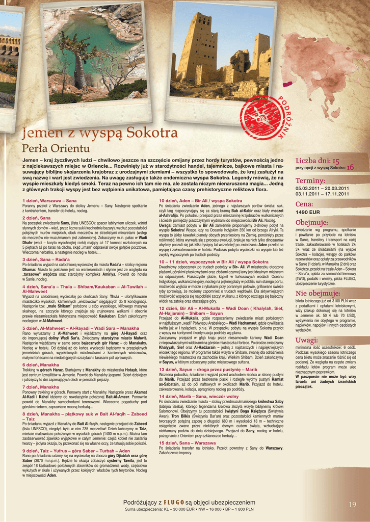 Jemen – kraj J k j życzliwych ż li h ludzi l d i – chwilowo h il jeszcze j na szczęście ś i omijany ij przez hordy h d turystów, t tó ó pewnością ś i jedno j d z najciekawszych miejsc w Oriencie... Rozwinięty już w starożytności handel, tajemnicze, bajkowe miasta i nasuwający biblijne skojarzenia krajobraz z urodzajnymi ziemiami – wszystko to spowodowało, że kraj zasłużył na swą nazwę i wart jest zwiedzenia. Na uwagę zasługuje także endemiczna wyspa Sokotra. Legendy mówią, że na wyspie mieszkały kiedyś smoki. Teraz na pewno ich tam nie ma, ale została niczym nienaruszona magia... Jedną z głównych trakcji wyspy jest bez wątpienia unikatowa, pamiętająca czasy prehistoryczne reliktowa flora. Liczba Li b d dni: i 15 1 dzień, Warszawa – Sana Poranny przelot z Warszawy do stolicy Jemenu – Sany. Następnie spotkanie z kontrahentem, transfer do hotelu, nocleg. Cena: 2 dzień, Sana Na początek zwiedzanie Sany, (lista UNESCO): spacer labiryntem uliczek, wśród słynnych domów – wież, przez liczne suki (wschodnie bazary), wzdłuż pozostałości potężnych murów miejskich, obok meczetów ze strzelistymi minaretami (wstęp do meczetów nie-muzułmanom jest zabroniony). Zobaczymy m.in. pałac w Wadi Dhahr (wadi – koryto wyschniętej rzeki) mający aż 17 komnat rozłożonych na 5 piętrach aż po taras na dachu, skąd „imam” odprawiał swoje gołębie pocztowe. Wieczorna herbatka, a następnie nocleg w hotelu… 3 dzień, Sana – Rada’a Po śniadaniu wyjazd na całodniową wycieczkę do miasta Rada’a – stolicy regionu Dhamar. Miasto to położone jest na wzniesieniach i słynne jest ze względu na „tarasowe” wzgórza oraz starożytny kompleks Amiriya. Powrót do hotelu w Sanie, nocleg. 4 dzień, Sana’a – Thula – Shibam/Kaukaban – Al-Tawilah – Al-Mahweet Wyjazd na całodniową wycieczkę po okolicach Sany: Thula – ufortyfikowane miasteczko wysokich, kamiennych „wieżowców” sięgających do 8 kondygnacji. Następnie tzw. „małe Shibam” położone u stóp wysokiego, klifowego masywu skalnego, na szczycie którego znajduje się zrujnowana walkami i obecnie prawie niezamieszkała historyczna miejscowość Kaukaban. Dzień zakończymy noclegiem w Al-Mahweet. 5 dzień, Al-Mahweet – Al-Rayadi – Wadi Sara – Manakha Rano wyruszamy z Al-Mahweet i wjeżdżamy na górę Al-Rayadi oraz do imponującej doliny Wadi Sar’a. Zwiedzamy starożytne miasto Mahwit. Następnie wjeżdżamy w samo serce bajecznych gór Haraz – do Manakahy. Nocleg w hotelu. Od dzisiaj aż do końca wycieczki będziemy w przepięknych jemeńskich górach, wypełnionych miasteczkami z kamiennych wieżowców, małymi fortecami na niedostępnych szczytach i tarasami pól uprawnych. 6 dzień, Manakha Trekking w górach Haraz. Startujemy z Manakhy do miasteczka Hotayb, które jest centrum Izmailitów w Jemenie. Powrót do Manakhy jeepami. Dzień dzisiejszy i jutrzejszy to dni zapierających dech w piersiach pejzaży. 7 dzień, Manakha Ponowny trekking w górach. Ponowny start z Manakhy. Następnie przez Akamat Al-Kadi i Kahel idziemy do rewelacyjnie położonej Bait-Al-Ameer. Ponownie powrót do Manakhy samochodami terenowymi. Wieczorne pogaduchy pod górskim niebem, zaprawiane mocną herbatą… 8 dzień, Manakha – piątkowy suk w Bait Al-faqih – Zabeed – Taiz Po śniadaniu wyjazd z Manakhy do Bait Al-faqih, następnie przejazd do Zabeed (lista UNESCO), niegdyś było w nim 235 meczetów! Dzień kończymy w Taiz, mieście malowniczo położonym w wysokich górach (1400 m n.p.m.). Można tam zaobserwować zjawisko wyjątkowe w całym Jemenie: część kobiet nie zasłania twarzy – jedyna okazja, by przekonać się na własne oczy, że tatuują sobie policzki. 9 dzień, Taiz – Yufrus – góra Saber – Turbah – Aden Rano po śniadaniu udamy się na wycieczkę na zbocza góry Djiablah oraz górę Saber (3070 m.n.p.m.). Będzie to okazja zobaczyć cysterny Tawila, jest to zespół 18 kaskadowo położonych zbiorników do gromadzenia wody, częściowo wykutych w skale i używanych przez kolejnych władców tych terytoriów. Nocleg w miejscowości Aden. 10 dzień, Aden – Bir Ali / wyspa Sokotra Po śniadaniu zwiedzanie Aden, jednego z najstarszych portów świata: suk, czyli targ rozpoczynający się za starą bramą Bab al-Kabir oraz biały meczet al-Ashrafija. Po południu przejazd przez mieszaninę krajobrazów wulkanicznych i ścieżek pomiędzy piaszczystymi wydmami do miejscowości Bir Ali. Nocleg. Uwaga: zamiast pobytu w Bir Ali zamiennie proponujemy 3-dniowy pobyt na wyspie Sokotra! Wyspa leży na Oceanie Indyjskim 350 km od brzegu Afryki. Ta wyspa to jakby kawałek planety obcych przeniesiony na Ziemię, porośnięty przez roślinność, która wyrwała się z procesu ewolucji, brakuje na nich tylko dinozaurów abyśmy poczuli się jak kilka tysięcy lat wcześniej! po zwiedzaniu Aden przelot na wyspę i zakwaterowanie w hotelu. Podczas pobytu wycieczki na wyspie lub też zwykły wypoczynek po trudach podróży. 10 – 11 dzień, wypoczynek w Bir Ali / wyspa Sokotra Dwudniowy odpoczynek po trudach podróży w Bir– Ali. W miasteczku otoczone plażami, górskimi płaskowyżami oraz złożami czarnej lawy jest idealnym miejscem na odpoczynek. Piaszczyste plaże, kąpiel w turkusowych wodach Oceanu Indyjskiego, wulkaniczne góry, nocleg na pięknej plaży w pobliżu ruin starego portu, możliwość wyjścia w morze z rybakami przy porannym połowie, grillowane świeże ryby sprawiają, że możemy zapomnieć o trudach wędrówki. Dla aktywniejszych możliwość wspięcia się na pobliski szczyt wulkanu, z którego rozciąga się bajeczny widok na zatokę oraz otaczające góry. 12 dzień, Bir Ali – Al-Mukalla – Wadi Doan ( Khalylah, Sief, Al-Hajjarain) – Shibam – Sayun Przejazd do Al-Mukalla, gdzie rozpoczniemy zwiedzanie miast położonych w najdłuższym „wadi” Półwyspu Arabskiego – Wadi Hadramaut, gdzie cywiliz