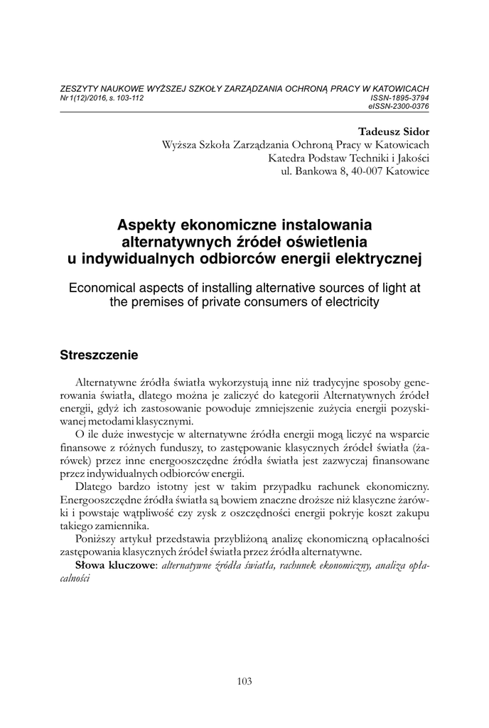 ZESZYTY NAUKOWE WYŻSZEJ SZKOŁY ZARZĄDZANIA OCHRONĄ PRACY W KATOWICACH Nr 1(12)/2016, s. 103-112 ISSN-1895-3794 eISSN-2300-0376 Tadeusz Sidor Wyższa Szkoła Zarządzania Ochroną Pracy w Katowicach Katedra Podstaw Techniki i Jakości ul. Bankowa 8, 40-007 Katowice Aspekty ekonomiczne instalowania alternatywnych źródeł oświetlenia u indywidualnych odbiorców energii elektrycznej Economical aspects of installing alternative sources of light at the premises of private consumers of electricity Streszczenie Alternatywne źródła światła wykorzystują inne niż tradycyjne sposoby generowania światła, dlatego można je zaliczyć do kategorii Alternatywnych źródeł energii, gdyż ich zastosowanie powoduje zmniejszenie zużycia energii pozyskiwanej metodami klasycznymi. O ile duże inwestycje w alternatywne źródła energii mogą liczyć na wsparcie finansowe z różnych funduszy, to zastępowanie klasycznych źródeł światła (żarówek) przez inne energooszczędne źródła światła jest zazwyczaj finansowane przez indywidualnych odbiorców energii. Dlatego bardzo istotny jest w takim przypadku rachunek ekonomiczny. Energooszczędne źródła światła są bowiem znaczne droższe niż klasyczne żarówki i powstaje wątpliwość czy zysk z oszczędności energii pokryje koszt zakupu takiego zamiennika. Poniższy artykuł przedstawia przybliżoną analizę ekonomiczną opłacalności zastępowania klasycznych źródeł światła przez źródła alternatywne. Słowa kluczowe: alternatywne źródła światła, rachunek ekonomiczny, analiza opłacalności 103 Tadeusz Sidor Abstract Alternative light sources employ other than traditional means of generating light, therefore they can be treated as alternative energy sources, as using them leads to saving energy generated by classical methods. Inasmuch large projects of alternative energy sources usually can count on some financial subsidiary from various funds, but substituting classical light sources by other energy saving devices is usually financed by individuals. Therefore the economics aspects are very important in this case. Energy saving sources of light are much more expensive than classical bulbs and it might be doubtful whether energy saving would balance the cost of investment. The paper presents the approximate analysis of economic aspects of substituting classical bulbs by alternative light sources. Keywords: alternative light sources, economical analysis 1. Wprowadzenie Alternatywne źródła oświetlenia można zaliczyć do kategorii Alternatywnych źródeł energii. Niezależnie od tego jaką interpretację terminu „alternatywne źródła energii” przyjmuje się, istota zastosowania takich źródeł polega na ich wykorzystaniu w celu zmniejszenia zużycia energii pozyskiwanej metodami klasycznymi. Źródła energii takie jak: energia wiatru, energia geotermalna, energia promieniowania słonecznego są powszechnie dostępne, ale gęstość energii, którą można z nich pozyskać jest niewielka, co wiąże się z bardzo niską mocą takich źródeł. Dlatego żeby uzyskać technicznie przydatne źródła energii, o dużej mocy, niezbędna jest wstępna koncentracja gęstości energii. Nie ma jednej powszechnie obowiązującej definicji „alternatywnych źródeł energii”. Niektórzy rozumieją pod tą nazwą źródła energii inne niż tradycyjne. W zależności od rodzaju finalnej postaci energii pojęcie „tradycyjnych źródeł energii” może obejmować np. biomasę, węgiel, gaz, ropę naftową, ale także elektrownie cieplne opalane węglem lub gazem, duże elektrownie wodne i elektrownie jądrowe. Niekiedy pojęcie „alternatywnych źródeł energii” zawęża się jedynie do źródeł odnawialnych. Stojąc na gruncie I zasady termodynamiki, z której wynika, że energia nie może powstać z niczego istnieją w zasadzie tylko dwa sposoby aby ten cel osiągnąć. Można albo sięgnąć do istniejących darmowych, a niewykorzystywanych, źródeł energii, lub alternatywnie opracować nowe, oszczędne technologie zużycia energii. Buduje się zatem koncentratory darmowej energii w postaci wirników turbin wiatrowych o dużym promieniu, kolektorów promieniowania słonecznego i wymienników ciepła geotermalnego o dużej powierzchni. Generalnie inwestycje takie są bardzo kosztowne i są zwykle subsydiowane. Do tego typu inwestycji w pełni 104 Aspekty ekonomiczne instalowania alternatywnych źródeł oświetlenia u indywidualnych odbiorców energii... odnosi się nazwa „alternatywne źródła energii” i istnieje bogata literatura opisująca różne typy urządzeń wraz z analizą ich opłacalności. Ponieważ inne urządzenia, które „tylko” optymalizują zużycie energii w istocie spełniają podobną funkcję, można je zatem potraktować jako alternatywne źródła alternatywnej energii. Co prawda nie pozyskują energii z innych źródeł, ale zmniejszają zużycie energii produkowanej metodami klasycznymi. Jest wiele urządzeń tego typu. Są to np. współcześnie produkowane silniki spalinowe, sprzęt AGD, nowoczesne piece z fluidalnymi paleniskami i inne. Wspólną cechą takich urządzeń jest to, że wykorzystują klasyczne paliwa – źródła energii, ale w sposób oszczędny. Nieco inny charakter mają współczesne źródła światła, które również można do takich urządzeń zaliczyć, gdyż wykorzystują zupełnie inną, energooszczędną technologię do wytwarzania światła podobnego do wytwarzanego przez klasyczne żarówki. Jakość źródeł światła charakteryzuje się za pomocą wielkości nazywanej „skutecznością świetlną” (light efficacy), która jest miarą sprawności z jaką źródło wytwarza światło widzialne z energii elektrycznej. Jednostką skuteczności świetlnej jest lumen/wat [lm/W] tj. stosunek strumienia światła wytwarzanego przez źródło do pobranej z sieci mocy elektrycznej. Wielkość ta różni się od tradycyjnie rozumianej sprawnoś