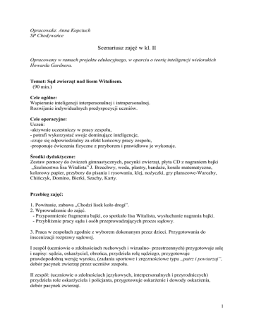 Opracowała: Anna Kopciuch SP Chodywańce Scenariusz zajęć w kl. II Opracowany w ramach projektu edukacyjnego, w oparciu o teorię inteligencji wielorakich Howarda Gardnera. Temat: Sąd zwierząt nad lisem Witalisem. (90 min.) Cele ogólne: Wspieranie inteligencji interpersonalnej i intrapersonalnej. Rozwijanie indywidualnych predyspozycji uczniów. Cele operacyjne: Uczeń: -aktywnie uczestniczy w pracy zespołu, - potrafi wykorzystać swoje dominujące inteligencje, -czuje się odpowiedzialny za efekt końcowy pracy zespołu, -proponuje ćwiczenia fizyczne z przyborem i prawidłowo je wykonuje. Środki dydaktyczne: Zestaw pomocy do ćwiczeń gimnastycznych, pacynki zwierząt, płyta CD z nagraniem bajki „Szelmostwa lisa Witalista” J. Brzechwy, woda, plastry, bandaże, korale matematyczne, kolorowy papier, przybory do pisania i rysowania, klej, nożyczki, gry planszowe-Warcaby, Chińczyk, Domino, Bierki, Szachy, Karty. Przebieg zajęć: 1. Powitanie, zabawa „Chodzi lisek koło drogi”. 2. Wprowadzenie do zajęć. - Przypomnienie fragmentu bajki, co spotkało lisa Witalista, wysłuchanie nagrania bajki. - Przybliżenie pracy sądu i osób przeprowadzających proces sądowy. 3. Praca w zespołach zgodnie z wyborem dokonanym przez dzieci. Przygotowania do inscenizacji rozprawy sądowej. I zespół (uczniowie o zdolnościach ruchowych i wizualno- przestrzennych) przygotowuje salę i napisy: sędzia, oskarżyciel, obrońca, przydziela rolę sędziego, przygotowuje prawdopodobną wersję wyroku, (zadania sportowe i zręcznościowe typu „patrz i powtarzaj”, dobór pacynek zwierząt przez uczniów zespołu. II zespół: (uczniowie o zdolnościach językowych, interpersonalnych i przyrodniczych) przydziela role oskarżyciela i policjanta, przygotowuje oskarżenie i dowody oskarżenia, dobór pacynek zwierząt. 1 III zespół: (uczniowie o zdolnościach językowych i interpersonalnych) przydziela role obrońcy i oskarżonego, przygotowuje obronę i dowody niewinności, dobór pacynek zwierząt. IV zespół: (uczniowie o zdolnościach matematyczno- logicznych) świadkowie oskarżenia i obrony, przygotowuje zadania matematyczne lub działania w oparciu o niecne uczynki Witalista, dobór pacynek zwierząt. 4. Przebieg procesu, przesłuchanie świadków i oskarżonego, ogłoszenie wyroku. 5. Wspólna zabawa. Wykonanie wyroku, zadania sprawnościowe i zręcznościowe („patrz i powtarzaj”). 6. Podsumowanie zajęć, ocena nauczyciela pochwała, dzielenie się wrażeniami. Wypowiedzi uczniów, co sprawiło im trudność w czasie zajęć. 7. Zabawy dowolne, np. gry planszowe: Domino, Chińczyk, Warcaby, Bierki, Szachy, Karty. 2