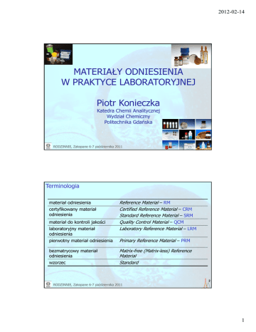 2012-02-14 MATERIAŁY ODNIESIENIA W PRAKTYCE LABORATORYJNEJ Piotr Konieczka Katedra Chemii Analitycznej Wydział Chemiczny Politechnika Gdańska 1 RODZINNIE, Zakopane 6-7 października 2011 Terminologia materiał odniesienia certyfikowany materiał odniesienia materiał do kontroli jakości laboratoryjny materiał odniesienia Reference Material – RM Certified Reference Material – CRM Standard Reference Material – SRM Quality Control Material – QCM Laboratory Reference Material – LRM pierwotny materiał odniesienia Primary Reference Material – PRM y y materiał bezmatrycowy odniesienia Matrix-free ((Matrix-less)) Reference Material Standard wzorzec 2 RODZINNIE, Zakopane 6-7 października 2011 1 2012-02-14 Organizacje i instytucje Institute for Reference Materials and Measurements (EC JRC) NIST National Institute of Standards and Technology (USA) Instytut Chemii i Techniki Jądrowej IChTJ ISO REMCO International Standard Organization - Committee on Reference Materials IRMM GUM BCR VIM EURACHEM ASTM Guide to the Expression of Uncertainty in Measurement Bureau Communautaire de Reference International Vocabulary of Basic and General Terms in Metrology Network of Analytical Chemistry Organisations in Europe American Society for Testing and Materials (USA) 3 RODZINNIE, Zakopane 6-7 października 2011 Materiał odniesienia (ang. Reference Material - RM) wg definicji ISO, to materiał lub substancja, dla których uznano wartości jednej lub większej liczby właściwości za dostatecznie jednorodne i na tyle dobrze określone, żeby można było je stosować do kalibracji przyrządu, sprawdzania procedury pomiarowej lub oznaczania wybranych własności. własności Materiał odniesienia może być substancją czystą lub mieszaniną, występować pod postacią gazu, cieczy lub ciała stałego. 4 RODZINNIE, Zakopane 6-7 października 2011 2 2012-02-14 Certyfikowany materiał odniesienia (ang. Certified Reference Materiał - CRM), to materiał odniesienia opatrzony certyfikatem, dla którego każdej wartości przypisana jest niepewność na określonym poziomie ufności. 5 RODZINNIE, Zakopane 6-7 października 2011 Laboratoryjny materiał odniesienia (ang. laboratory reference material - LRM) – tzw. roboczy materiał odniesienia lub materiał stosowany do kontroli jakości przygotowany przez jednostki akredytowane. akredytowane Wartości odniesienia ustalane są w wyniku badań przeprowadzonych za pomocą, co najmniej jednej procedury analitycznej, która została poddana procesowi walidacji. Materiał taki opatrzony jest w opis sposobu osiągania spójności pomiarowej oraz wartość t ść oszacowanejj niepewności i ś i pomiarowej. i j Przygotowywany jest głównie do stosowania w badaniach międzylaboratoryjnych i w wewnętrznej kontroli jakości. 6 RODZINNIE, Zakopane 6-7 października 2011 3 2012-02-14 materiał odniesienia (ang. matrix reference material) – materiał charakteryzujący się zazwyczaj niskim poziomem zawartości analitów. Stosowany jest głównie do testowania i walidacji procedur analitycznych oraz kalibracji przyrządów pomiarowych. Wśród matrycowych materiałów odniesienia wyróżnić można: pierwotne materiały odniesienia, odniesienia materiały do kontroli jakości, laboratoryjne materiały odniesienia oraz wtórne materiały odniesienia. Matrycowy 7 RODZINNIE, Zakopane 6-7 października 2011 Bezmatrycowy materiał odniesienia (ang. matrixfree reference material) – materiał odniesienia, którego skład matrycy nie wpływa na wynik oznaczenia. Materiały te stosowane są do kalibracji przyrządów analitycznych. Można wśród nich wyróżnić czyste substancje i roztwory wzorcowe. 8 RODZINNIE, Zakopane 6-7 października 2011 4 2012-02-14 Podział materiałów odniesienia MATERIAŁY ODNIESIENIA CERTYFIKOWANE NIECERTYFIKOWANE MATRYCOWE Pierwotne materiały odniesienia - PRMs - materiały do kontroli jakości - QCMs - laboratoryjne materiały odniesienia – LRMs - wtórne materiały odniesienia - SecRMs BEZMATRYCOWE - substancje czyste - roztwory wzorcowe 9 RODZINNIE, Zakopane 6-7 października 2011 Klasyfikacja materiałów odniesienia Lp. 1. Parametr klasyfikujący Właściwości Dodatkowe wyjaśnienia - skład chemiczny Materiały odniesienia będące zarówno czystymi chemicznymi związkami lub reprezentatywnymi próbkami matrycowymi, rzeczywistymi lub z dodatkiem analitu analitu, charakteryzujące się jedną lub wieloma właściwościami chemicznymi lub fizykochemicznymi. - właściwości biologiczne i kliniczne Materiały charakteryzujące się jedną lub wieloma właściwościami biochemicznymi lub klinicznymi. - właściwości fizyczne Materiały charakteryzujące się jedną lub wieloma właściwościami fizycznymi np. temperatura topnienia, lepkość, gęstość. - właściwości techniczne Materiały charakteryzujące się jedną lub wieloma właściwościami technicznymi np. twardość, wytrzymałość. - różnorodne 10 RODZINNIE, Zakopane 6-7 października 2011 5 2012-02-14 Klasyfikacja materiałów odniesienia cd. Lp. 2. Parametr klasyfikujący Skład chemiczny - czyste substancje (wykorzystywane np. do identyfikacji) Dodatkowe wyjaśnienia Materiały wysokiej czystości czysty składnik (izotop, pierwiastek lub związek chemiczny), w którym suma zanieczyszczeń nie przekracza 10 µmol/mol Materiały o określonej czystości jak powyżej, przy czym suma zanieczyszczeń nie przekracza 50 µmol/mol Materiały pierwszego rzędu jak powyżej, przy czym suma zanieczyszczeń nie przekracza 100 µmol/mol - roztwory Kalibracja oraz stosowanie procedur analitycznych na etapie ich modyfikacji - metodycznie dedykowane materiały Wartości są określone dla stosowanej metody wykonywanej wg ściśle określonego przepisu analitycznego - materiały o znanym składzie matrycy Kalibracja metod porównawczych 11 RODZINNIE, Zakopane 6-7 października 2011 Klasyfikacja materiałów odniesienia cd. Lp. 2. cd. Parametr klasyfikujący Skład chemiczny