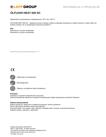 INFORMACJA O PRODUKCIE ÖLFLEX® HEAT 650 SC Odpowiedni do stosowania w temperaturach -50°C do +700°C ÖLFLEX® HEAT 650 SC – pojedyncza żyła w izolacji z włókna szklanego stosowana w wielkich piecach, hutach szkła, do budowy silników, itd. w temperaturze otoczenia do 650°C Info Stosowany w suchym środowisku Stosowany w suchym środowisku Odporność na temperaturę Bezhalogenowe Odporny na działanie niskich temperatur Korzyści Instalacje w wysokich temperaturach otoczenia Dobra przewodność właściwa w wysokich temperaturach dzięki zastosowaniu drucików niklowych Zakres zastosowania Moduły grzewcze, elektryczne urządzenia grzewcze, komory grzewcze Piece, ogrzewanie strefowe, piece akumulacyjne Przemysł ciężki, huty żelaza i stali, odlewnie, obróbka szkła i ceramiki, przemysł chemiczny Budowa maszyn, aparatury i elektrowni Ostania aktualizacja (02.03.2017) ©2017 Lapp Group - all rights reserved. Zarządzanie produktem http://lapppoland.lappgroup.com Aktualne dane w pliku Dane techniczne. PN 0456 / 02_03.16 INFORMACJA O PRODUKCIE ÖLFLEX® HEAT 650 SC Cechy produktu Niepodtrzymywanie płomieni Bezhalogenowe Przystosowany do użytkowania wyłącznie w warunkach suchych ÖLFLEX® HEAT 650 SC jest zalecany dla krótkotrwałych temperatur szczytowych ponad 700°C Budowa produktu Linka z cienkich drucików z niklu Izolacja żyły z obwoju z włókna szklanego i impregnowanego oplotu z włókna szklanego Dane techniczne Klasyfikacja: ETIM 5.0 Class-ID: EC000993 Opis klasy ETIM 5.0: Przewód z żyłą pojedynczą Budowa żyły: Żyła cienkodrutowa Patrz specyfikacja techniczna Minimalny promień gięcia: Połączenie nieruchome: 5 x średnica zewnętrzna Napięcie nominalne: U 0 /U: 300/500 V Napięcie próbne: 1800 V Zakres temperatury: Połączenia sporadycznie ruchome: -50°C do +650°C Połączenia nieruchome: -50°C to +700°C Wskazówka Wszystkie podane wartości dotyczące produktów są wartościami nominalnymi (o ile nie wskazano inaczej). Inne wartości, takie jak np. tolerancje mogą być przedstawione na zamówienie (jeżeli są dostępne i przeznaczone do publikacji). Standardowe odcinki proszę sprawdzić na: www.lapppolska.pl Rodzaj opakowania: Krążek ≤ 30 kg, w innym przypadku bęben Prosimy określić wielkość opakowania (np. 1 x 500 m bęben lub 5 x 100 m krążek) Fotografie nie mogą być używane do wymiarowania oraz nie stanowią szczegółowego odwzorowania przedstawionych produktów. * Podane ceny to ceny netto bez podatku VAT i dodatkowych opłat. Sprzedaż klientom biznesowym. Ostania aktualizacja (02.03.2017) ©2017 Lapp Group - all rights reserved. Zarządzanie produktem http://lapppoland.lappgroup.com Aktualne dane w pliku Dane techniczne. PN 0456 / 02_03.16 Powered by TCPDF (www.tcpdf.org) Przekrój żyły [mm²] Średnica zewnętrzna [mm] Indeks niklu (kg/km) Waga [kg/km] 1232650 0,5 2,4 4,8 13 1232651 0,75 2,5 7,6 15 1232652 1 2,7 9,7 17 1232653 1,5 3 14,8 23 1232654 2,5 3,5 23,5 34 1232655 4 3,9 38,6 54 1232656 6 4,6 57,9 84 1232657 10 6,8 96,5 120 1232658 16 7,5 152 199 1232659 25 9 236,4 300 1232660 35 10,4 332,8 399 1232661 50 12,7 481,1 540 ÖLFLEX® HEAT 650 SC Ostania aktualizacja (02.03.2017) ©2017 Lapp Group - all rights reserved. Zarządzanie produktem http://lapppoland.lappgroup.com Aktualne dane w pliku Dane techniczne. PN 0456 / 02_03.16 INFORMACJA O PRODUKCIE Powered by TCPDF (www.tcpdf.org) Numer katalogowy