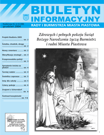 Kadencja IV, nr 6 (30) grudzień 2004 Projekt Budżetu 2005 ...................................... str. 2 Ścieżka, chodnik, droga ...................................... str. 2 Zdrowych i pełnych pokoju Świąt Bożego Narodzenia życzą Burmistrz i radni Miasta Piastowa Nowy cmentarz .......... str. 2 Weryfikacja strategii .. str. 3 Przeprowadzka policji ...................................... str. 3 Sprzątanie świata za płotem ......................... str. 4 Turniej rodzin ............. str. 4 Świetlica zaprasza ..... str. 5 Imię dla szkoły ............ str. 5 Cztery pokoje ............. str. 6 Znajomi z Schorndorf ..................................... str. 6 Festiwal koszykówki ................................... str. 7-8 Zapraszamy na tradycjyny pokaz sztucznych ogni, w wieczór sylwestrowy na plac przy OSP około północy 1 BIULETYN INFORMACYJNY grudzień 2004 Projekt budżetu 2005 Zwiększenie środków na inwestycje oraz zamrożenie wszystkich wydatków jednostek organizacyjnych miasta z wyjątkiem instytucji oświatowych — to niektóre punkty projektu budżetu miasta na 2005 rok, przedstawionego Radzie Miejskiej przez Burmistrza Zdzisława Brzezińskiego. Na papierze dochody gminy wzrosną aż o 11% w stosunku do roku 2004. Ministerstwo Finansów obiecuje m.in. o 800 tys. zł więcej z tytułu udziału w podatku dochodowym od osób fizycznych (PIT). Wzrosną też nakłady z budżetu państwa na Miejski Ośrodek Pomocy Społecznej, ponieważ od tego roku właśnie MOPS wypłaca świadczenia rodzinne. Wydatki Piastowa mają sięgnąć 39 mln zł, a deficyt ma wynieść ok. 3,8 mln. Ta kwota na pewno zmniejszy się, jeśli do budżetu wpłyną pieniądze z funduszy unijnych. Większość środków pożyczonych w bankach i funduszach gmina przeznaczy na inwestycje — w sumie wydatki na nie wzrosną o ponad połowę w porównaniu z rokiem bieżącym i przekroczą 5 mln zł. Piastów wciąż ma przed sobą bardzo kosztowną budowę oczyszczalni ścieków deszczowych oraz realizację systemu informatyzacji miasta. Oba projekty znajdują się na liście oczekujących na dofinansowanie ze środków strukturalnych Unii Europejskiej. Ponadto w 2005 r. powstaną nowe wodociągi, m.in. w ul. Godebskiego (od ul. 11 listopada do ul. Dworcowej), ul. Dworcowej (od 11 listopada do Norwida) oraz ul. Daniłowskiego. Na nową nawierzchnię mogą liczyć mieszkańcy ul. Godebskiego, Wieniawskiego i Prądzyńskiego. Niewyklu- Ścieżka, chodnik, droga Wygląda na to, że w przyszłym roku nieco szerszym strumieniem popłyną pieniądze na drogi powiatowe, które biegną przez Piastów. Rada Miejska jednogłośnie upoważniła Burmistrza do zawarcia porozumienia ze starostą powiatu pruszkowskiego w sprawie przebudowy al. Tysiąclecia, między ul. Orzeszkową a granicą terenów TESCO. W budżecie powiatu mają znaleźć się pieniądze na wykonanie odwodnienia i remont nawierzchni, która na tym krótkim odcinku jest nierówna, pełna dziur lub pospiesznie wykonywanych łat. Piastów wyłoży środki m.in. na budowę chodnika wzdłuż ulicy — w tej chwili jest tam wydeptana ścieżka, a być może będzie ścieżka…rowerowa. Najprawdopodobniej uda się pozyskać środki na remont innej ważnej drogi powiatowej — ul. Dworcowej. Pod koniec przyszłego roku, już po zakończeniu prac przy budowie wodociągu, na odcinku od ul. Sienkiewicza do dworca PKP ma zostać położona nowa nawierzchnia. n 2 czone, że w przyszłorocznym budżecie powiatu, który zarządza częścią głównych ulic miasta, znajdą się pieniądze na położenie nowej nakładki asfaltowej na ul. Dworcowej oraz na remont al. Tysiąclecia, na odcinku od ul. Orzeszkowej do granicy terenów TESCO. Piastów dopłaciłby ok. 150 tys. zł na odwodnienie i wybudowanie chodnika oraz ścieżki rowerowej na tym odcinku. W przyszłym roku rozpocznie się budowa wielofunkcyjnego boiska sportowego przy Szkole Podstawowej Nr 1. Odpowiedni wniosek zostanie złożony w Ministerstwie Edukacji Narodowej i Sportu, które może pokryć 1/3 kosztów inwestycji zaplanowanej na ok. 650 tys. zł. Bez zmian pozostaje struktura budżetu miasta — połowę pieniędzy pochłania utrzymanie oświaty. W przyszłym roku będzie to prawie 17 mln zł. Burmistrz wraz z dyrektorami szkół i komisjami Rady Miejskiej poszukują możliwości ograniczenia wydatków oświatowych, ale niektóre obowiązki, np. dotyczące podwyżek płac dla nauczycieli, są nałożone na samorząd przez ustawę. Tymczasem subwencja Ministerstwa Finansów od lat nie wystarcza i musi być uzupełniana ze środków własnych gminy. Przewodniczący Rady Miejskiej Grzegorz Szuplewski przypomniał, że uczestnicy XVII Ogólnopolskiej Konferencji Wójtów, Burmistrzów, Prezydentów, Starostów i Marszałków, która odbyła się w Warszawie w dniach 7–8 października 2004 r. ostro zaprotestowali przeciwko prowadzeniu takiej polityki wobec samorządów i domagali się zwiększenia nakładów budżetowych na szkoły i przedszkola. n Nowy cmentarz Na terenie Pruszkowa-Gąsina funkcjonuje już nowy cmentarz. Kilkudziesięciohektarowy obszar należy do parafii pruszkowskich, ale będzie także wykorzystywany przez Piastów. W ten sposób zostanie rozwiązany problem braku miejsc pochówku - powoli, ale nieubłaganie zbliża się moment, kiedy skończą się miejsca na nowe groby w „piastowskiej” części cmentarza na Żbikowie. BIULETYN INFORMACYJNY grudzień 2004 Przeprowadzka policji Piastowscy policjanci przenoszą się do nowej siedziby. Od 1 stycznia 2005 r. miejski komisariat będzie mieścił się w budynku dawnego internatu, na rogu ulic ks. J. Popiełuszki i Orzeszkowej. Niebawem rozpocznie się remont budynku, w którym docelowo mają znaleźć się niektóre wydziały Komendy Powiatowej, m.in. kryminalny i prewencja. Numer telefonu na razie pozostaje bez zmian 723 64 47. Weryfikacja strategii Przed dwoma laty Rada Miejska uchwaliła „Strategię rozwoju Piastowa 2